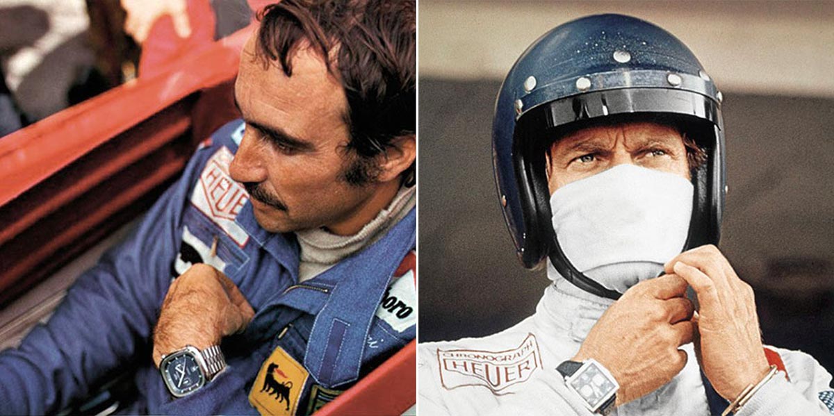 Ở bên trái, người lái xe Ferrari Clay Regazzoni đeo biểu tượng của thương hiệu trên bộ đồ lái xe và chiếc đồng hồ Heuer Silverstone trên cổ tay. Ở bên phải, siêu sao Steve McQueen đeo đồng hồ chronograph ‘Monaco’ trong quá trình thực hiện bộ phim Le Mans năm 1970.