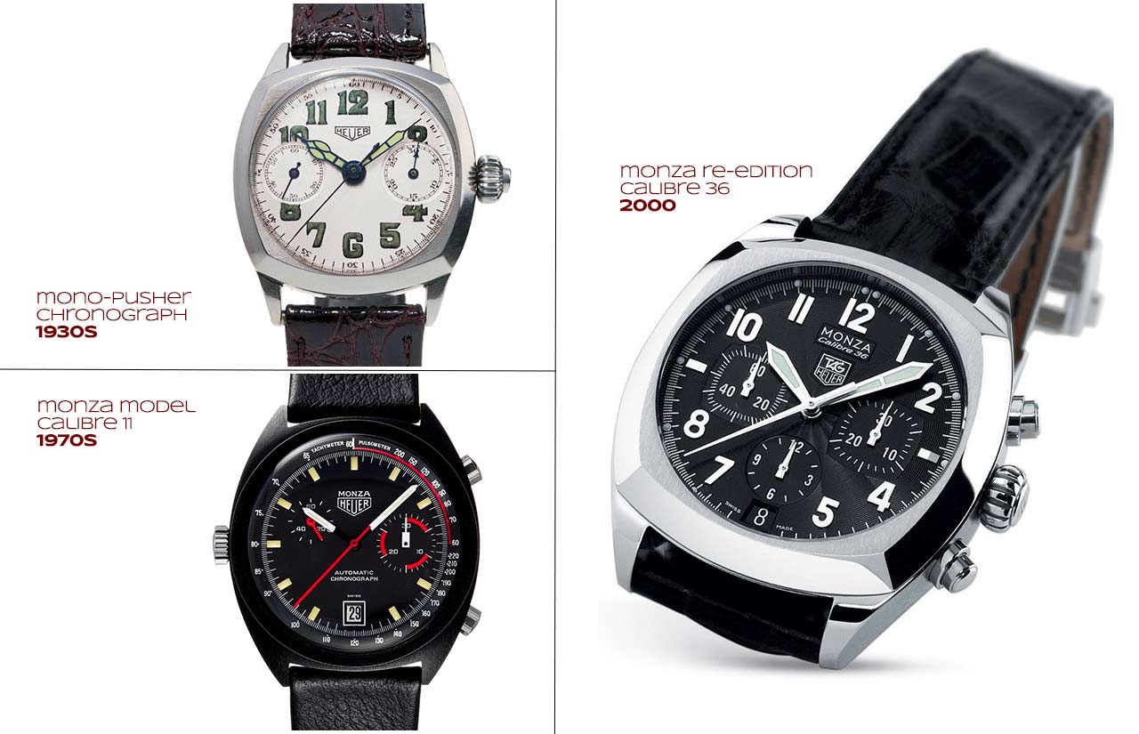 Vào năm 2000, TAG Heuer đã giới thiệu một mô hình tái bản mới, Monza. Chiếc đồng hồ này có nguồn cảm hứng kép, kết hợp một số yếu tố của Monza những năm 1970 và những yếu tố khác của chiếc đồng hồ bấm giờ đơn đẩy của những năm 1930 mà chúng tôi đã giới thiệu trước đó trong bài viết này. Nhiều phiên bản mô hình khác nhau đã được tạo ra, danh giá nhất là Monza Calibre 36 Chronograph, một phiên bản đặc biệt được trang bị bộ chuyển động tự động El Primero được chứng nhận COSC.