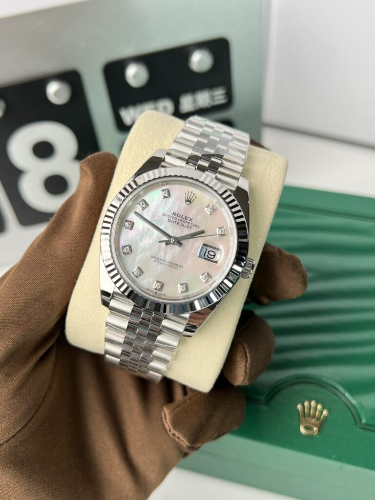Đồng hồ Rolex Datejust mới này của Clean factory là mẫu 41mm có mặt số MOP, đây là một chiếc đồng hồ rất đẹp nhưng có phần mềm mại, nữ tính. Tuy nhiên nếu bạn muốn mua một món quà cho bạn vợ hoặc bạn gái, Rolex Datejust 41mm có vẻ hơi lớn đối với hầu hết phụ nữ, mặc dù là đồng hồ rep 11, các mẫu đồng hồ nữ khác nhỏ hơn 36mm thương có chất lượng không cao.