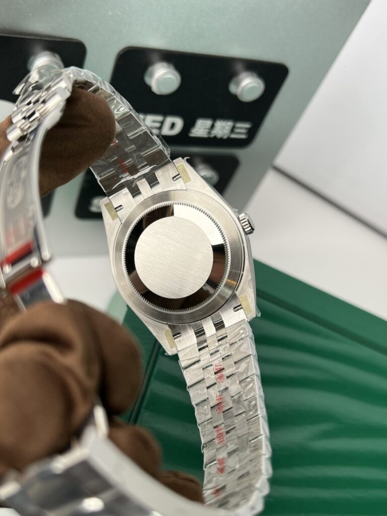 Điều thú vị là Clean đã thay đổi nhãn dán bằng một ký tự mới trên vỏ sau. Đồng hồ có dây đeo Jubilee với các mắt xích được chải và đánh bóng hoàn hảo, giống như đồng hồ chính hãng.