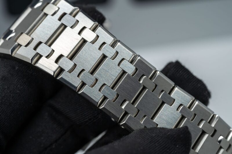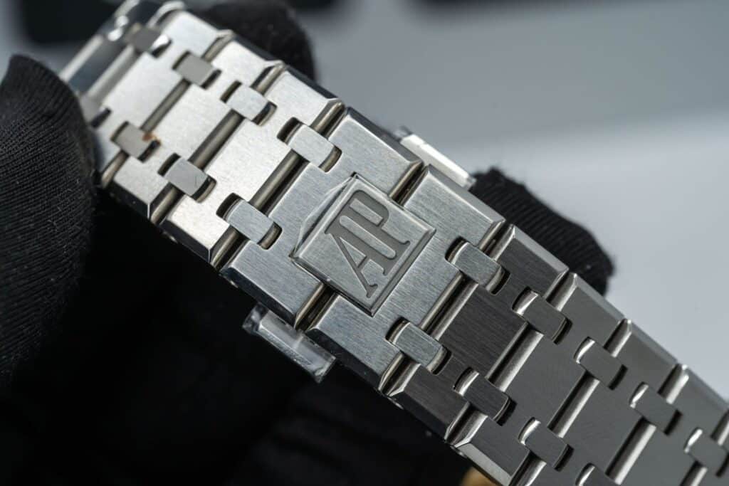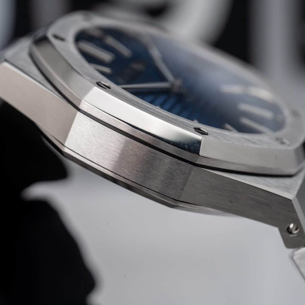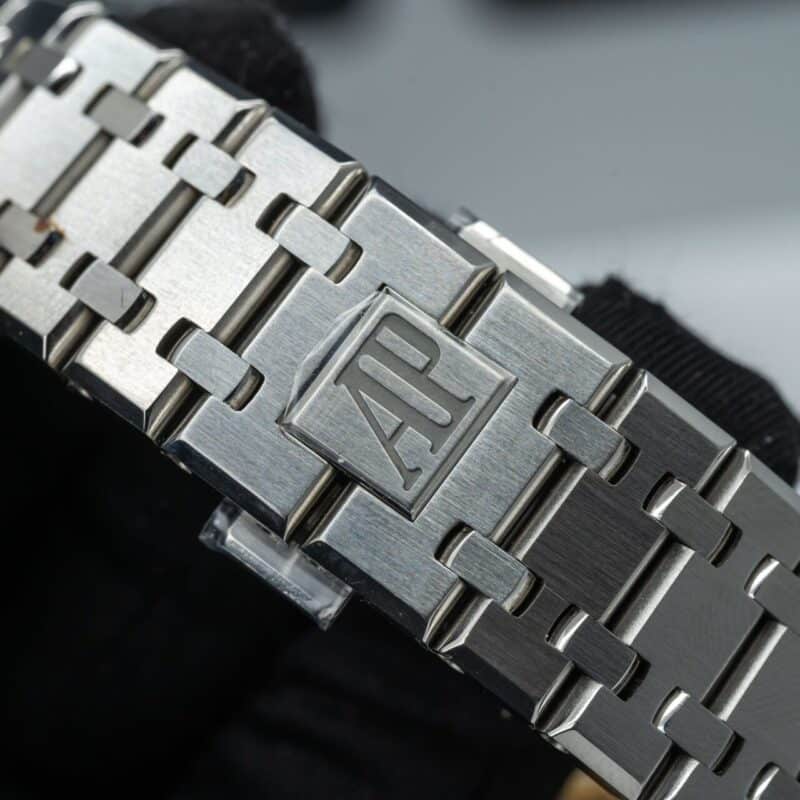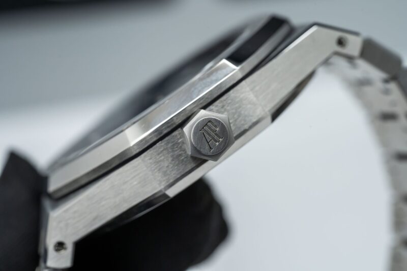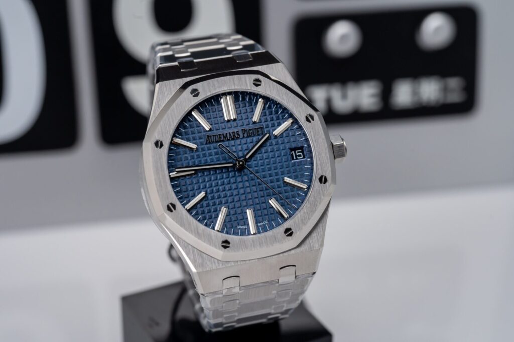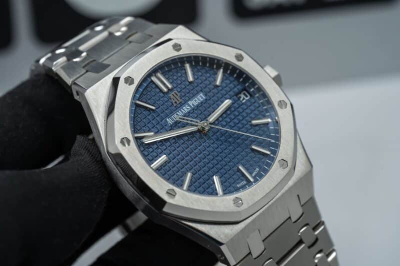 Audemars Piguet Royal Oak là một trong những dòng đồng hồ hàng đầu của thế giới, đặc biệt là phiên bản kỷ niệm 50 năm với mặt số xanh lam sẽ làm cho mọi người không thể rời mắt. Đồng hồ có đường kính 41mm, mặt kính sapphire nguyên khối đem đến sự trong suốt và khả năng đọc cho chiếc đồng hồ. Vỏ và dây đeo được làm bằng thép không gỉ 316L cũng tạo nên sức mạnh và sự bền bỉ cho chiếc đồng hồ.