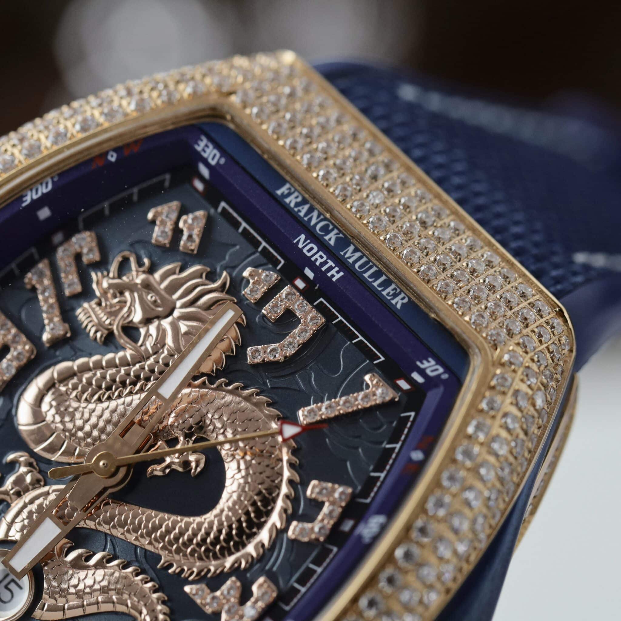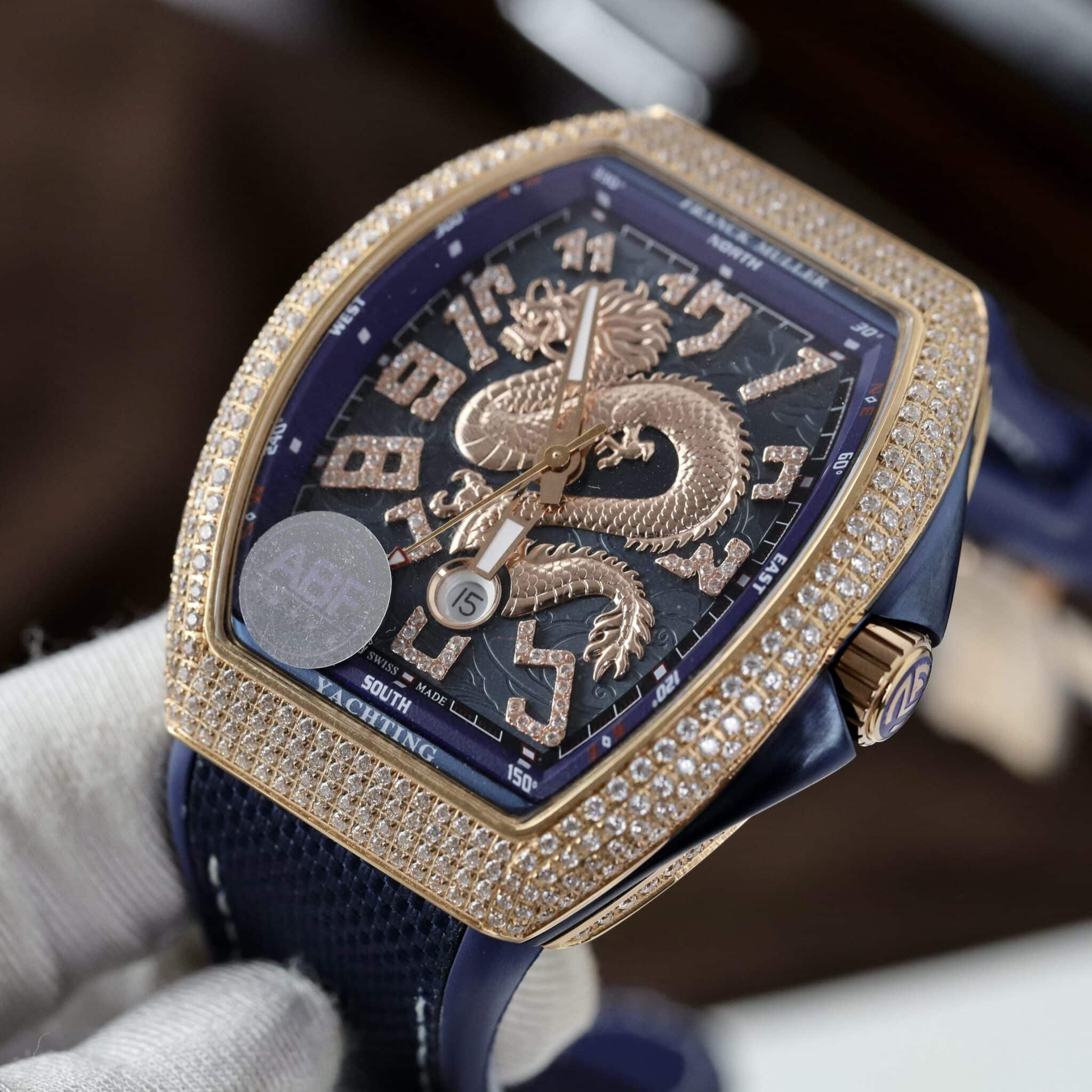 ĐỒNG HỒ FRANCK MULLER V45 DRAGON VÀNG HỒNG MẶT XANH BLUE VỎ ĐÍNH FULL ĐÁ REP 1:1 ABF 45MM