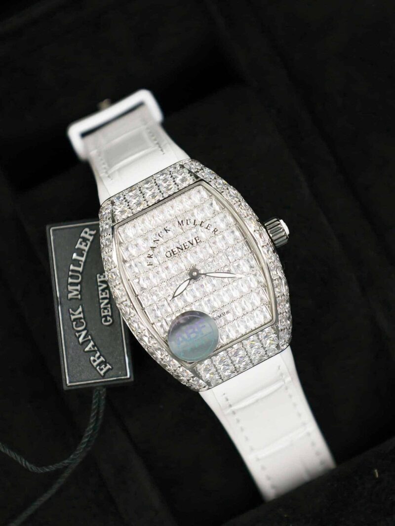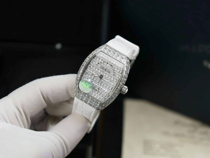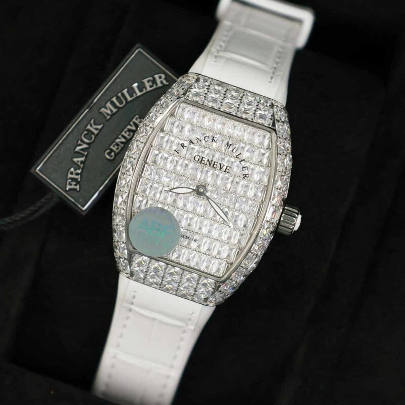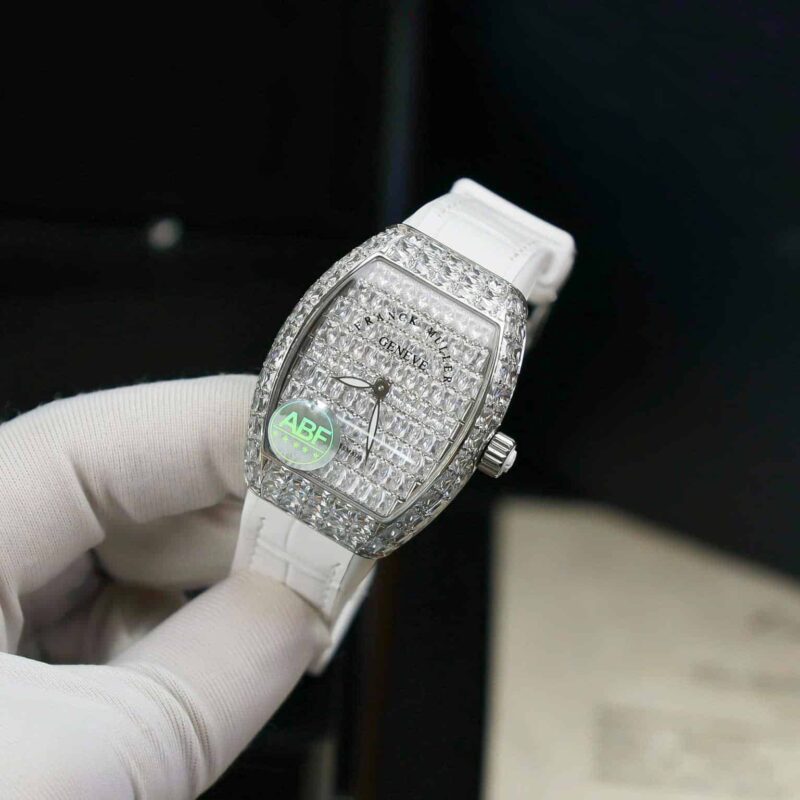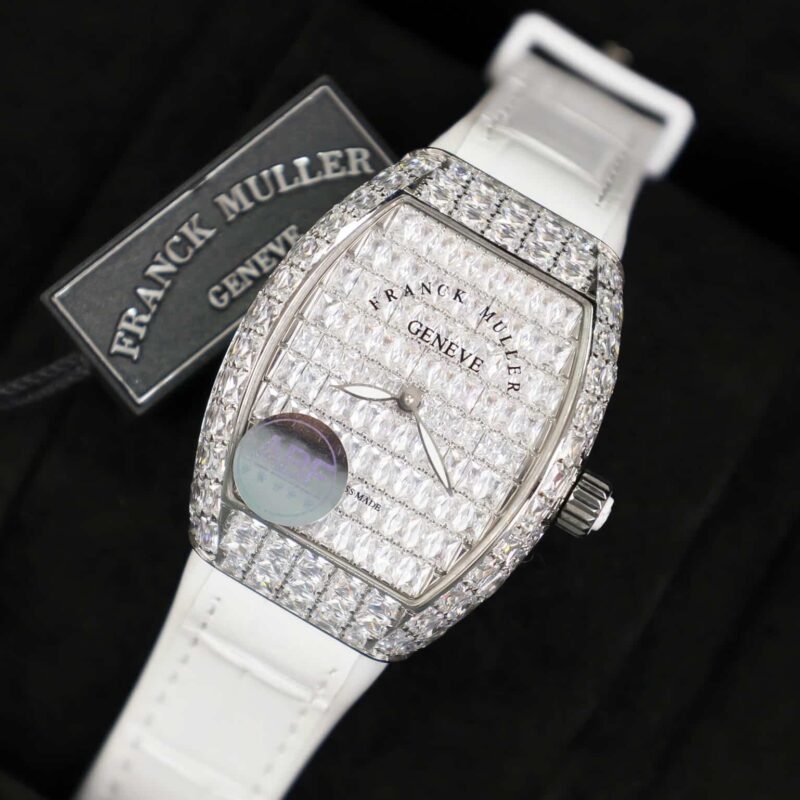 ĐỒNG HỒ NỮ FRANCK MULLER V32 FULL ĐÁ CZ BAGUETTE MÁY THỤY SĨ MÀU TRẮNG ABF 36MM