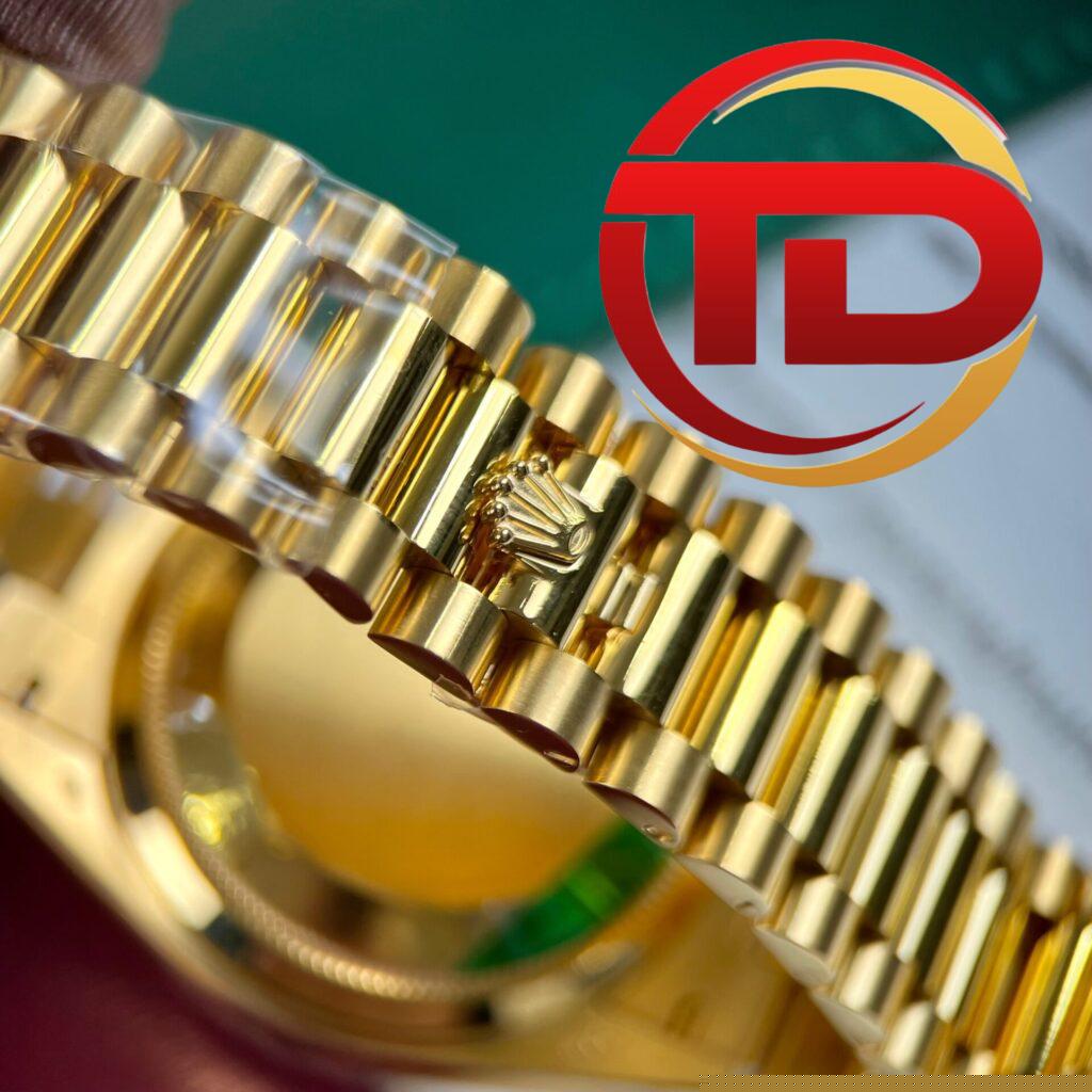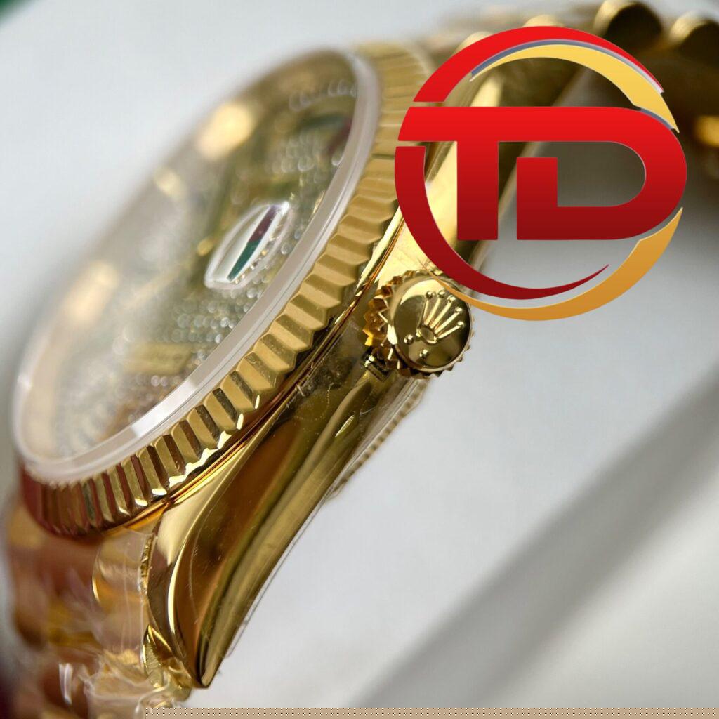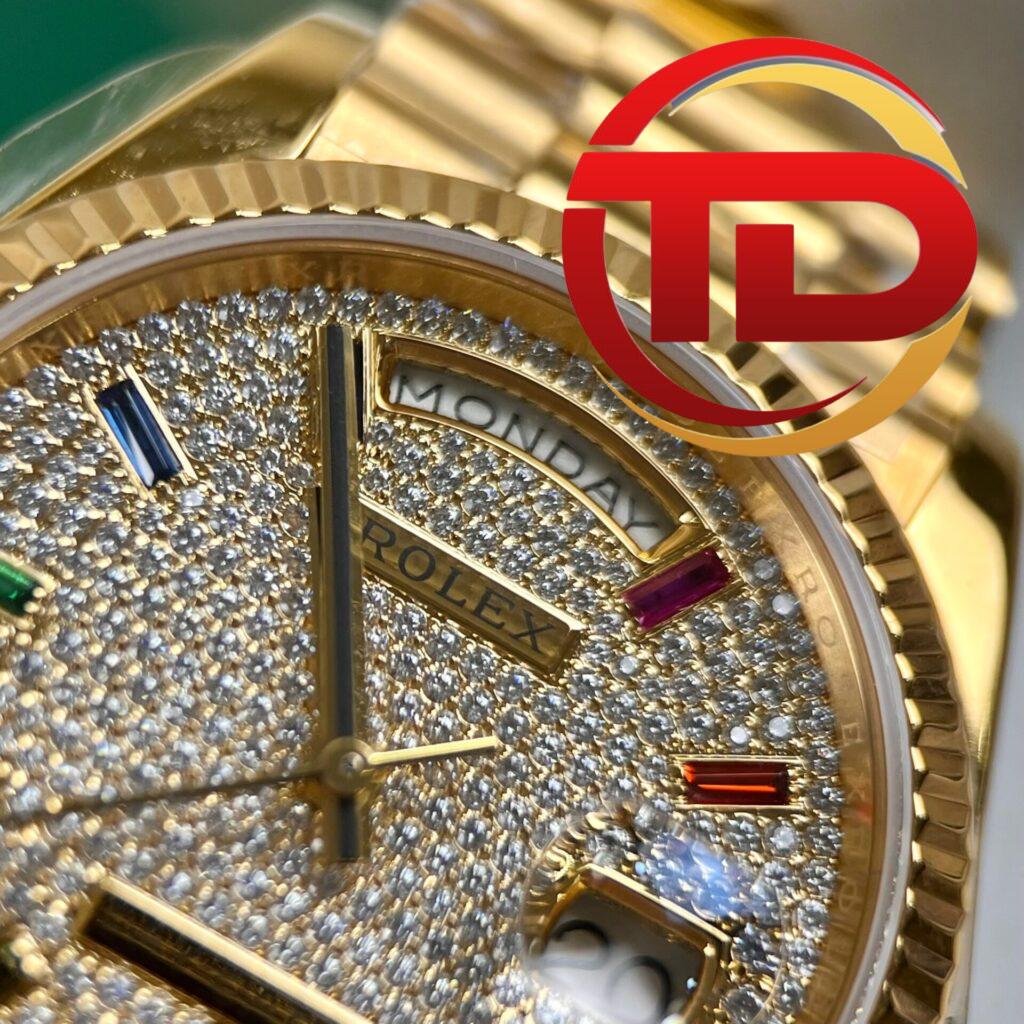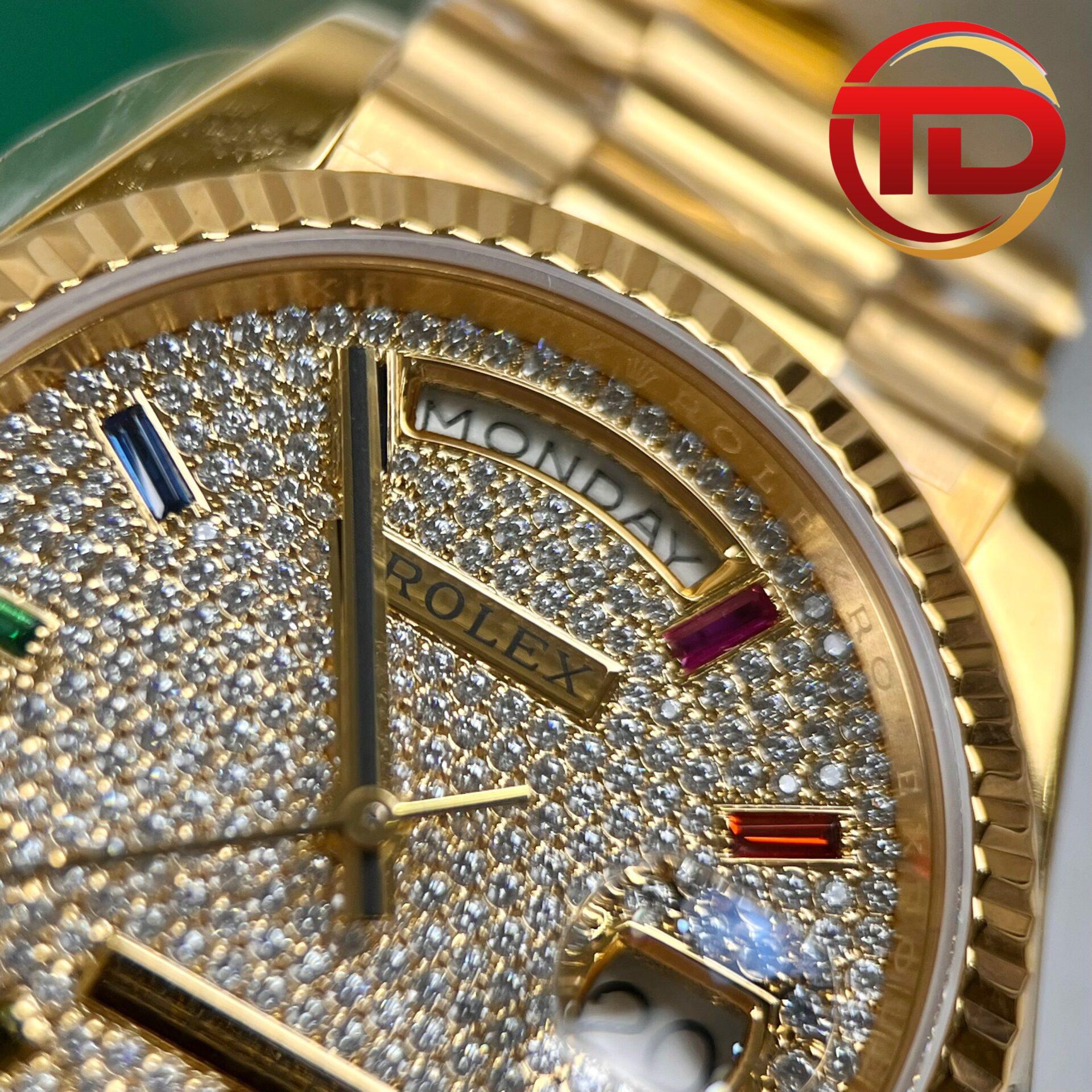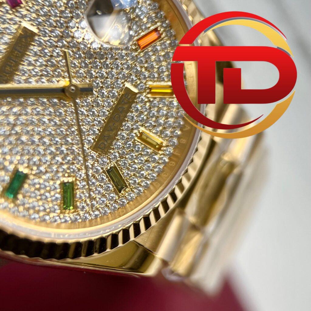 Hôm nay PyGlow trân trọng giới thiệu phiên bản đồng hồ Rolex Day-Date 128348 rainbow được bọc vàng 18k rep 1:1 cao cấp 36mm.
