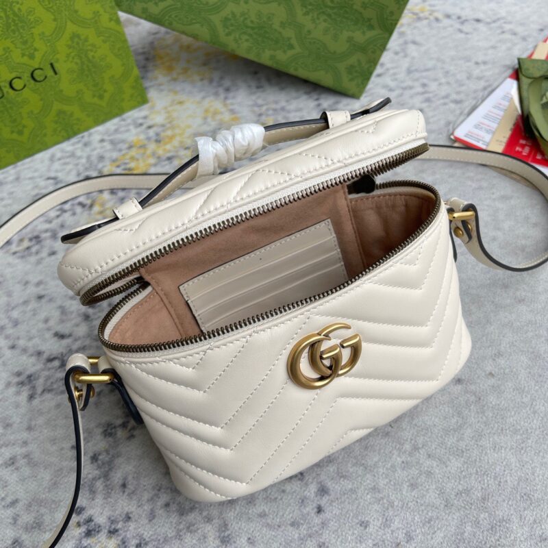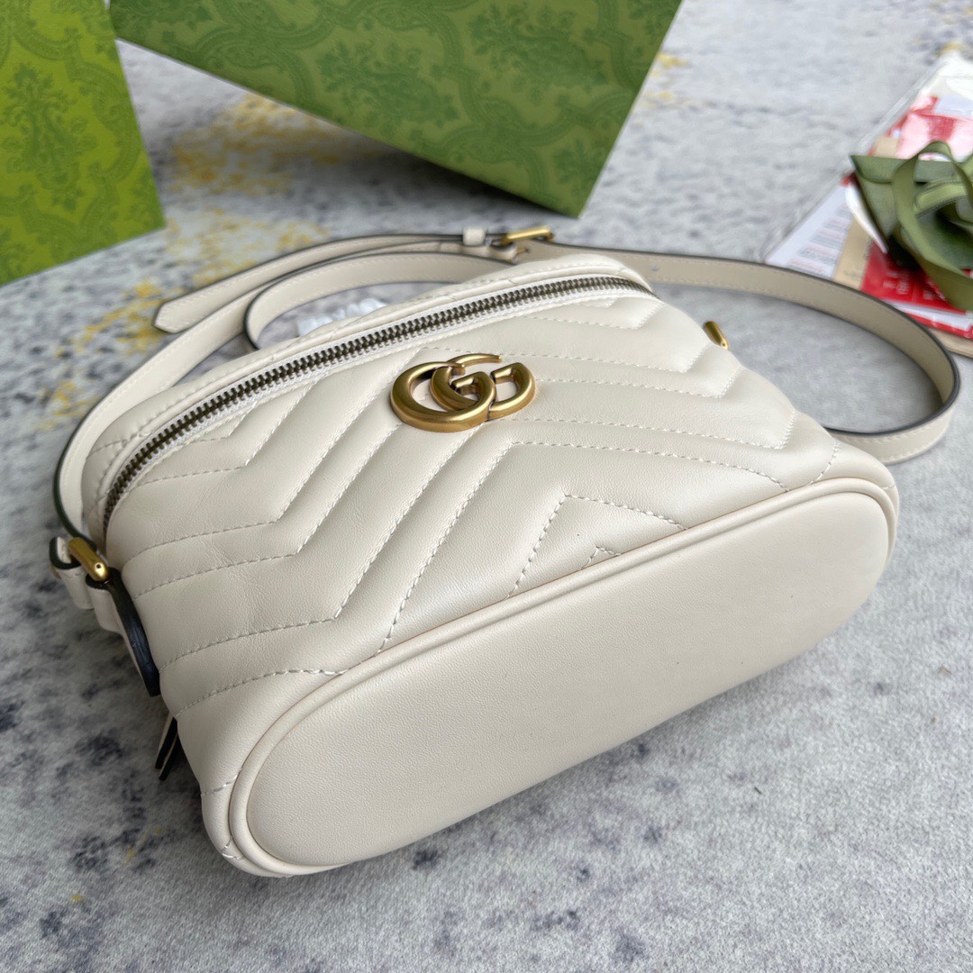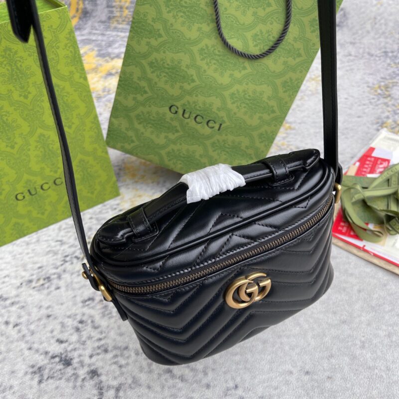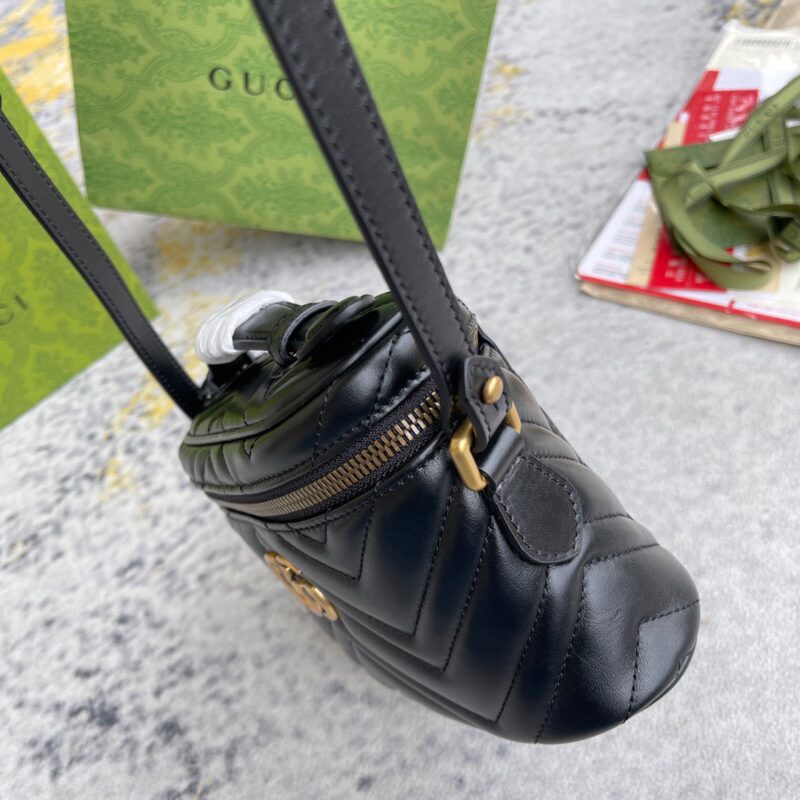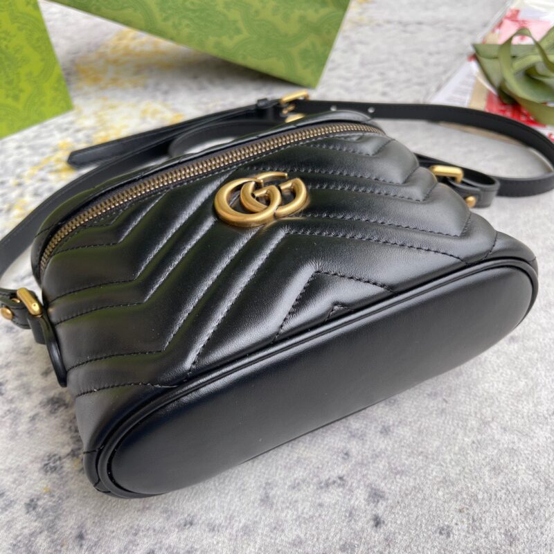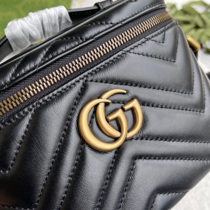 Thiết kế mới lạ hơn so với hình ảnh thường thấy của Gucci Marmont trên các dáng túi xách đã trở nên phổ biến, mẫu túi lần này ghi điểm với kích cỡ nhỏ gọn cùng kiểu dáng hộp độc đáo, mô phỏng sự tiện dụng và năng động của một chiếc ba lô. Tone màu đen được yêu thích nhất nhờ khả năng ứng dụng, thiết kế với nội thất ngăn chính lớn duy nhất có khoá kéo, dây đeo phối da cùng xích thanh mảnh, tạo cảm giác êm ái nhất khi đeo. Kỹ thuật chế tác da thuộc Matelasse nổi danh của dòng túi này tạo cảm giác phần da được chần bông sang trọng, hoạ tiết được tạo thành với các đường khâu may đều đặn, chỉn chu đến đẹp mắt. Điểm nhấn ấn tượng vẫn luôn là logo GG quá khổ được tôn vinh một cách trang trọng nhất, các chi tiết kim loại được mạ vàng nổi bật.