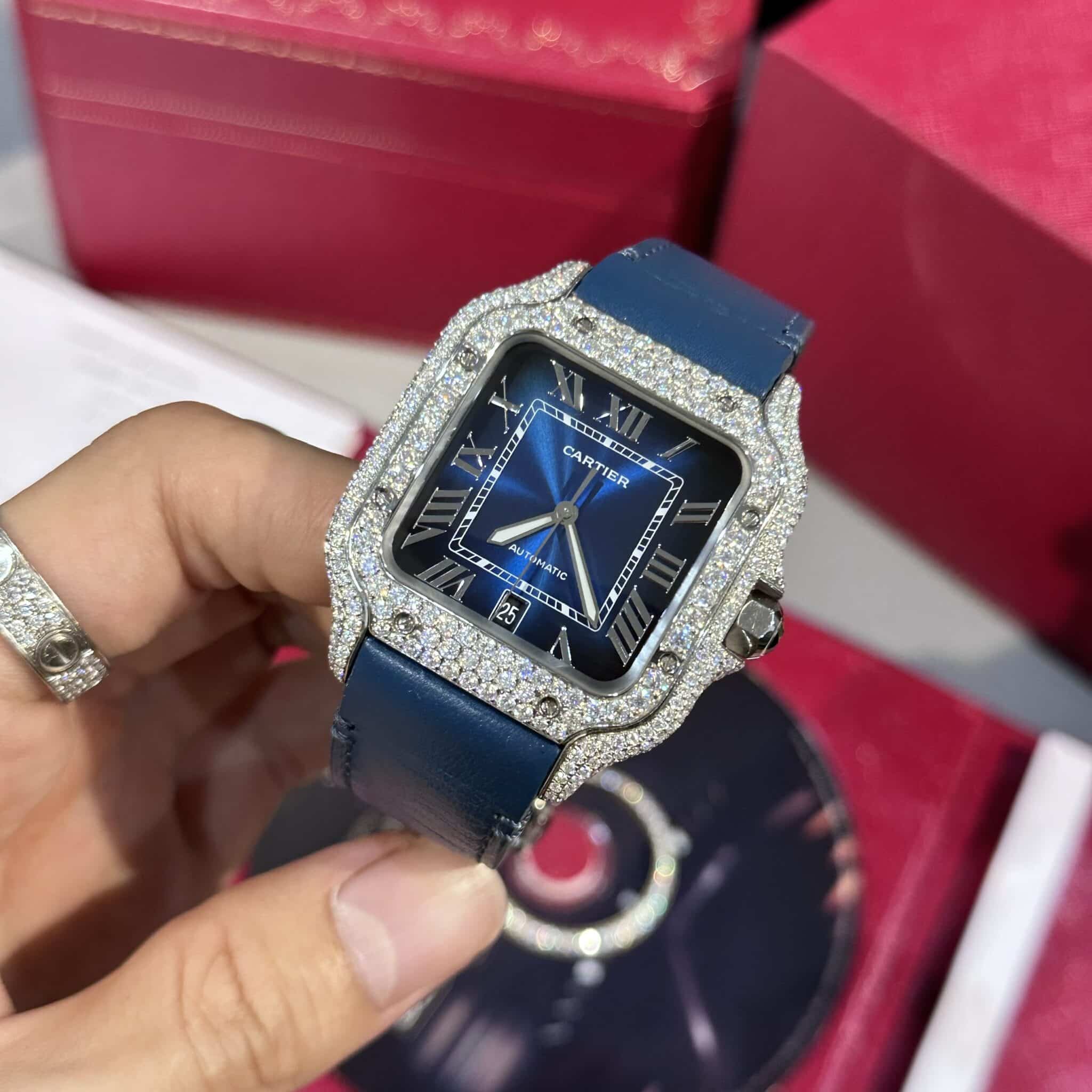 CARTIER SANTOS BLUE DIAL CUSTOM FULL MOISSANITE DIAMONDS BEST REPLICA 39.8MM