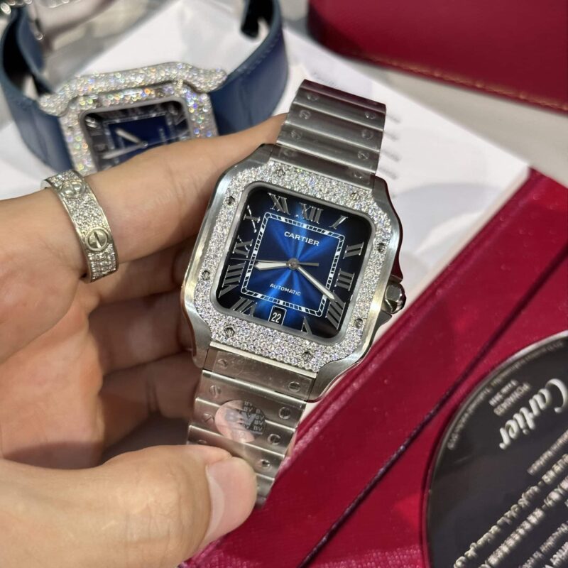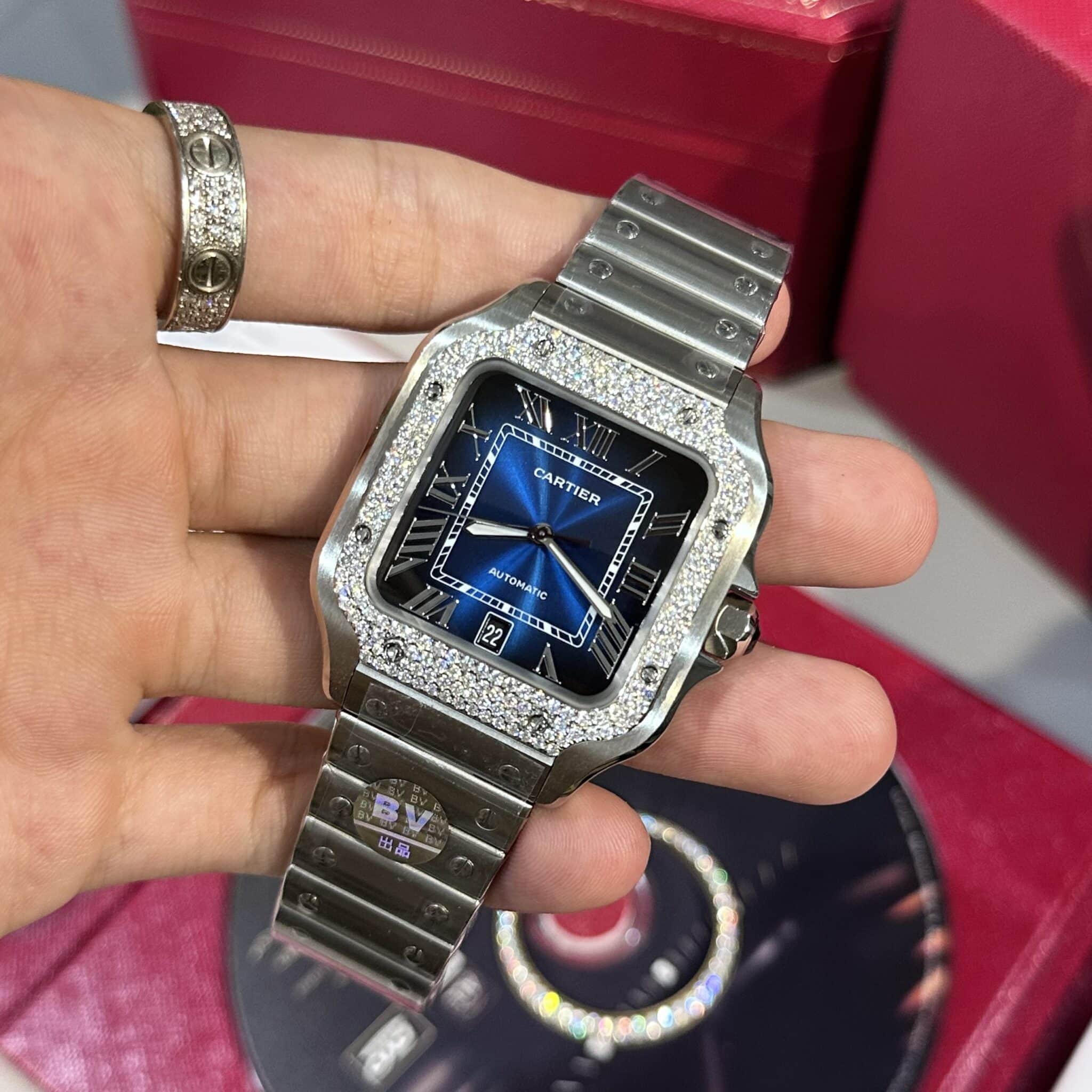 CARTIER SANTOS BLUE DIAL CUSTOM MOISSANITE BEZEL BEST REPLICA 39.8MM
