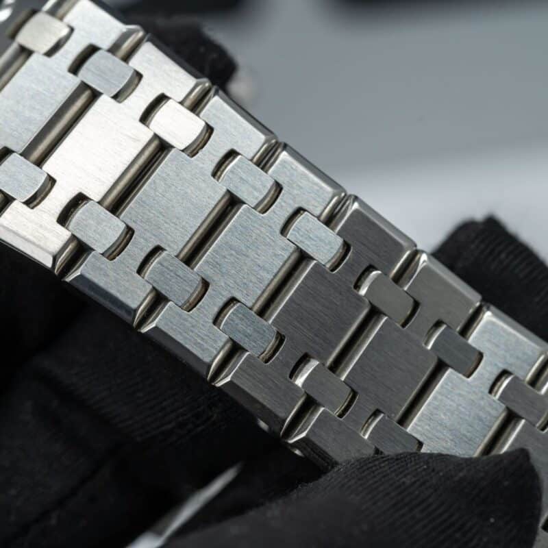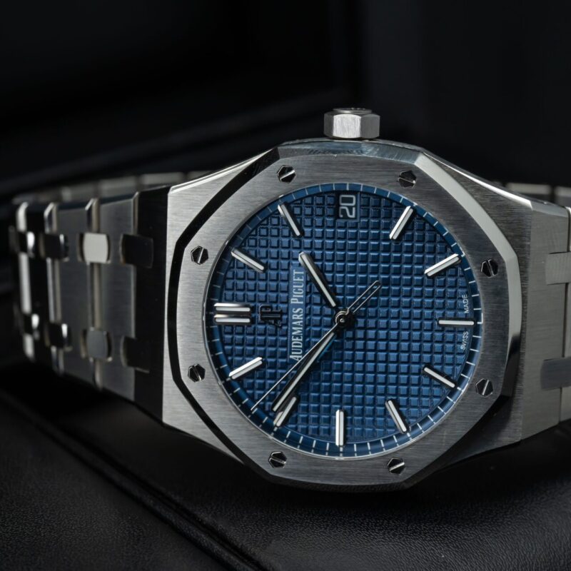 Audemars Piguet Royal Oak là một trong những dòng đồng hồ hàng đầu của thế giới, đặc biệt là phiên bản kỷ niệm 50 năm với mặt số xanh lam sẽ làm cho mọi người không thể rời mắt. Đồng hồ có đường kính 41mm, mặt kính sapphire nguyên khối đem đến sự trong suốt và khả năng đọc cho chiếc đồng hồ. Vỏ và dây đeo được làm bằng thép không gỉ 316L cũng tạo nên sức mạnh và sự bền bỉ cho chiếc đồng hồ.
