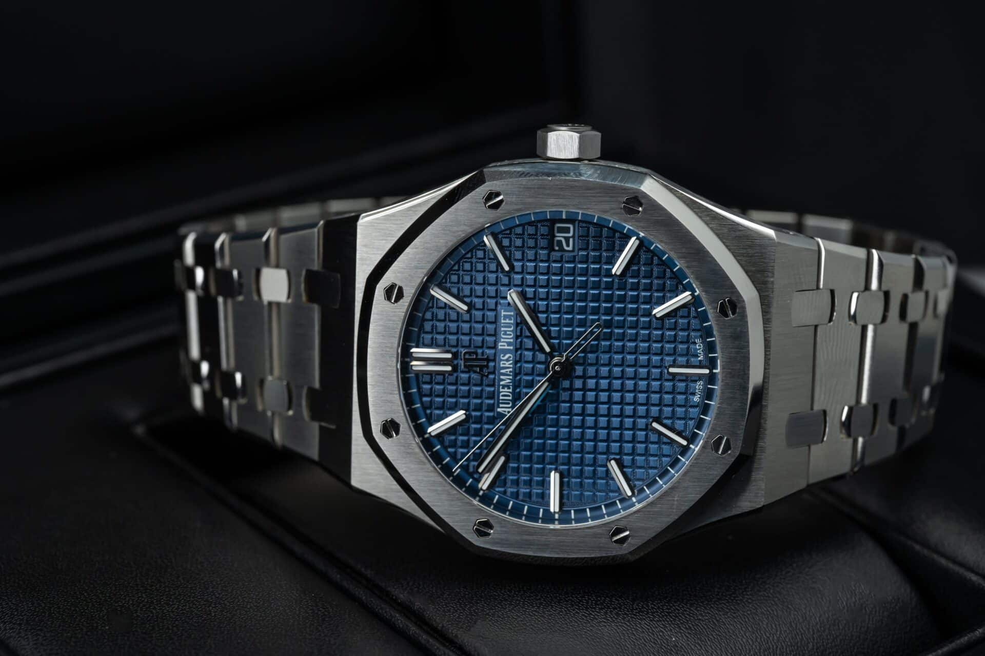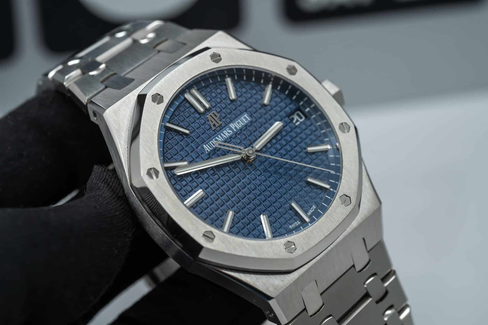 Audemars Piguet Royal Oak là một trong những dòng đồng hồ hàng đầu của thế giới, đặc biệt là phiên bản kỷ niệm 50 năm với mặt số xanh lam sẽ làm cho mọi người không thể rời mắt. Đồng hồ có đường kính 41mm, mặt kính sapphire nguyên khối đem đến sự trong suốt và khả năng đọc cho chiếc đồng hồ. Vỏ và dây đeo được làm bằng thép không gỉ 316L cũng tạo nên sức mạnh và sự bền bỉ cho chiếc đồng hồ.