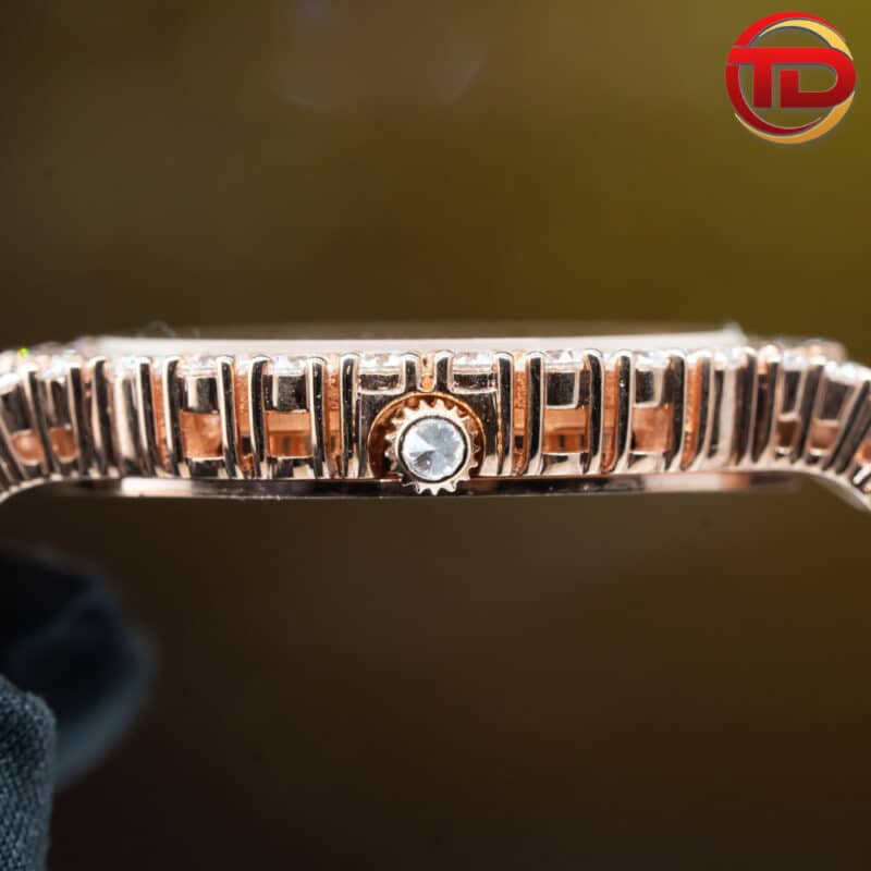 Mỗi viên kim cương được cố định bởi 4 chân có đầu dáng tròn vừa duyên dáng mà lại có khả năng siêu bền chặt. Tiếp đó, kim cương tiếp tục được nhà sản xuất nạm đều kéo dài đến càng nối dây, nơi tiếp xúc với dây đeo đồng hồ.