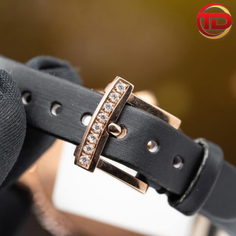 Có kích thước 34,2 x 29,4mm và được trang bị dây đeo satin chắc chắn với màu đen mun. Vỏ đồng hồ được chế tác vàng hồng 10k nữ tính mà đặc biệt nổi bật.