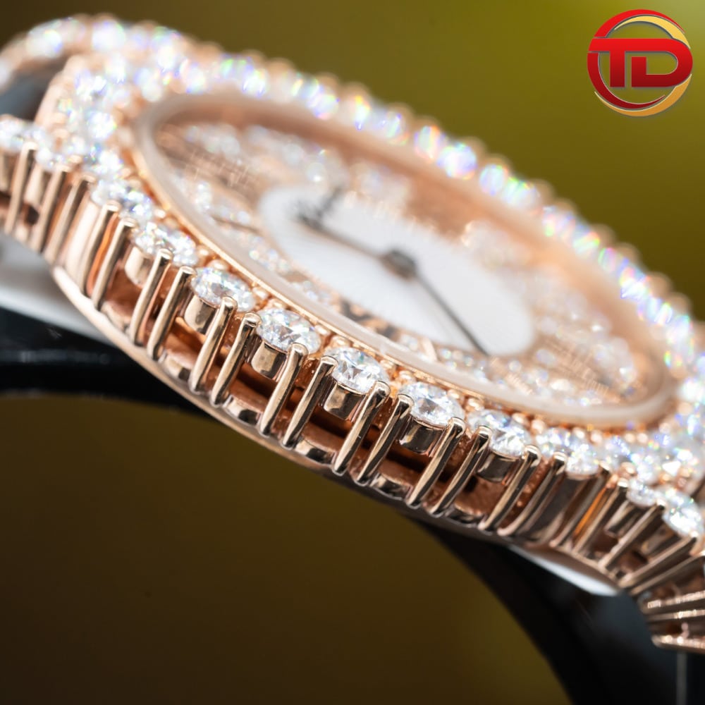 Mỗi viên kim cương được cố định bởi 4 chân có đầu dáng tròn vừa duyên dáng mà lại có khả năng siêu bền chặt. Tiếp đó, kim cương tiếp tục được nhà sản xuất nạm đều kéo dài đến càng nối dây, nơi tiếp xúc với dây đeo đồng hồ.