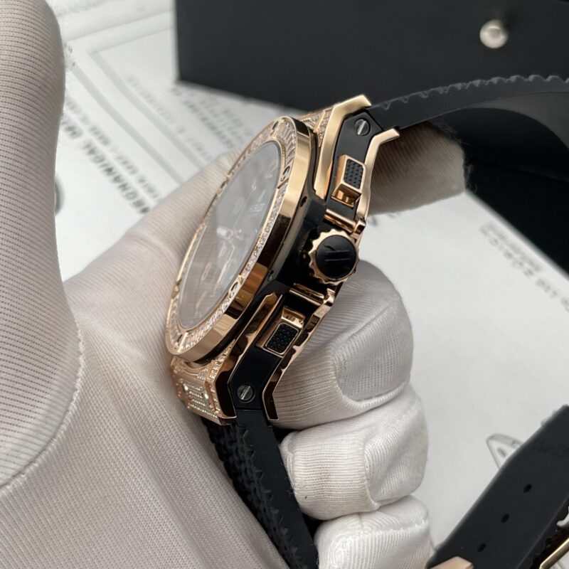 Hôm nay, PyGlow giới thiệu chiếc đồng hồ Hublot Big Bang vỏ vàng hồng đính đá và niềng đính đá baguute cực đẹp. Đây là phiên bản Hublot Big Bang Rep 1:1 cao cấp của nhà máy HB Factory.