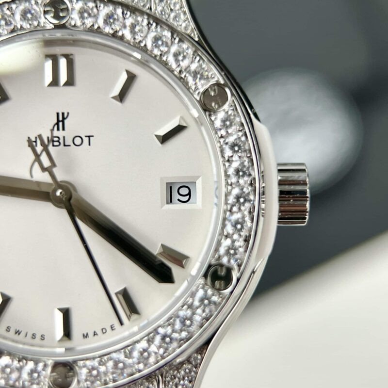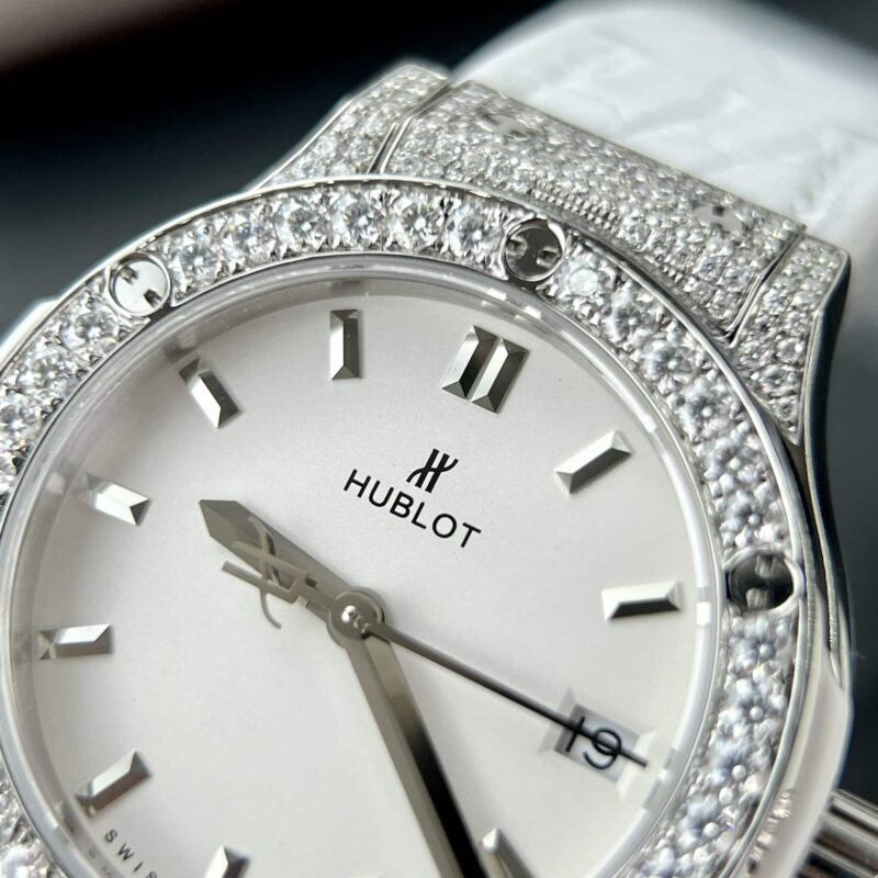 Hình ảnh chi tiết chiếc đồng hồ Hublot Classic Fusion nữ vỏ đính full moissanite Hong Kong 33mm máy pin Thụy Sỹ tại PyGlow: