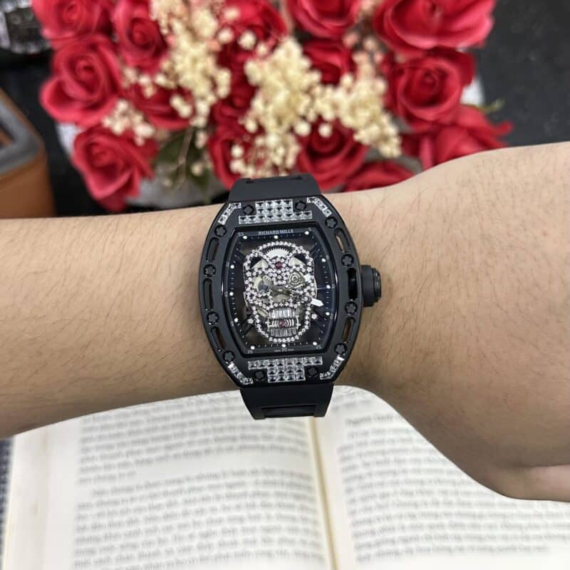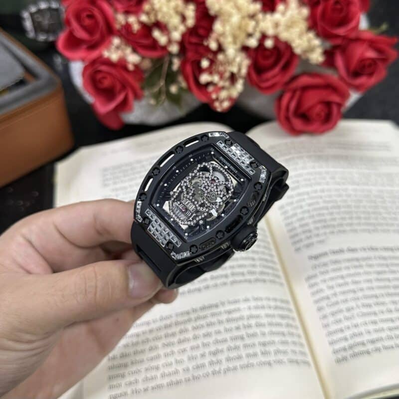 ĐỒNG HỒ RICHARD MILLE RM 052 REP 11 SKULL ĐÍNH FULL ĐÁ MÀU ĐEN 42MM