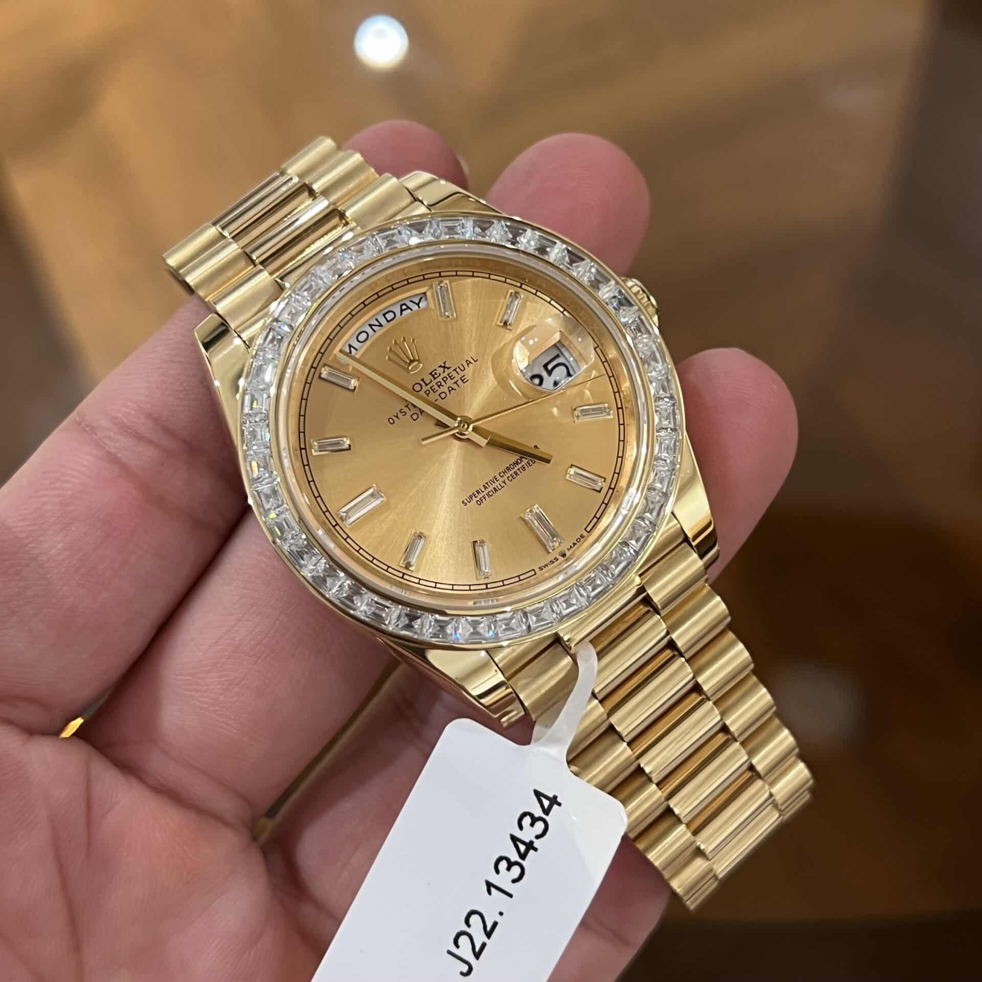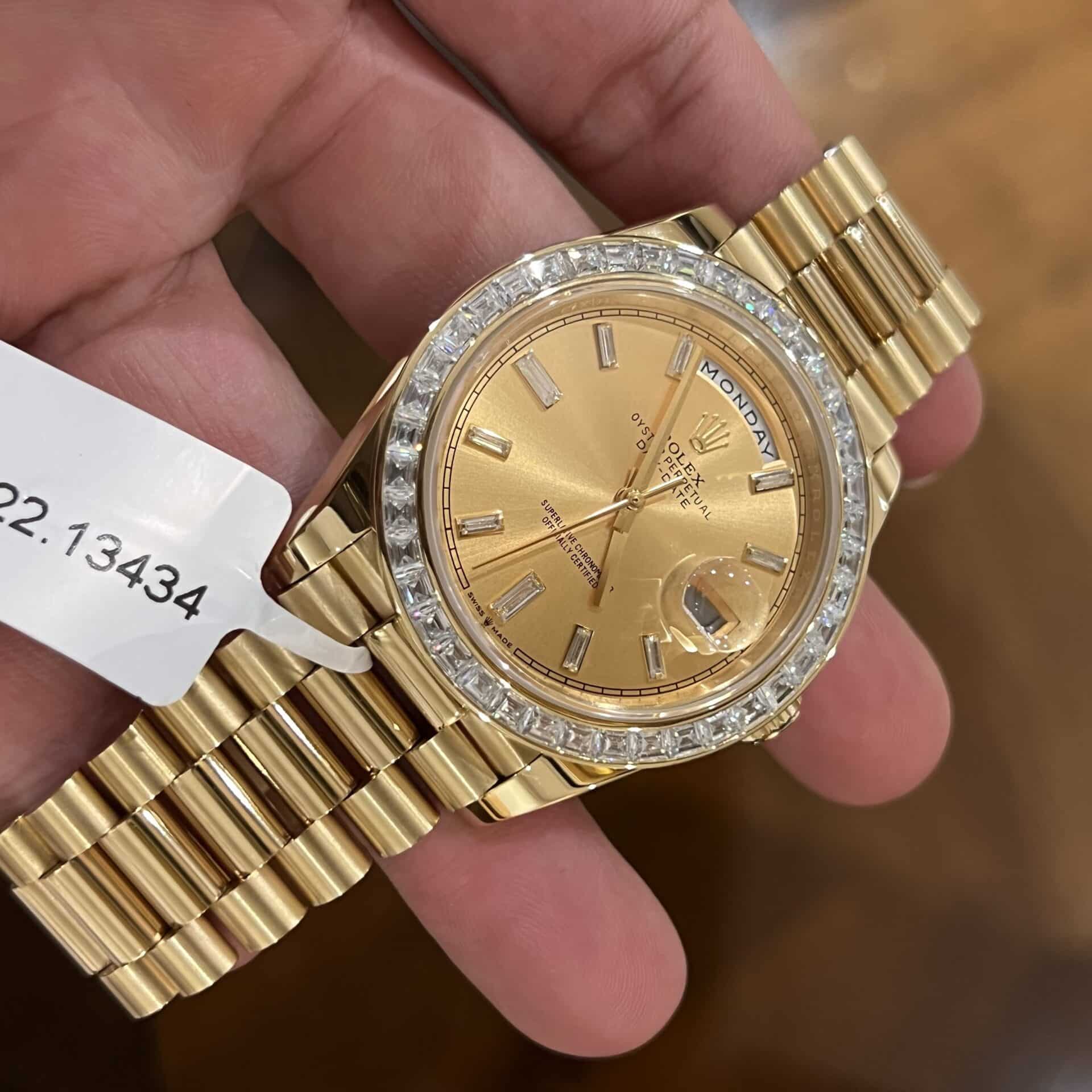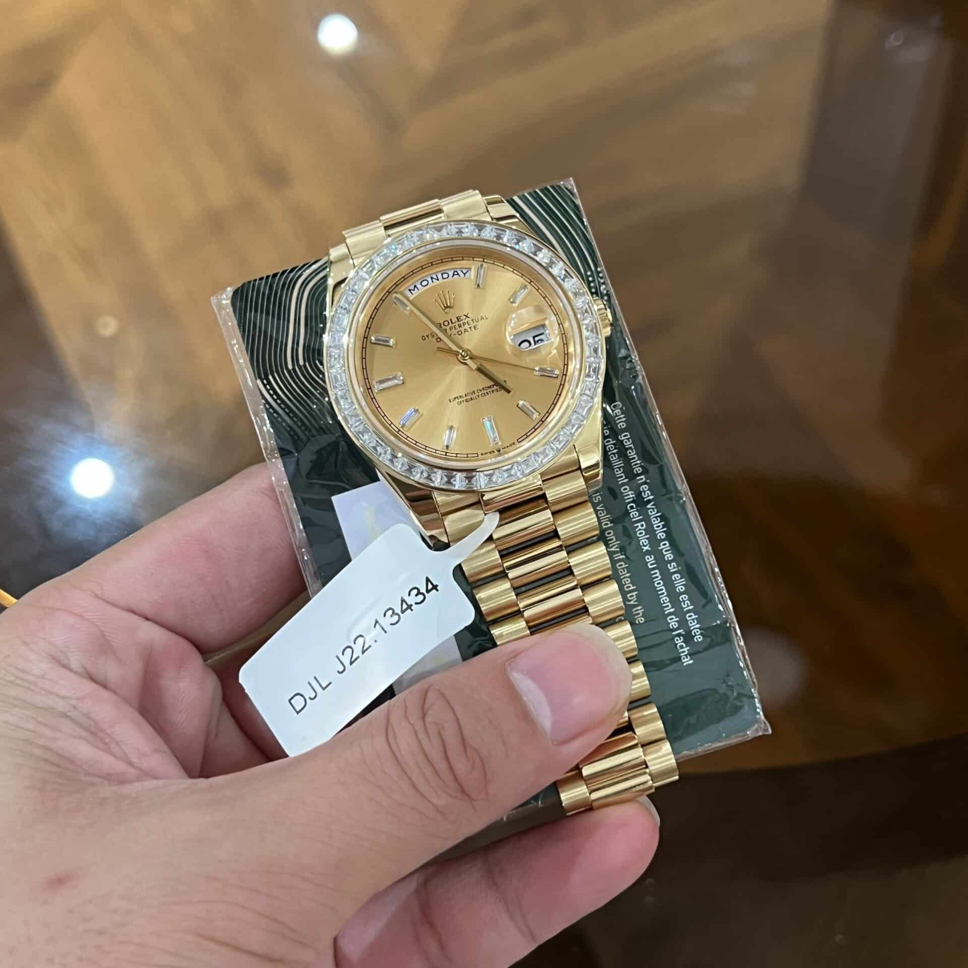 ĐỒNG HỒ ROLEX DAY-DATE SUPER FAKE BỌC VÀNG NIỀNG KIM CƯƠNG MOISSANITE 40MM