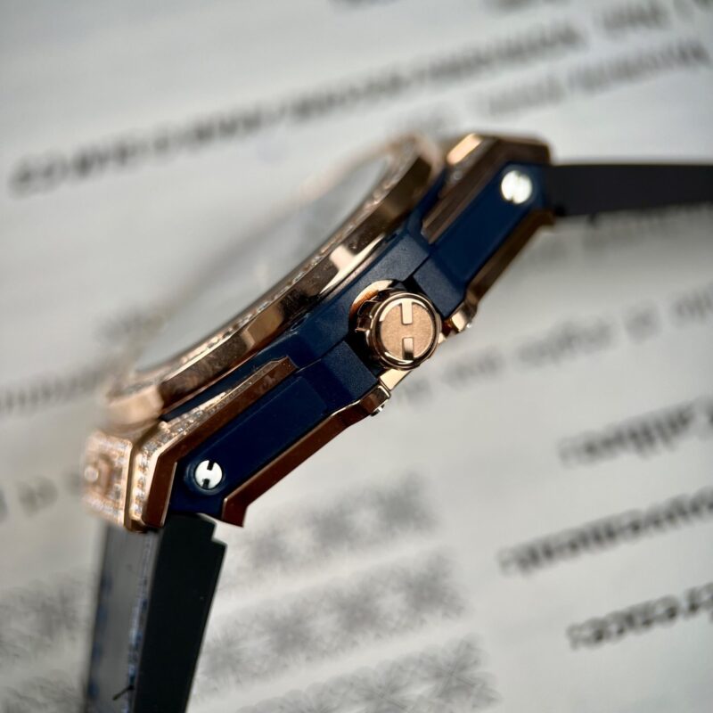 Nổi bật với màu xanh mát mắt cùng màu vàng sang trọng, chiếc đồng hồ Hublot Big Bang One Click 39 465.OX.7180.LR.1204 phiên bản replica 1:1 cao cấp thực sự là lựa chọn hoàn hảo dành cho các quý ông hiện đại. Lớp vỏ được mạ vàng King Gold 18k hoàn thiện chải xước vô cùng ấn tượng xen kẽ các càng nối dây bóng bẩy. Vành bezel dáng tròn cổ điển nạm 42 viên kim cương moissanite lộng lẫy tỏa sáng trên cổ tay quý ông.