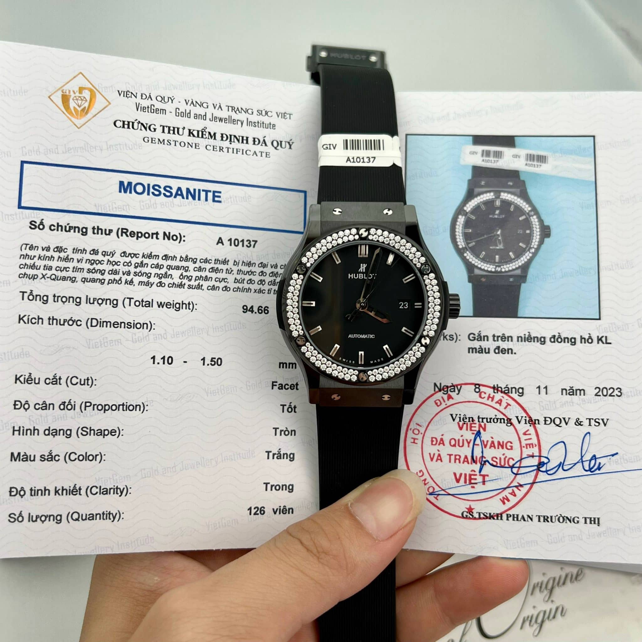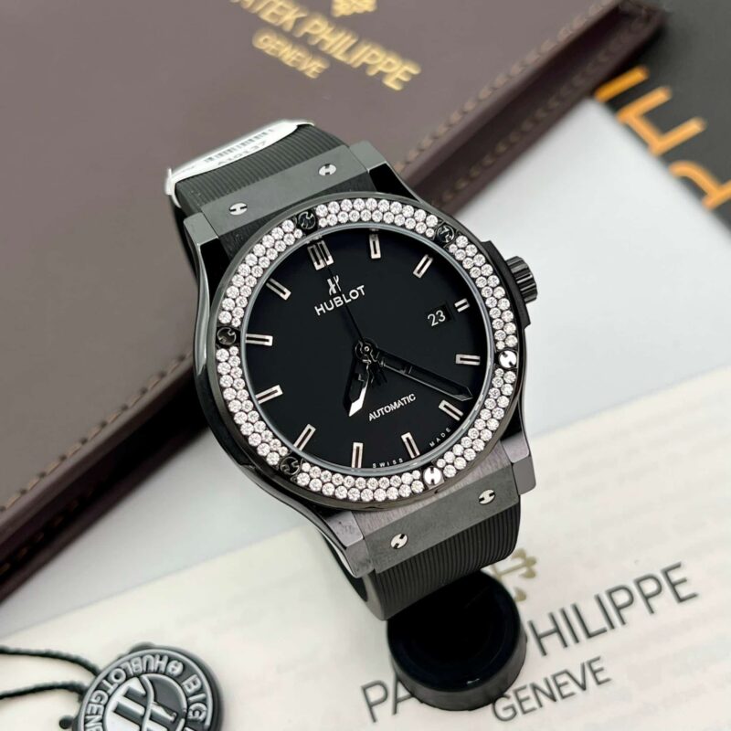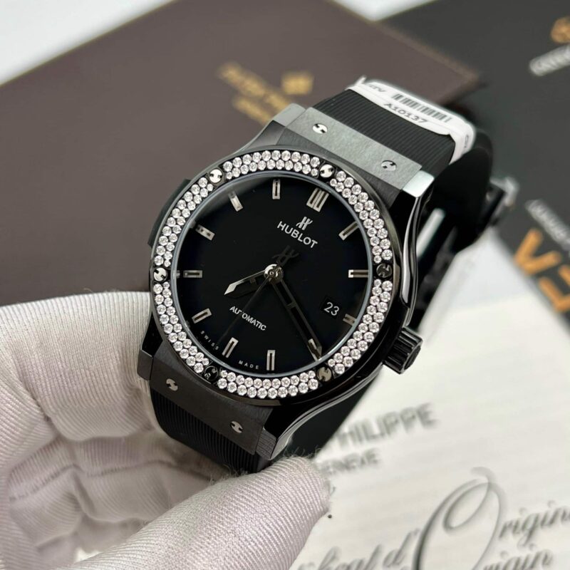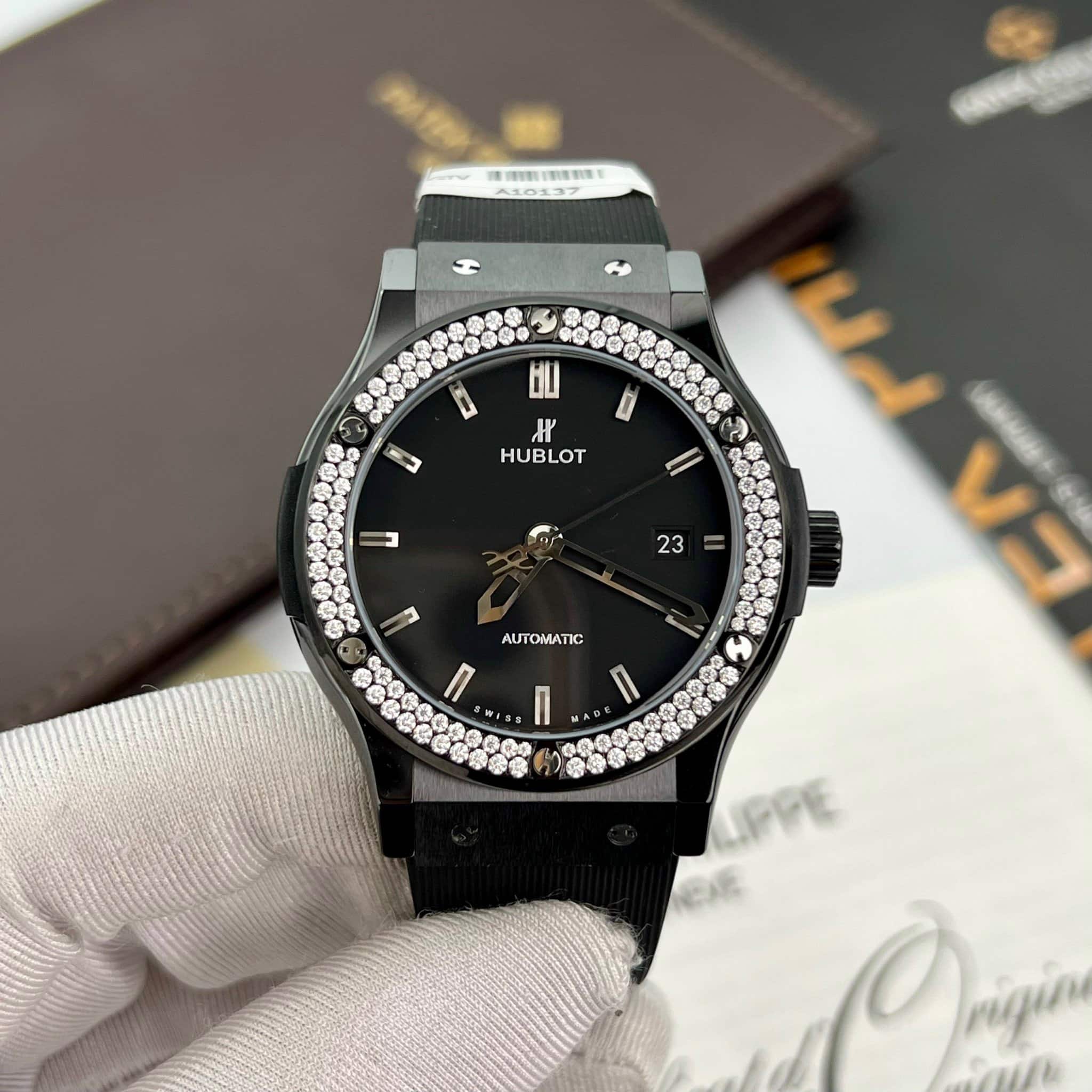HUBLOT CLASSIC FUSION BLACK CERAMIC BLACK DIAL MOISSANITE BEZEL 42MM