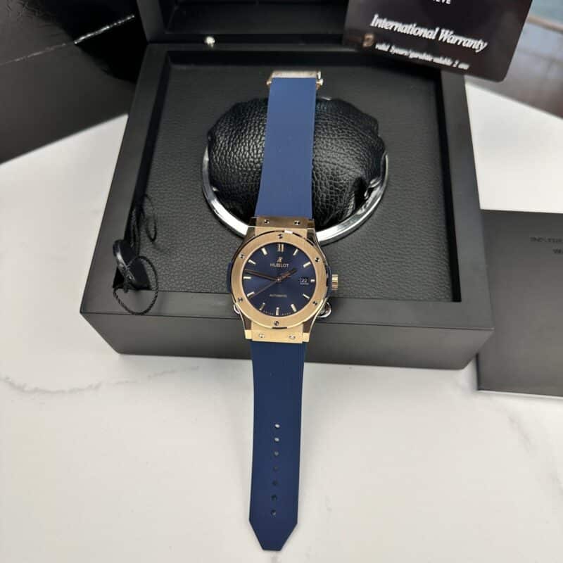 PyGlow trân trọng giới thiệu chiếc đồng hồ Hublot Classic Fusion mặt xanh navy vỏ vàng hồng fake 1:1 của nhà máy HB factory.