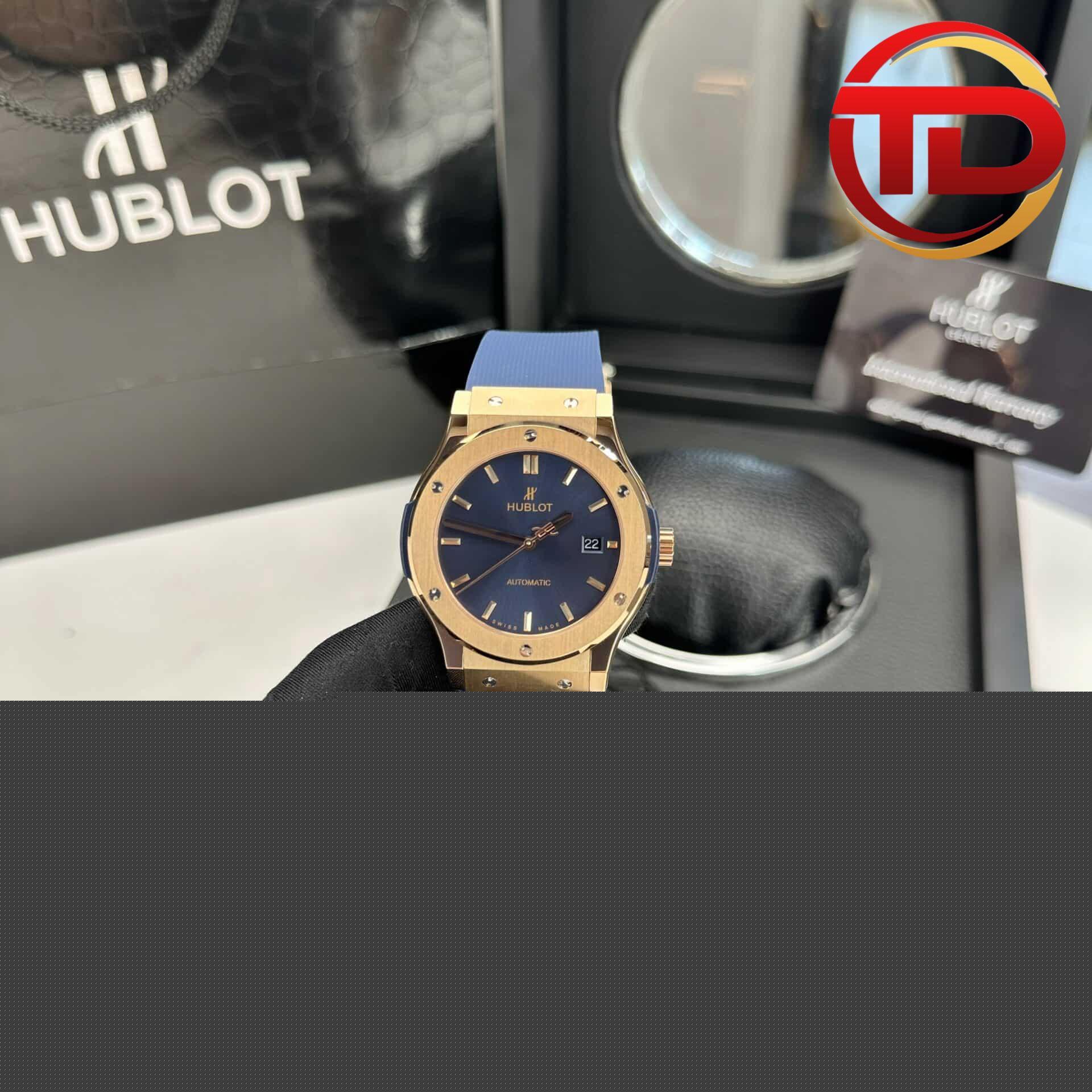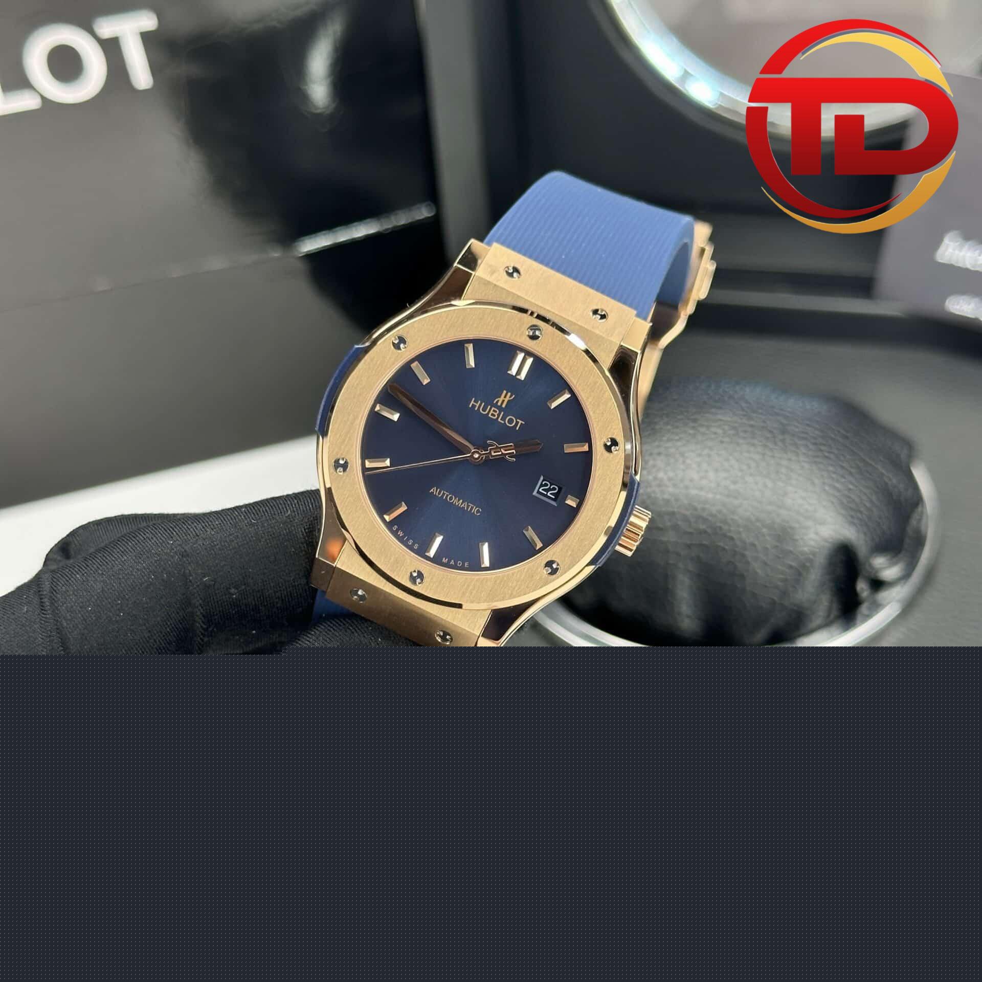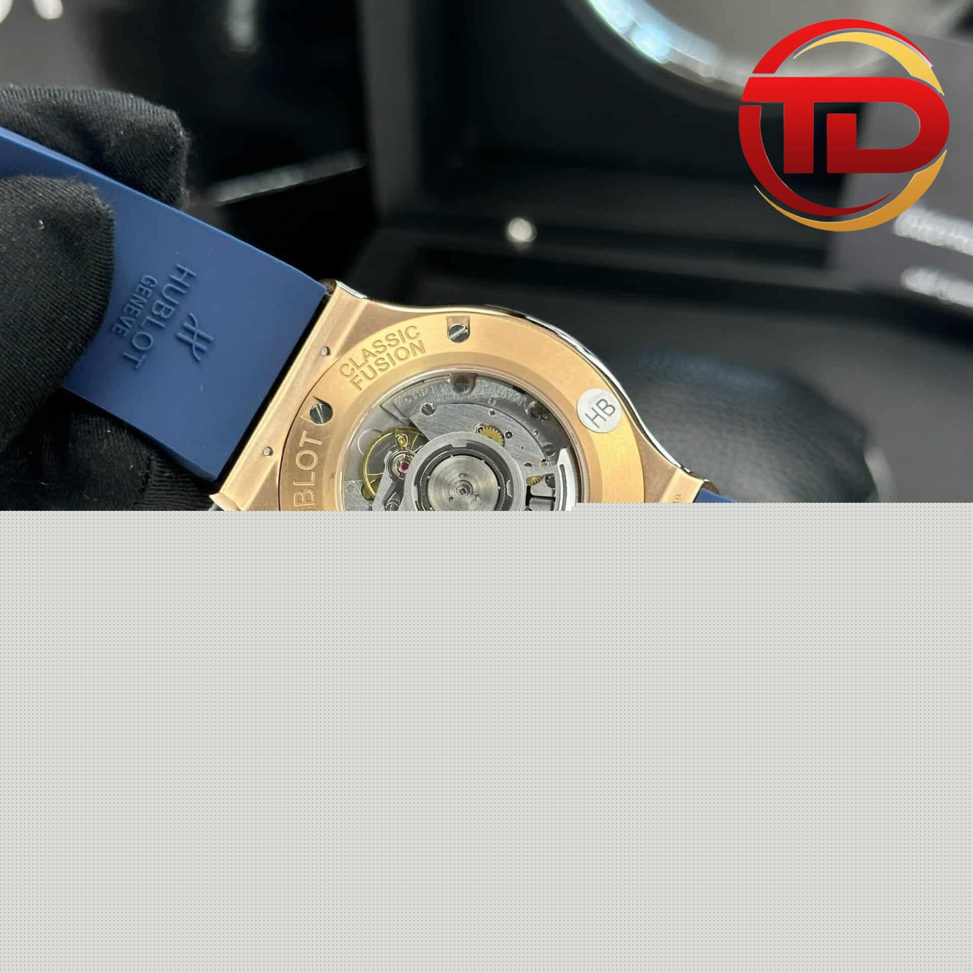 PyGlow trân trọng giới thiệu chiếc đồng hồ Hublot Classic Fusion mặt xanh navy vỏ vàng hồng fake 1:1 của nhà máy HB factory.