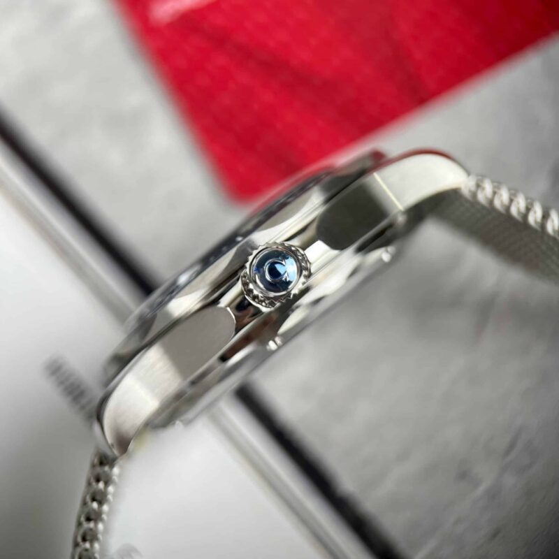 To complement its metallic appearance, the watch comes with a brushed stainless steel bracelet, designed in an elegant mesh style reminiscent of Bond’s titanium watch in the movie No Time To Die.