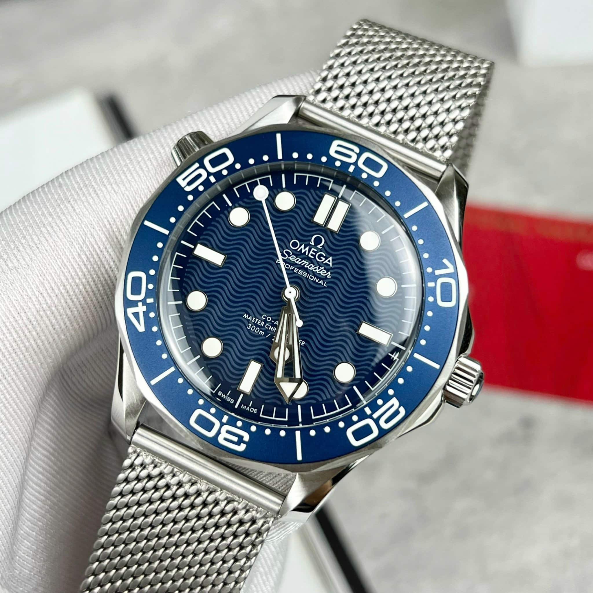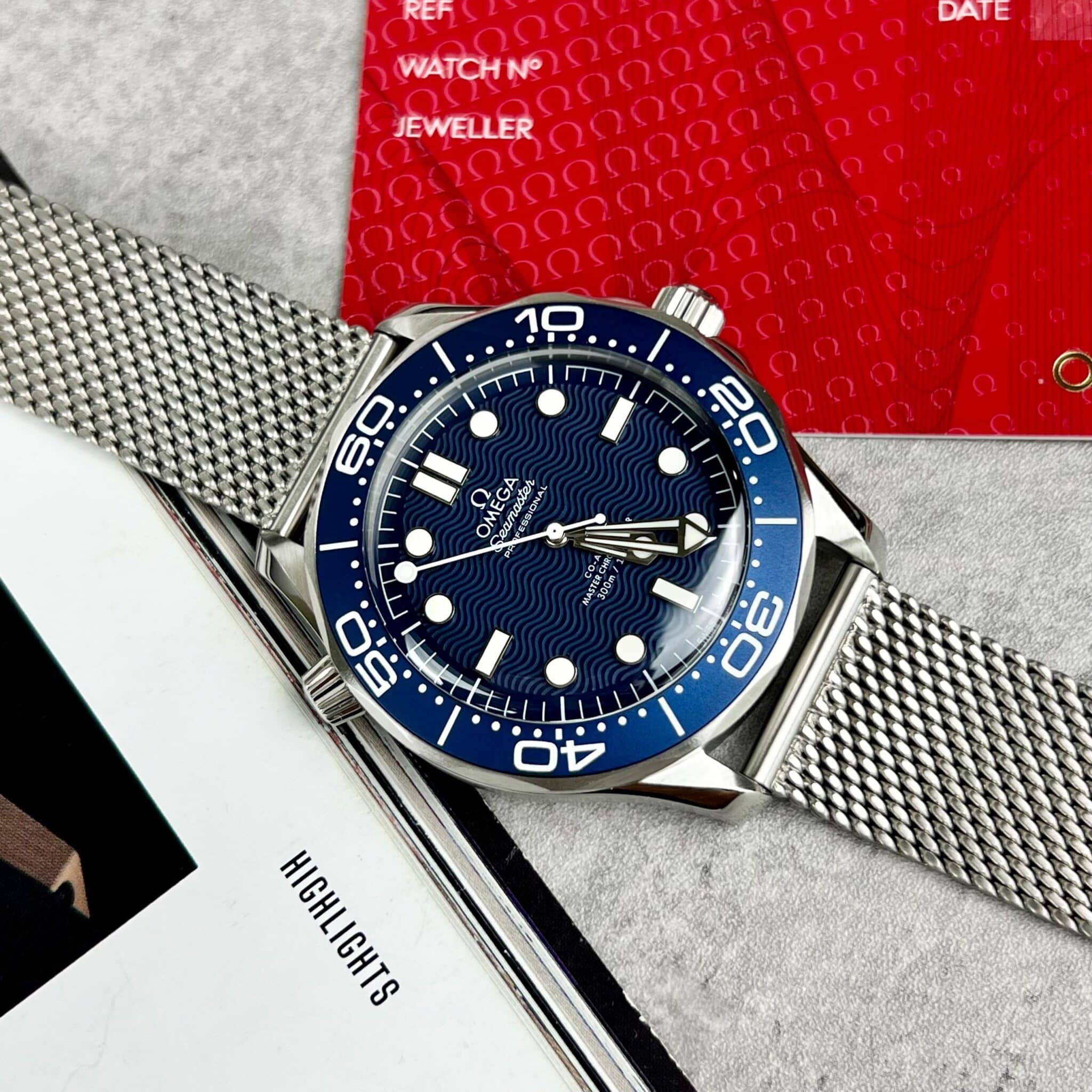 In 2022, Omega launched a special edition timepiece, the 42mm Seamaster Diver 300M in stainless steel, to commemorate 60 years of James Bond. The watch features a striking blue oxalic anodized aluminium dial with laser engraved waves, paying homage to the Seamaster Diver 300M worn by James Bond in the iconic 1995 film, GoldenEye. Notably, a commemorative number 60 replaces the traditional inverted triangle on the diving scale, adding an exclusive touch.