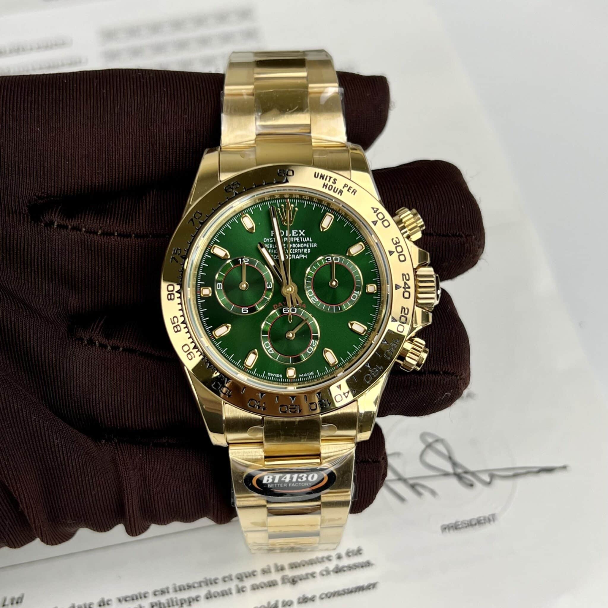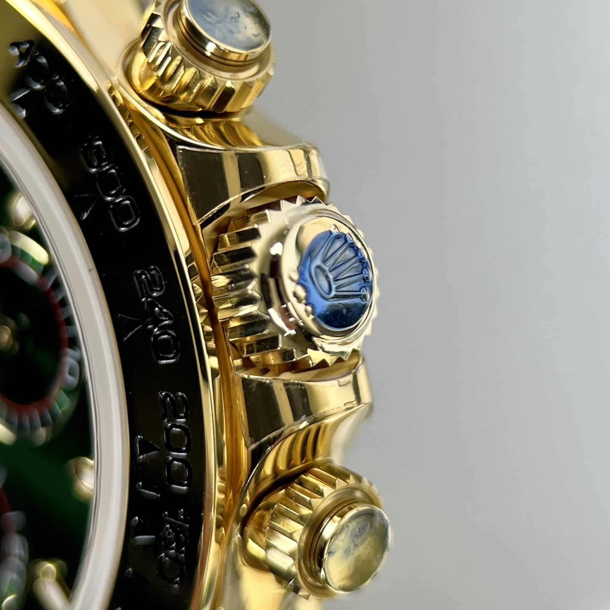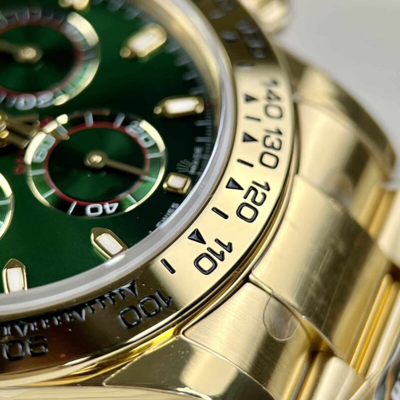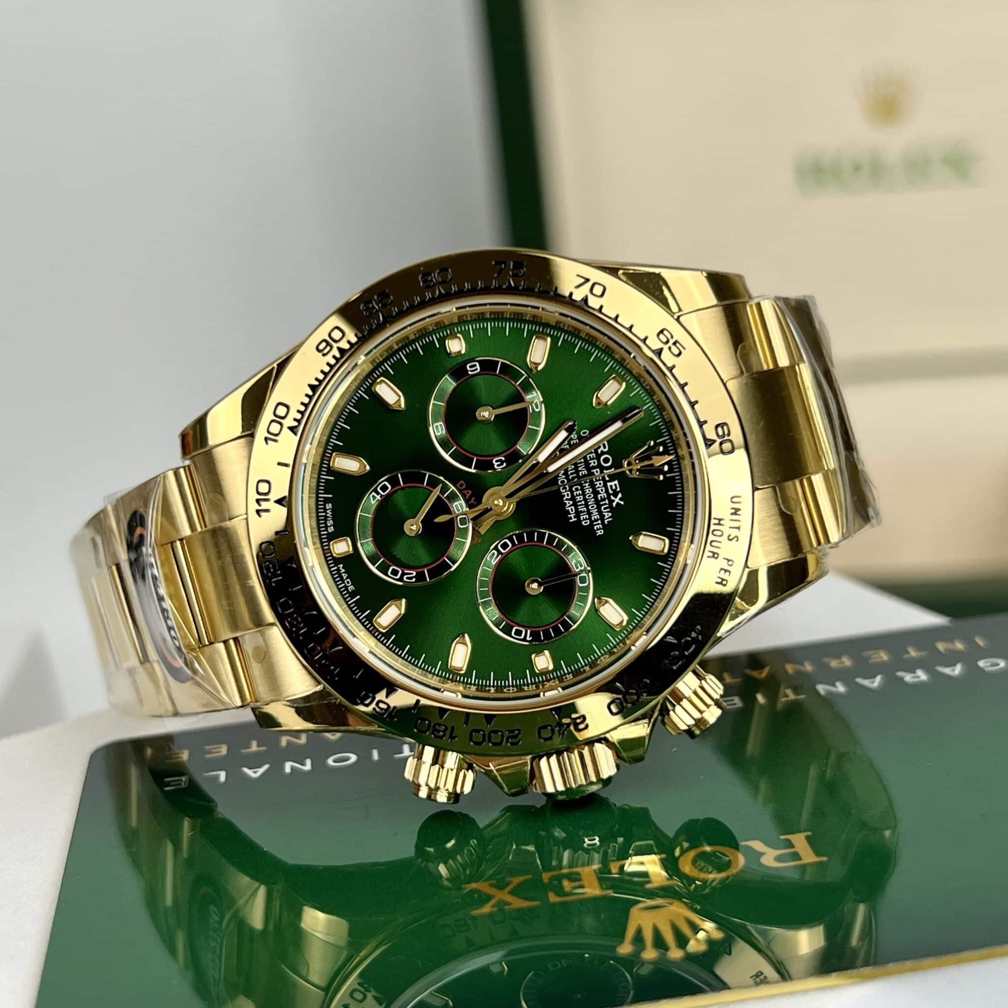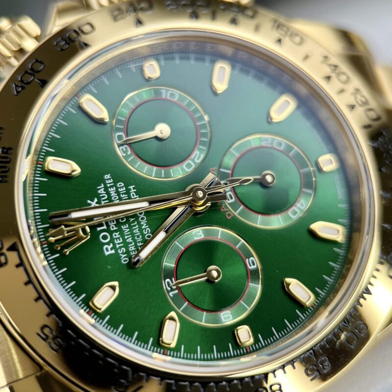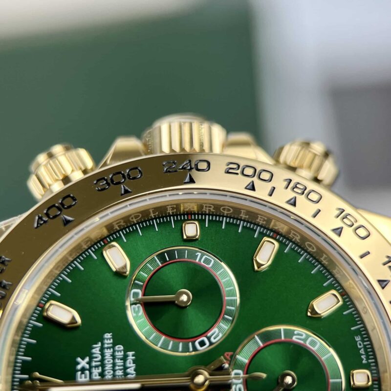 More than just a timekeeping device, the Rolex Cosmograph Daytona 116508 with its Green Dial is a masterpiece that showcases the owner’s class. Following in the footsteps of its predecessors, this watch emerges with an irresistibly captivating appearance, characterized by a design that exudes modernity and athleticism, embodied by the Oyster case silhouette, as well as the luxury of 18k gold material.