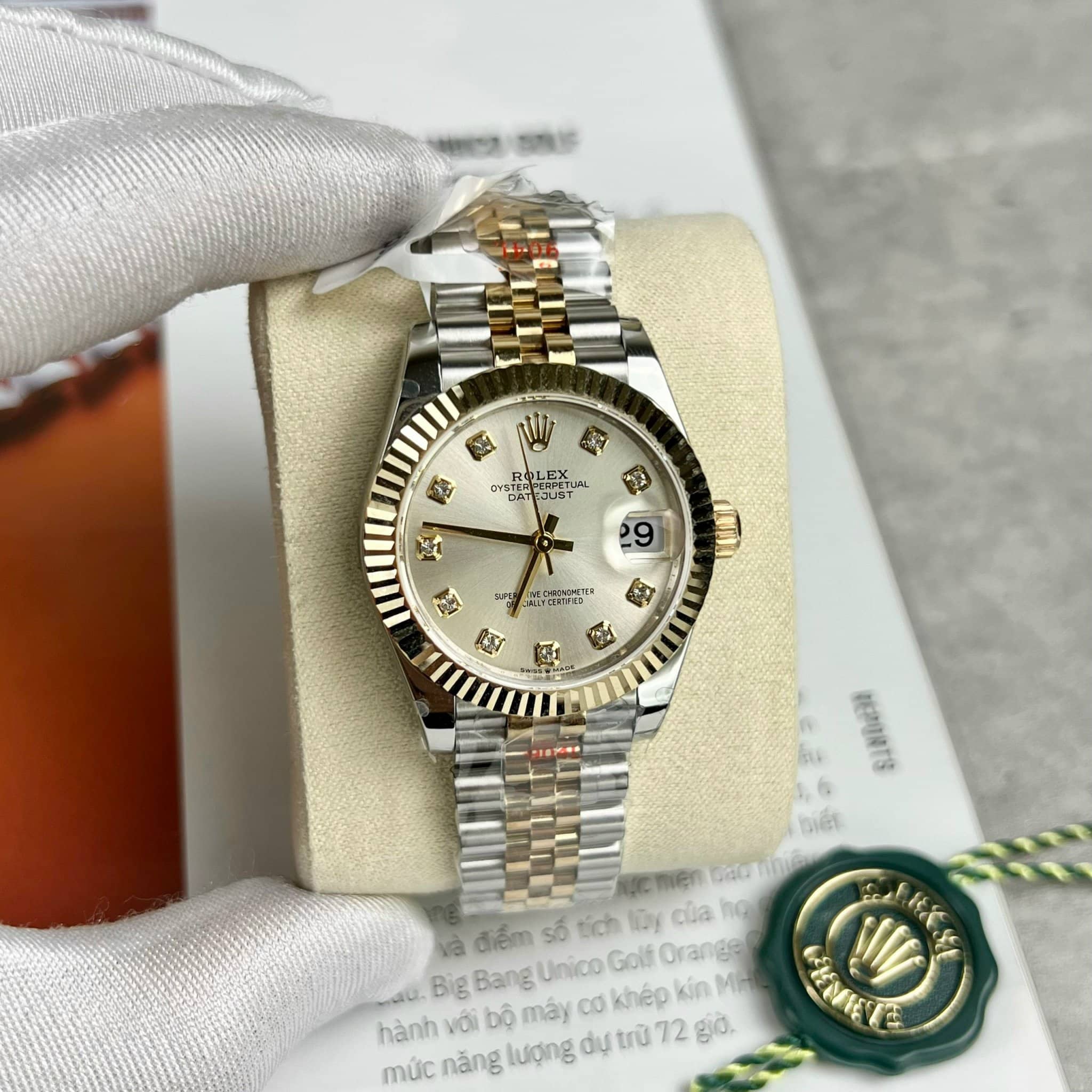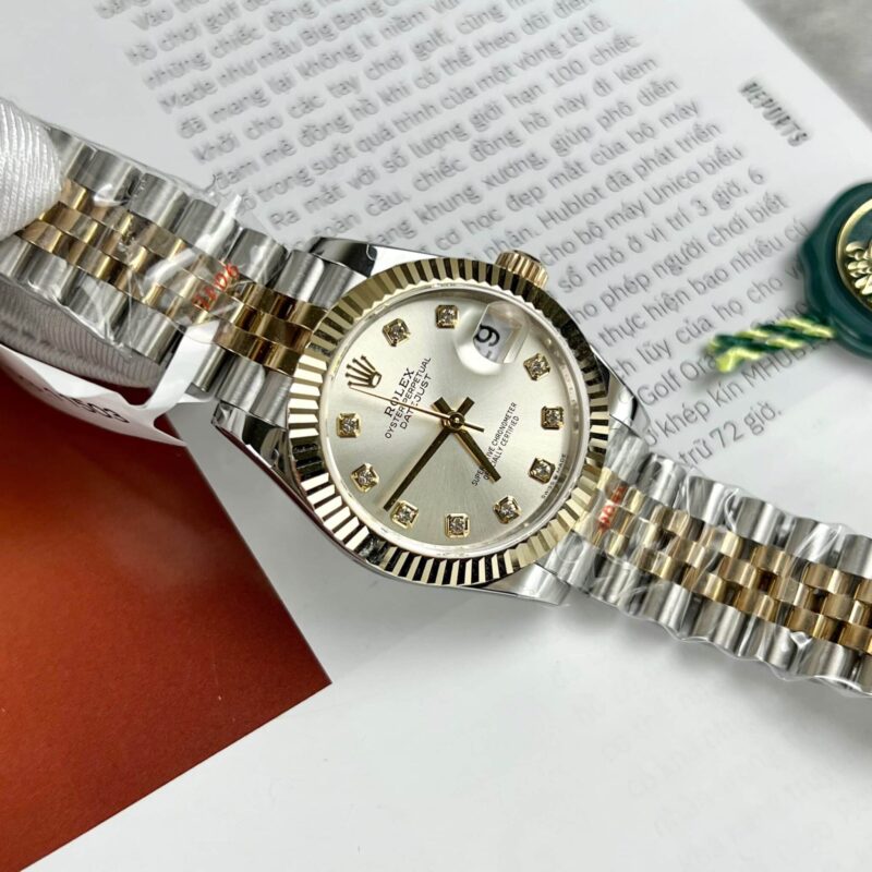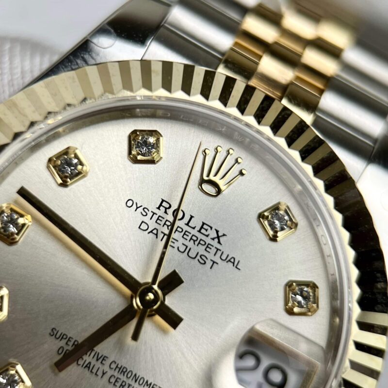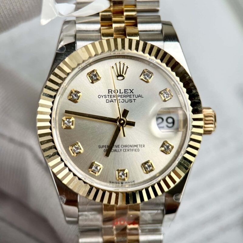 We are delighted to introduce the high-end 1:1 replica version of the Rolex Datejust 278273-0020 ladies’ watch. It features a beautiful 31mm size with a gold wrapped case, an silver dial, and stone-set hour markers, making it an exquisite choice for sophisticated women.