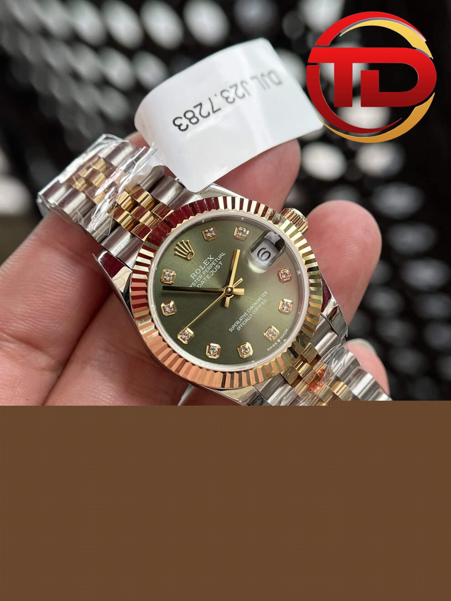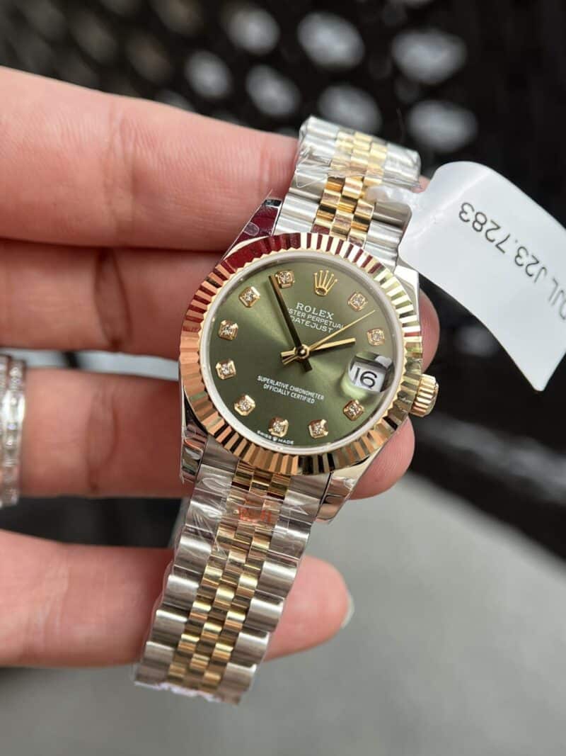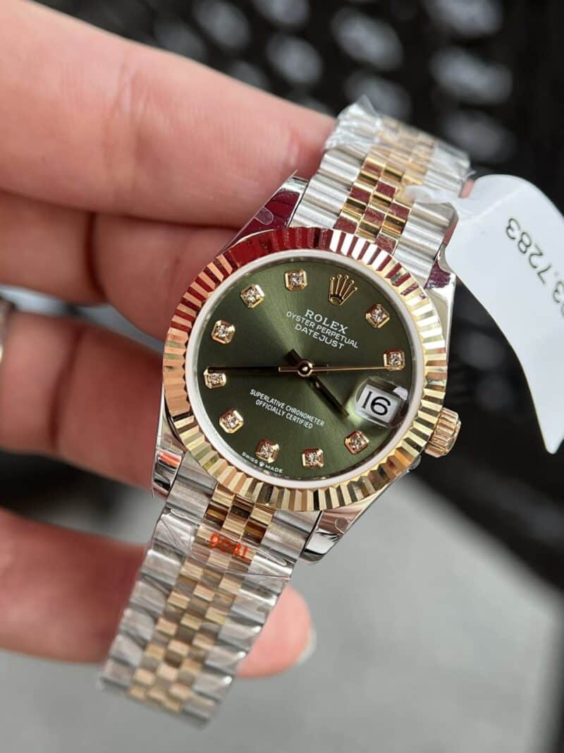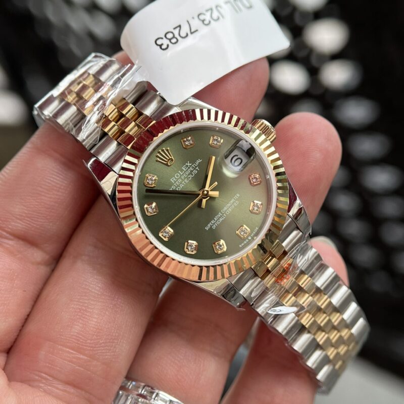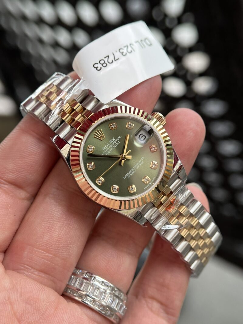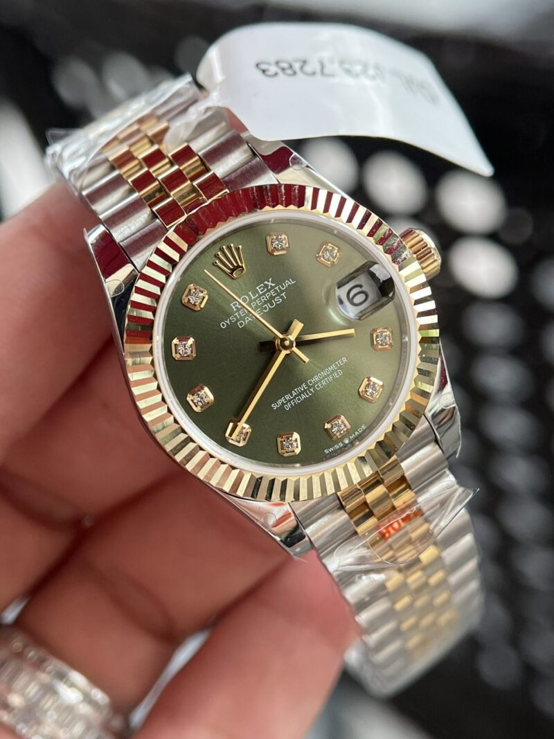 PyGlow (The Beautiful Watch World) is delighted to introduce the high-end 1:1 replica version of the Rolex Datejust 278273 ladies’ watch. It features a beautiful 31mm size with a gold capped case, an olive green dial, and stone-set hour markers, making it an exquisite choice for sophisticated women.