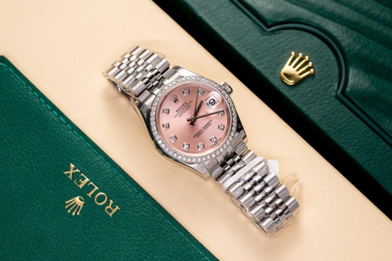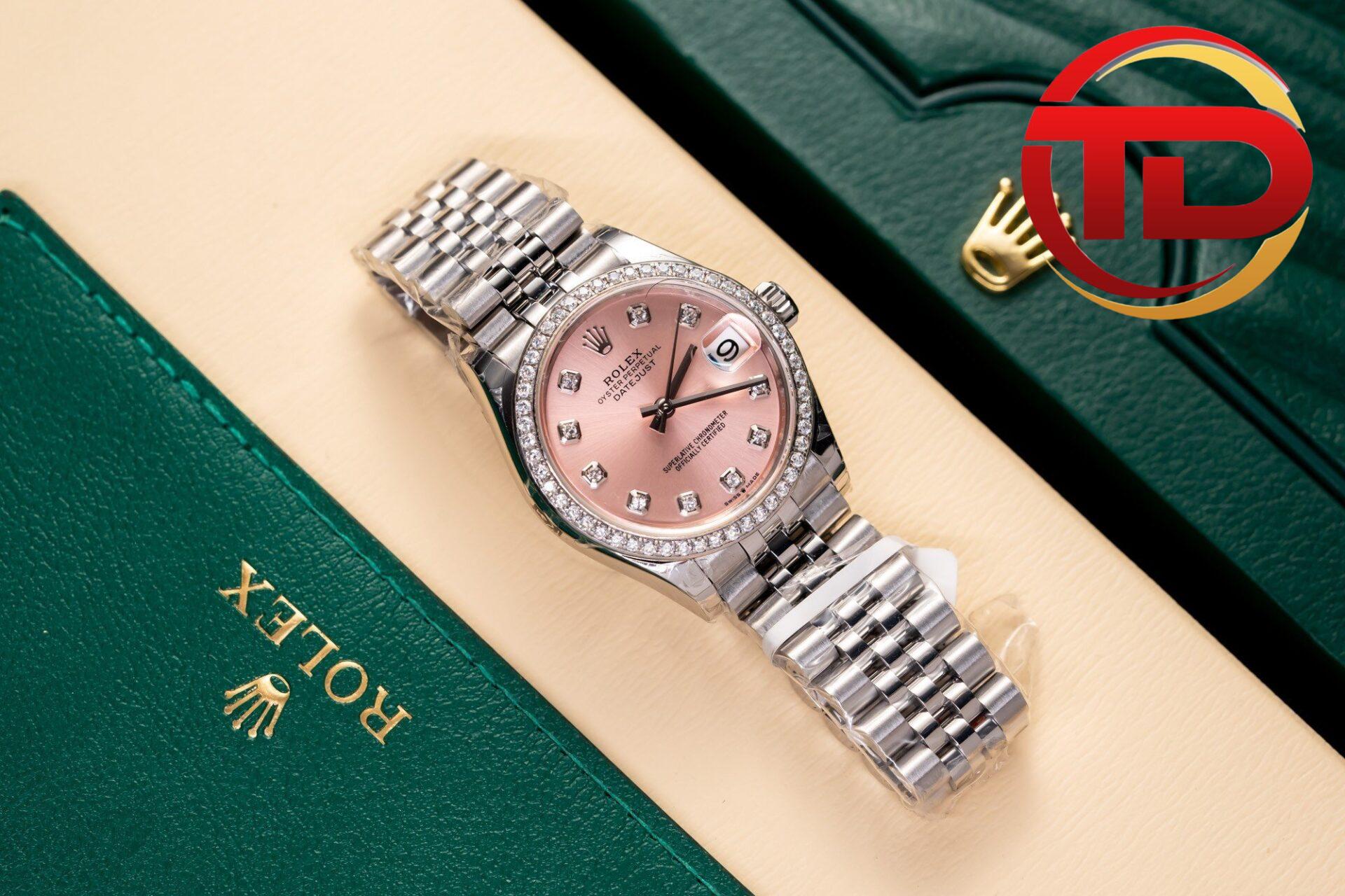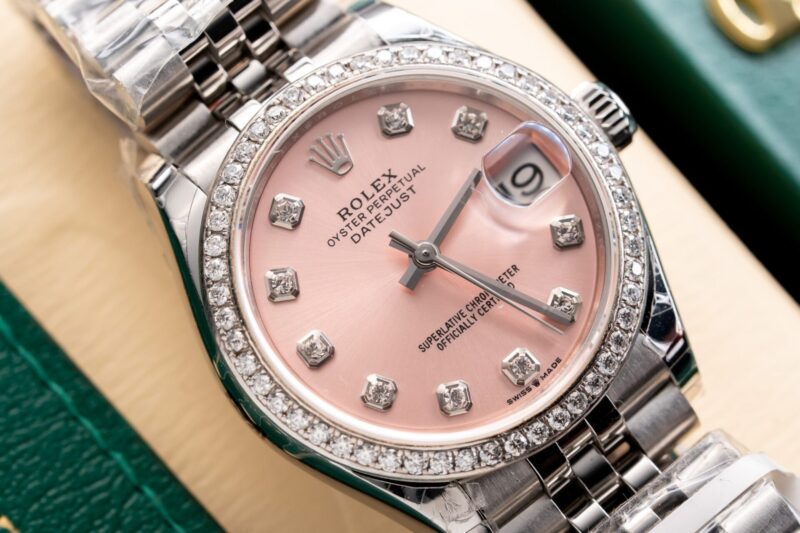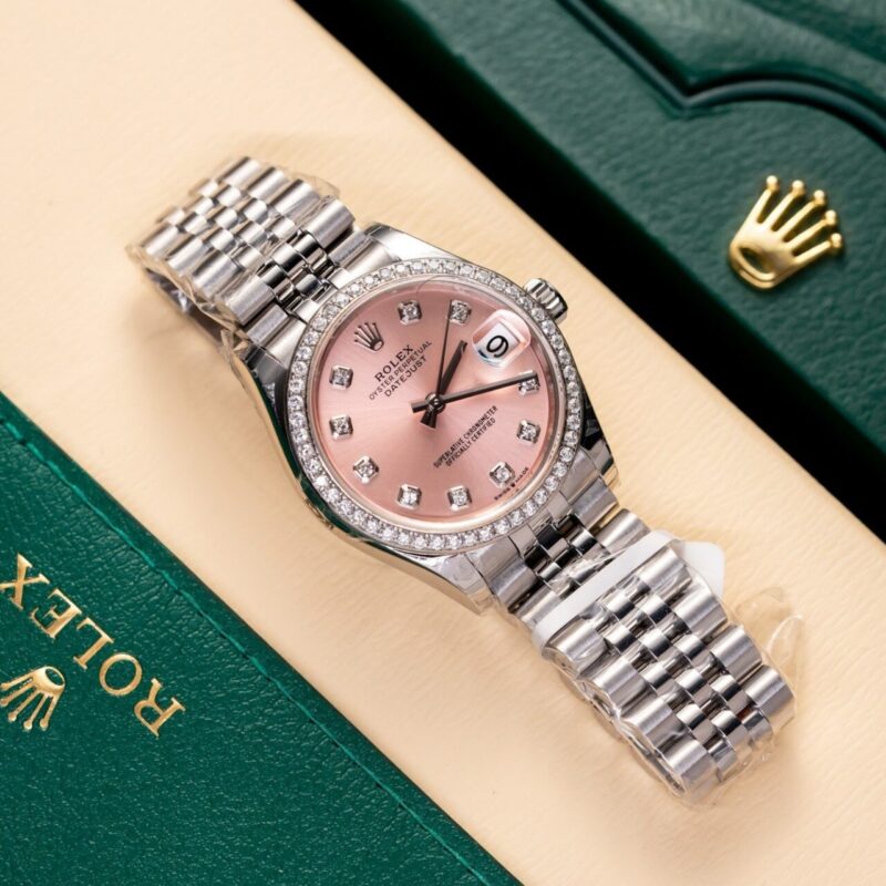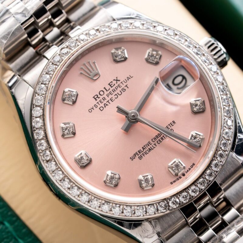 Beautiful Watch World is delighted to introduce the exquisite women’s Rolex Datejust 278383RBR watch, featuring a pink dial with a bezel adorned with moissanite diamonds, in a 1:1 replica version.