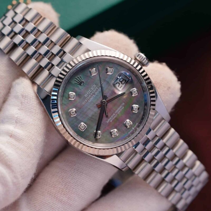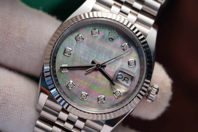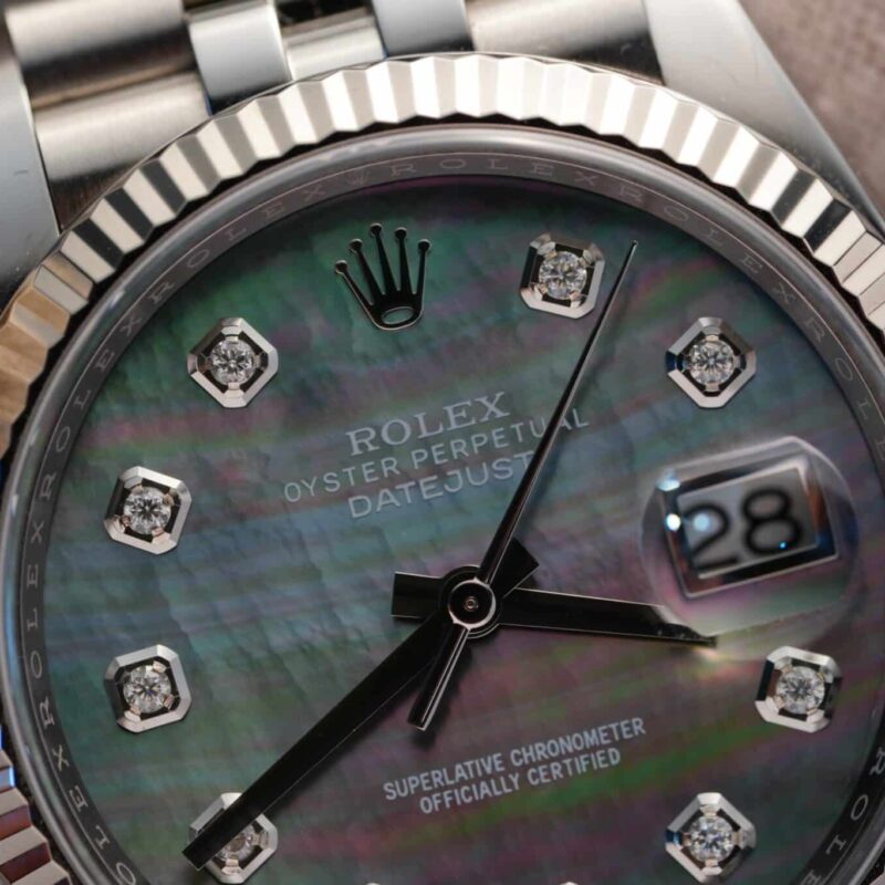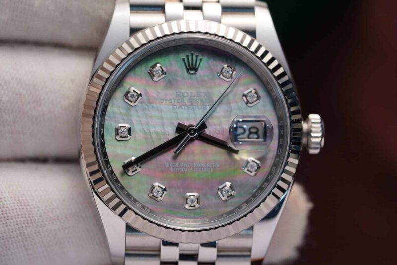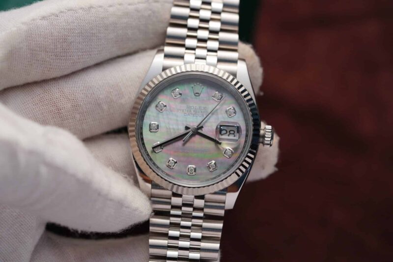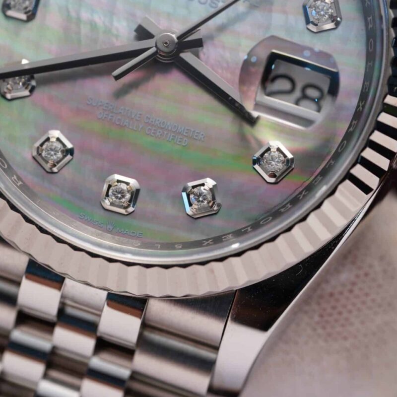 We are delighted to introduce the high-end 1:1 replica version, Rolex Datejust custom MOP dial moissanite numerals 36mm. This is the highest quality replica Rolex Datejust available in the market.