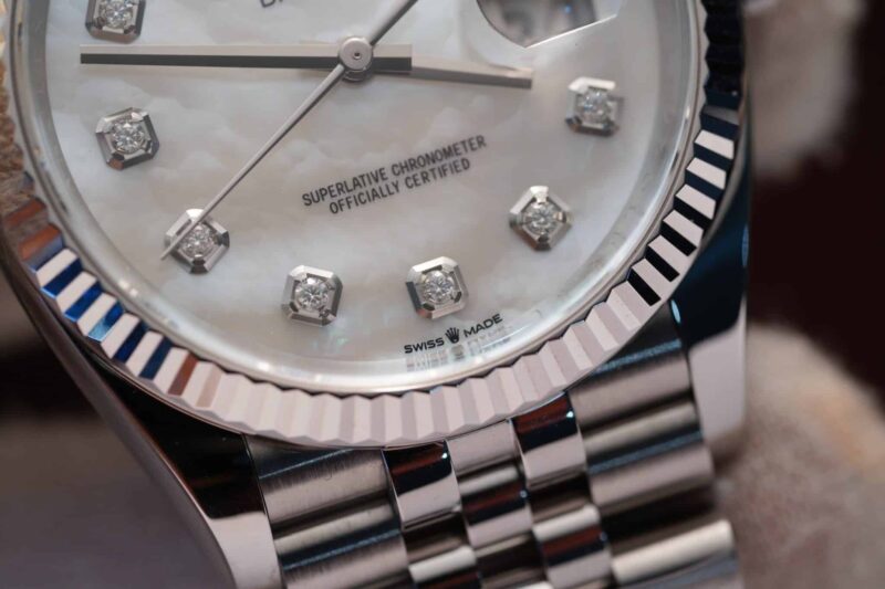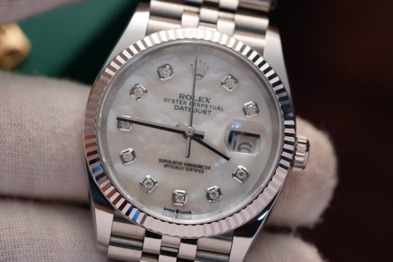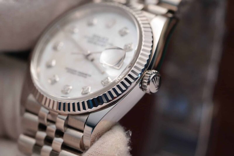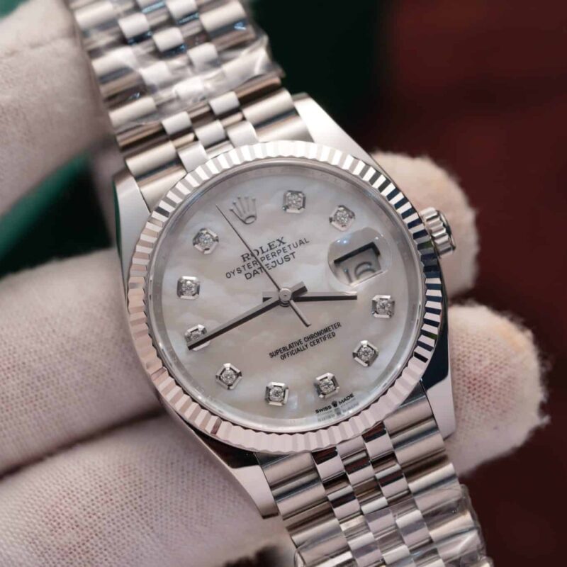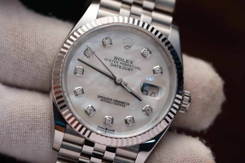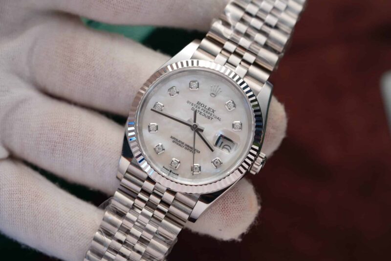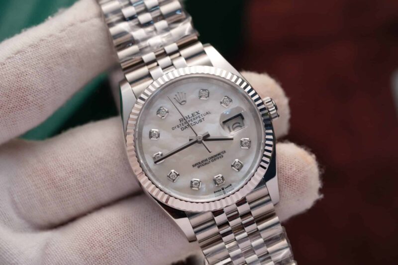 We are delighted to introduce the high-end 1:1 replica version, Rolex Datejust custom white MOP dial moissanite numerals 36mm. This is the highest quality replica Rolex Datejust available in the market.
