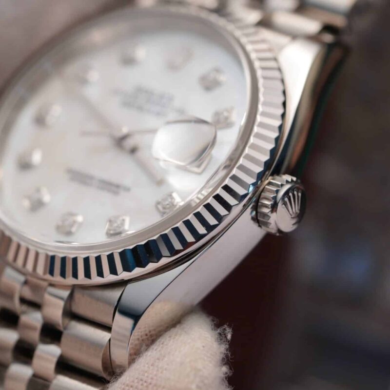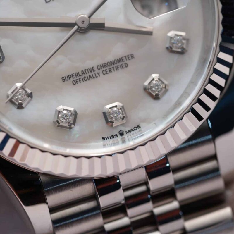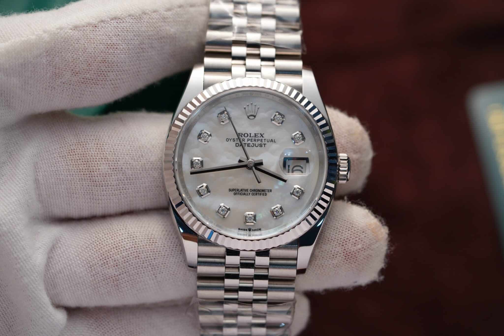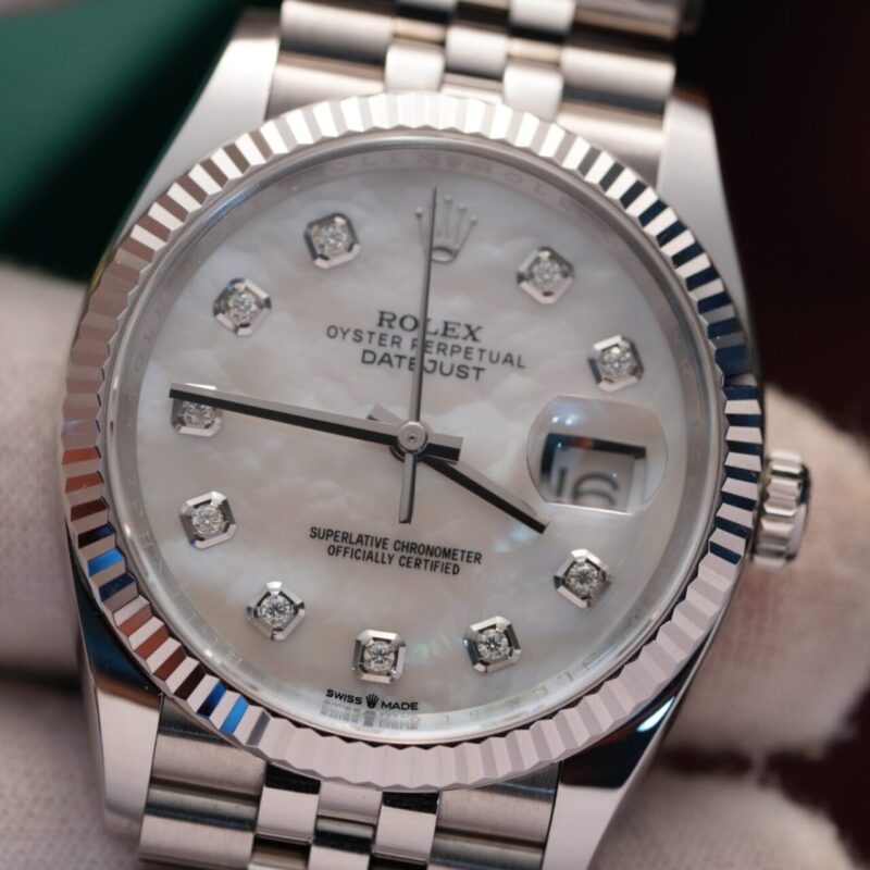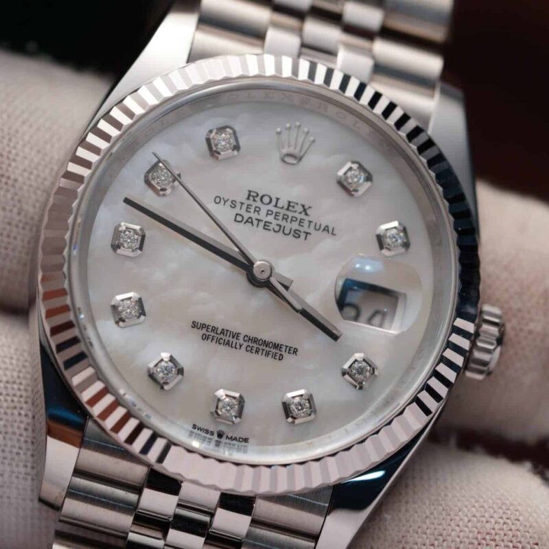 We are delighted to introduce the high-end 1:1 replica version, Rolex Datejust custom white MOP dial moissanite numerals 36mm. This is the highest quality replica Rolex Datejust available in the market.