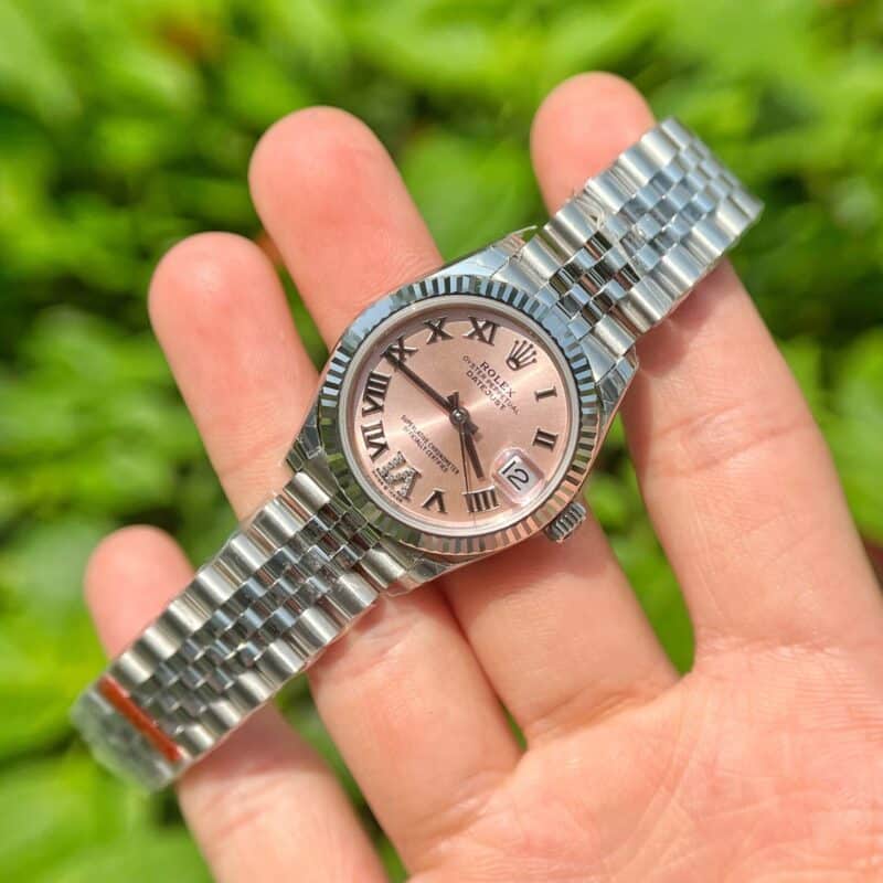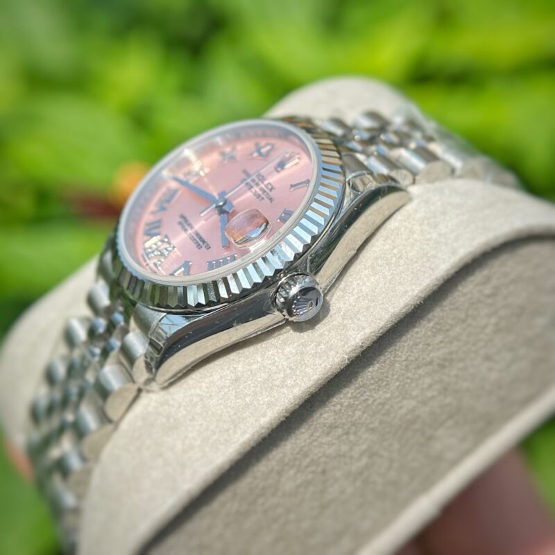 PyGlow hân hạnh giới thiệu phiên bản đồng hồ nữ Rolex Datejust mặt số màu hoa hồng cọc số la mã replica 1:1 với size 31mm lên tay cực xinh dành cho những quý cô.