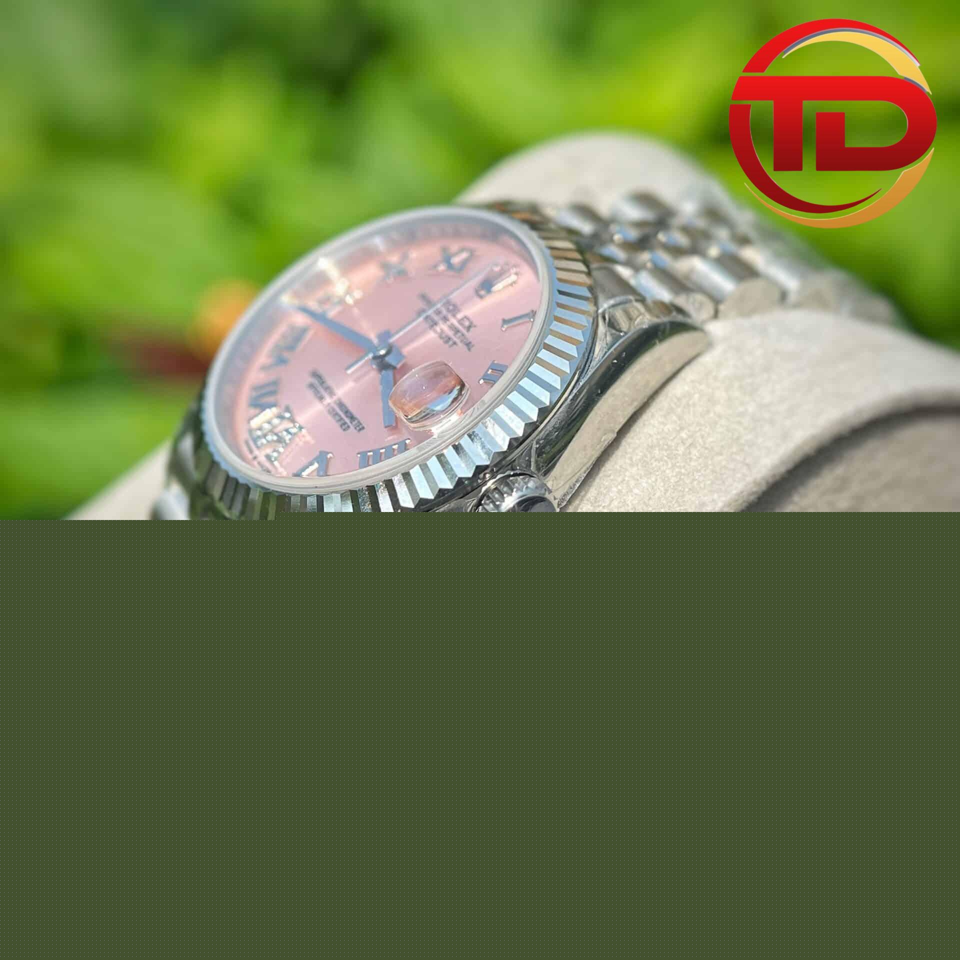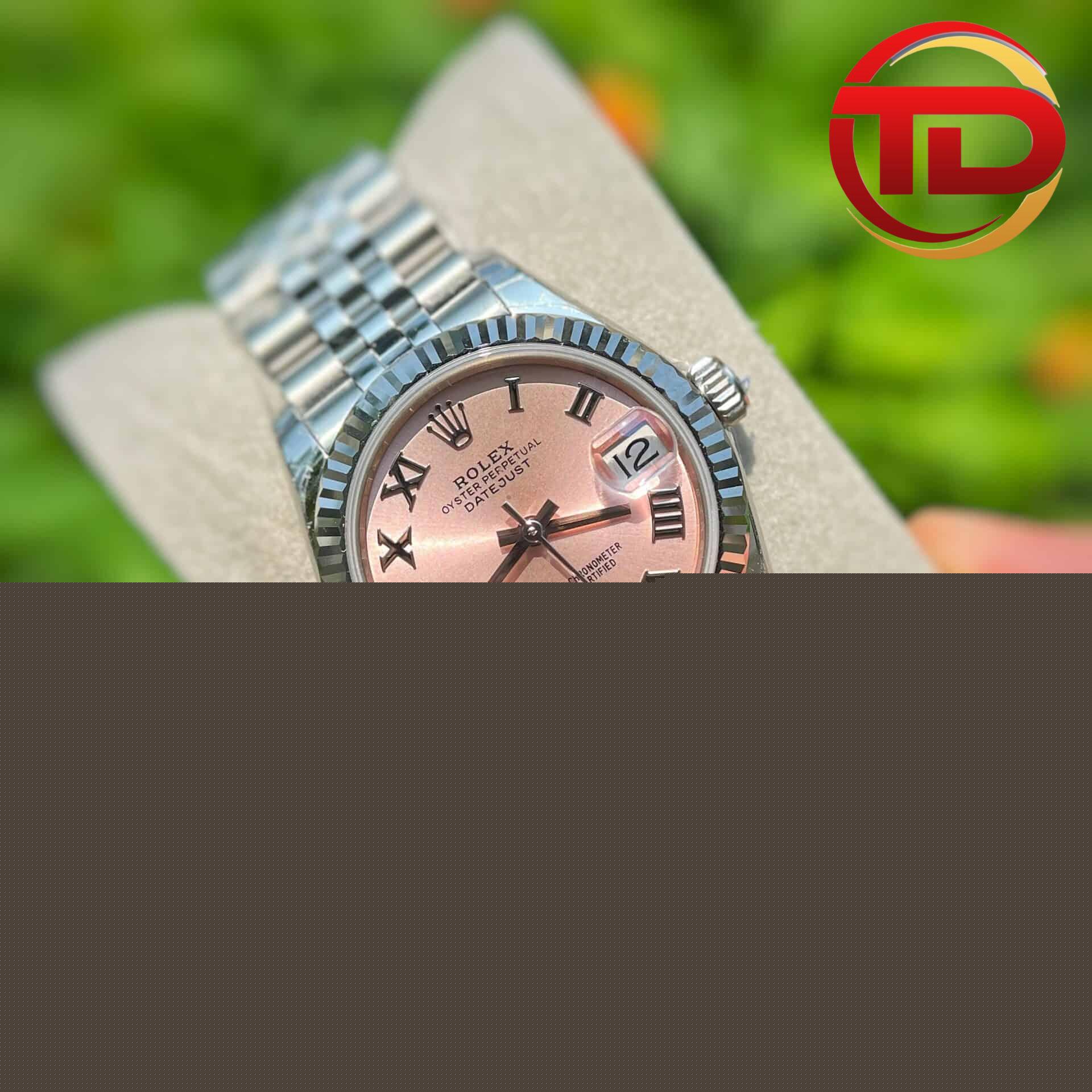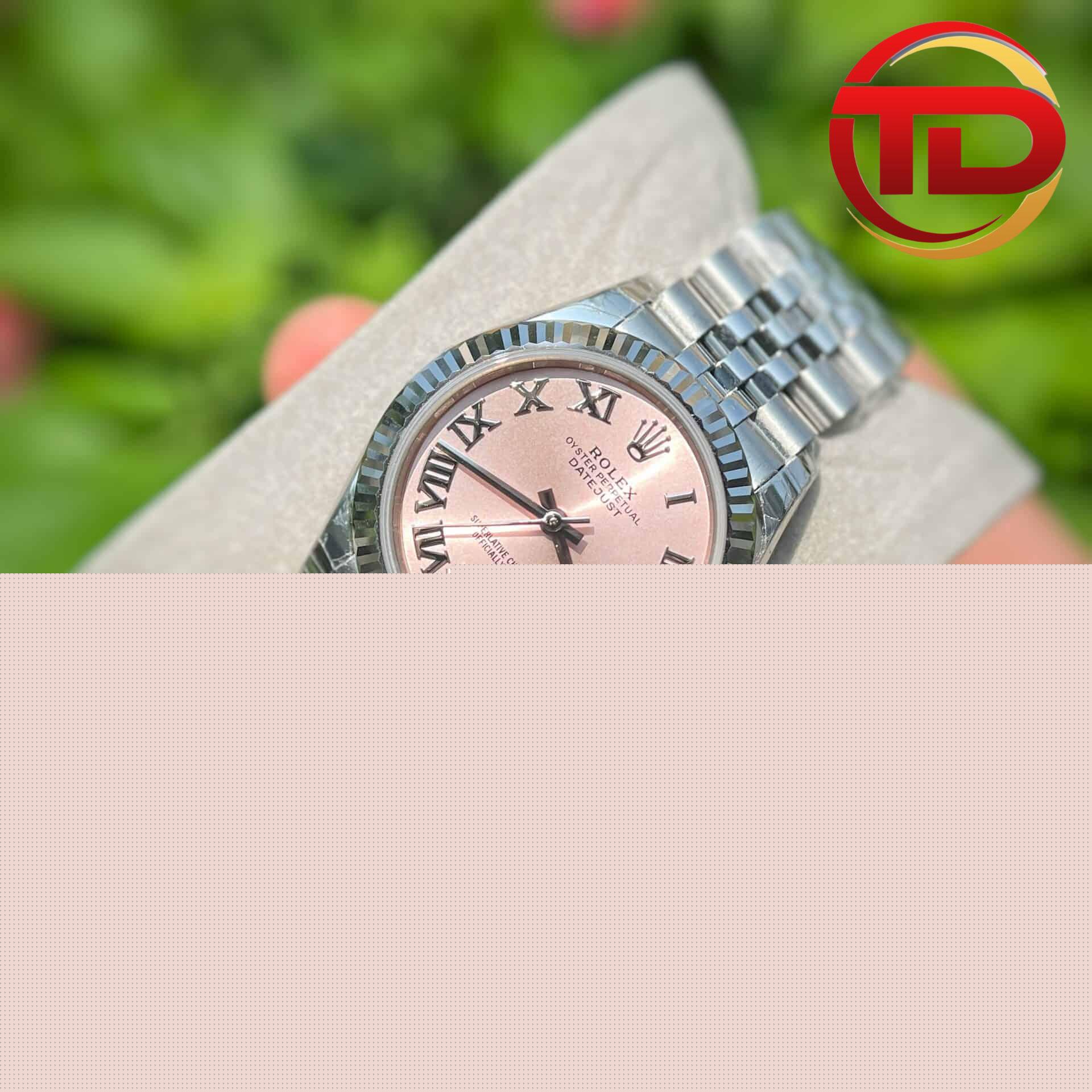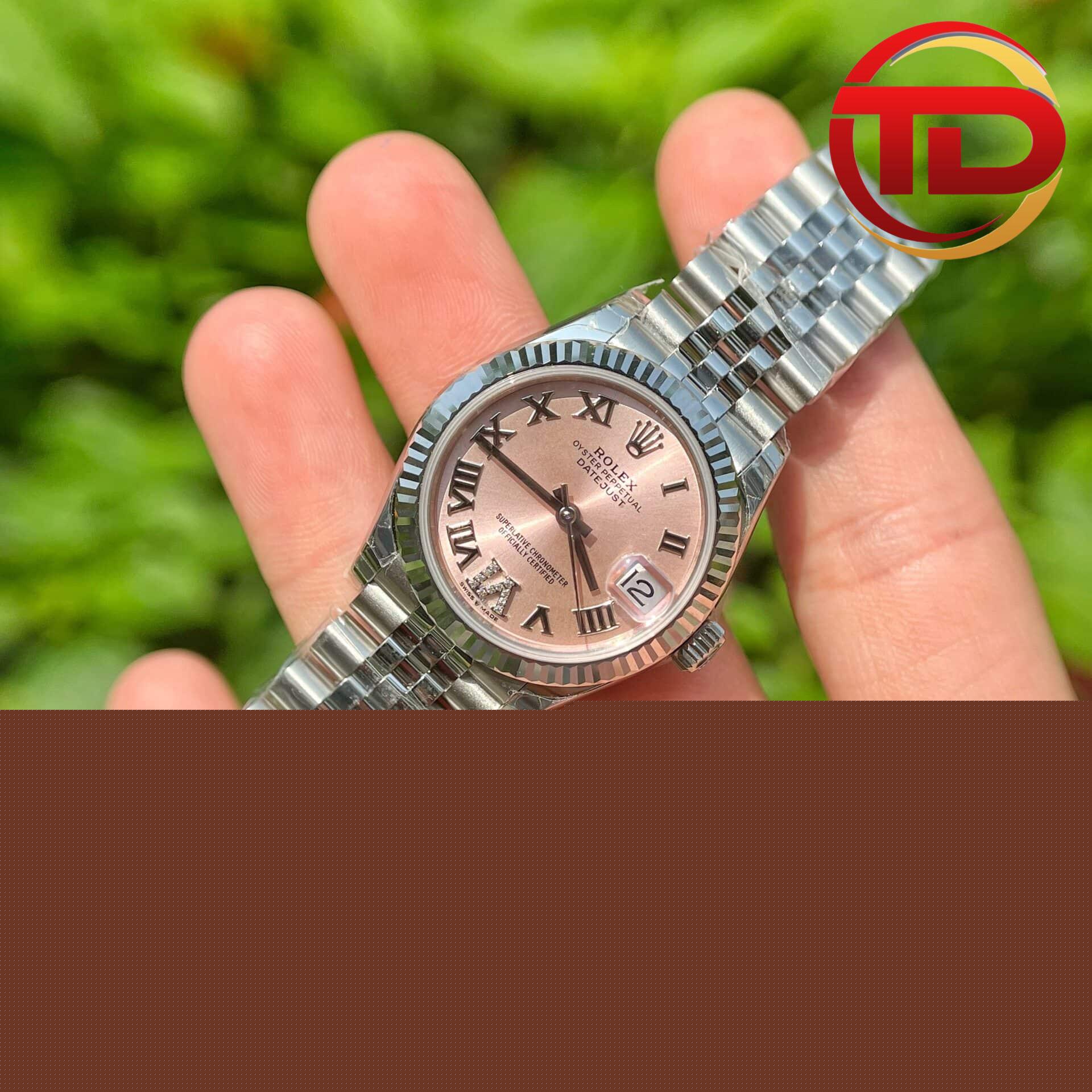PyGlow hân hạnh giới thiệu phiên bản đồng hồ nữ Rolex Datejust mặt số màu hoa hồng cọc số la mã replica 1:1 với size 31mm lên tay cực xinh dành cho những quý cô.