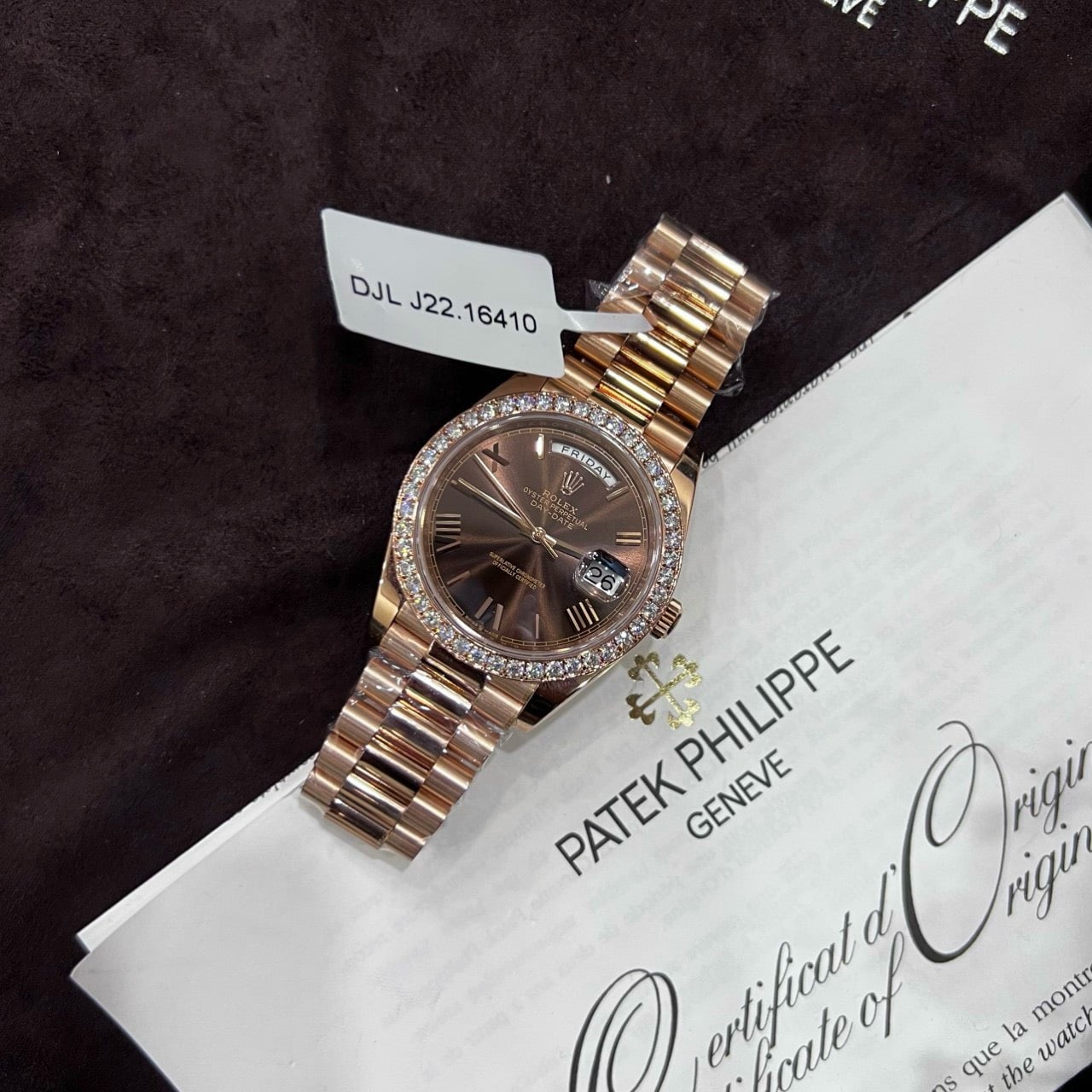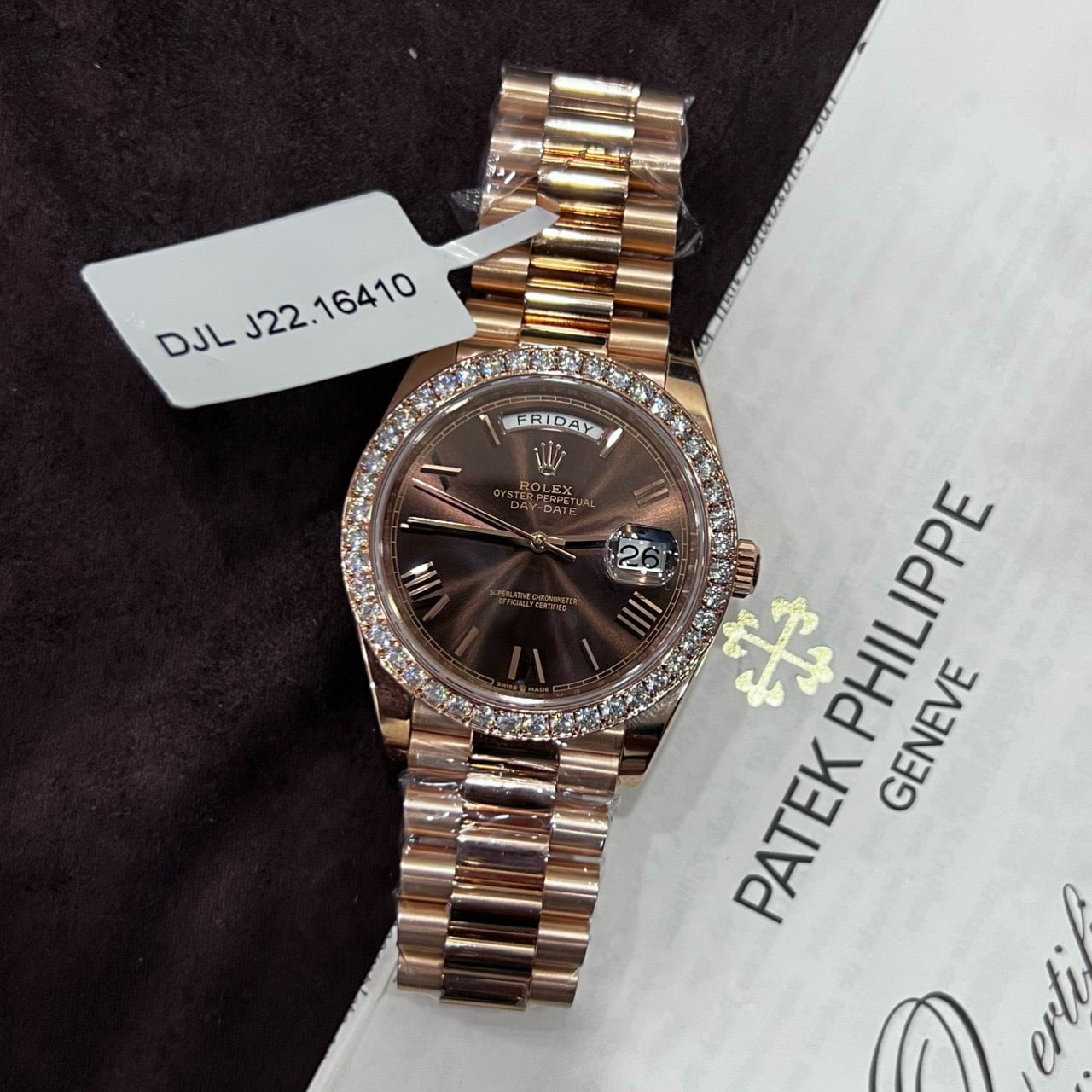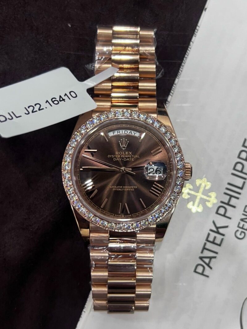 ROLEX DAY-DATE CHOCOLATE DIAL ROMAN NUMERALS 18K GOLD WRAPPED CUSTOM MOISSANITE BEZEL 40MM