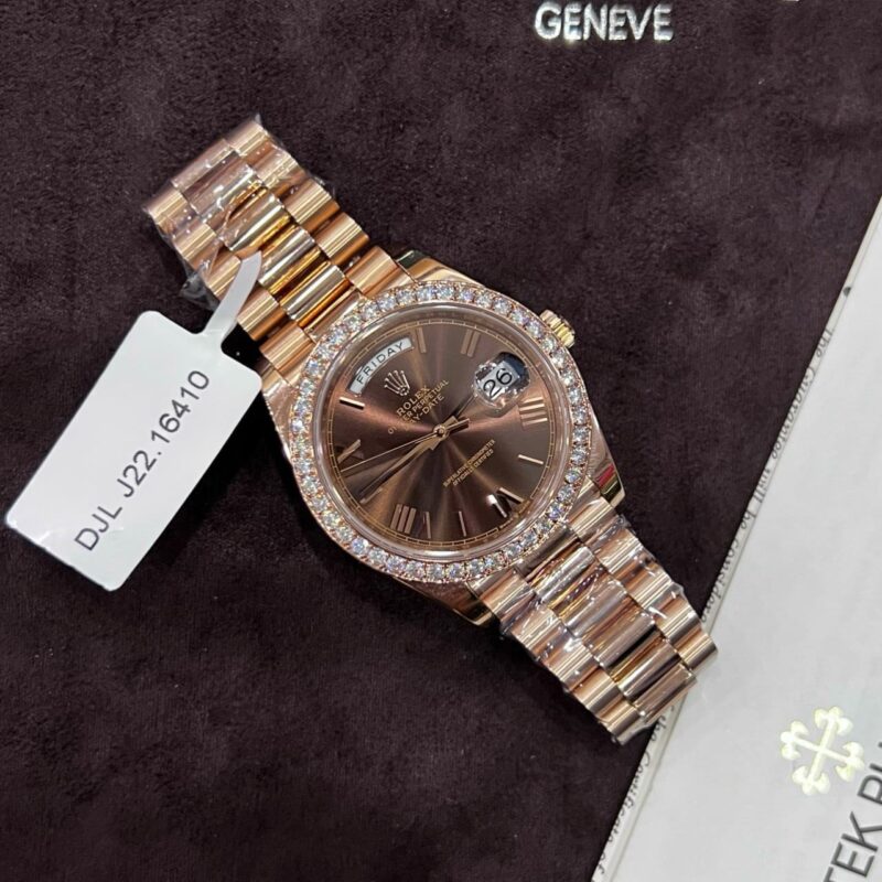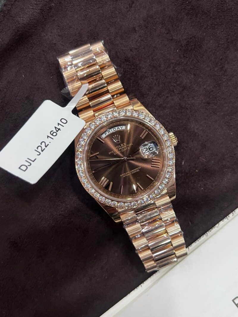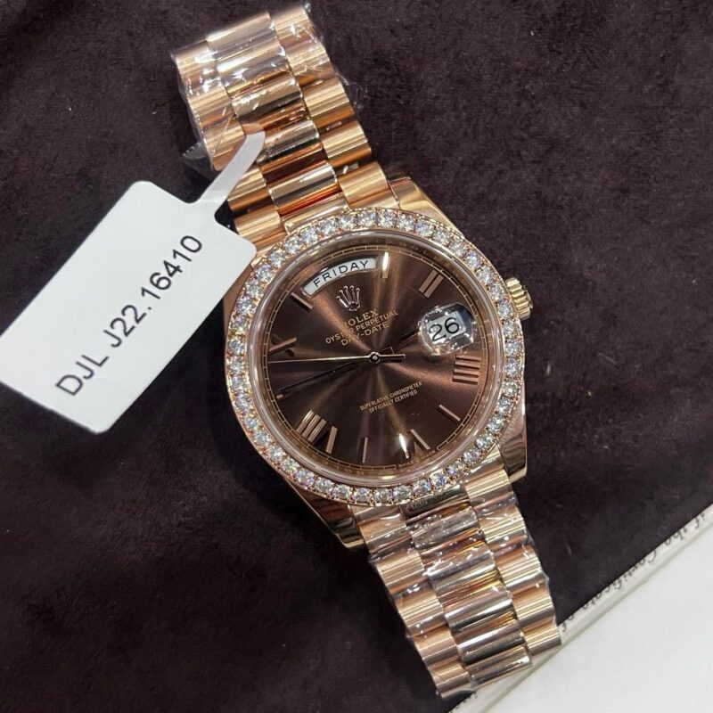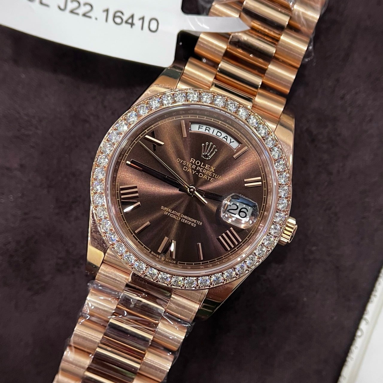 ROLEX DAY-DATE CHOCOLATE DIAL ROMAN NUMERALS 18K GOLD WRAPPED CUSTOM MOISSANITE BEZEL 40MM