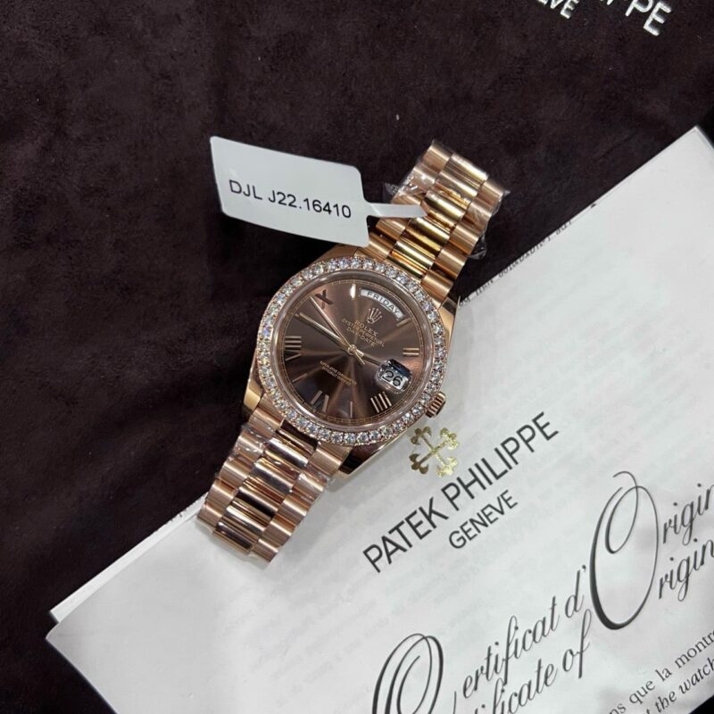 DETAILS OF THE ROLEX DAY-DATE CHOCOLATE DIAL ROMAN NUMERALS 18K GOLD WRAPPED CUSTOM MOISSANITE BEZEL 40MM WEIGHS OVER 175 GRAMS FROM GM FACTORY.