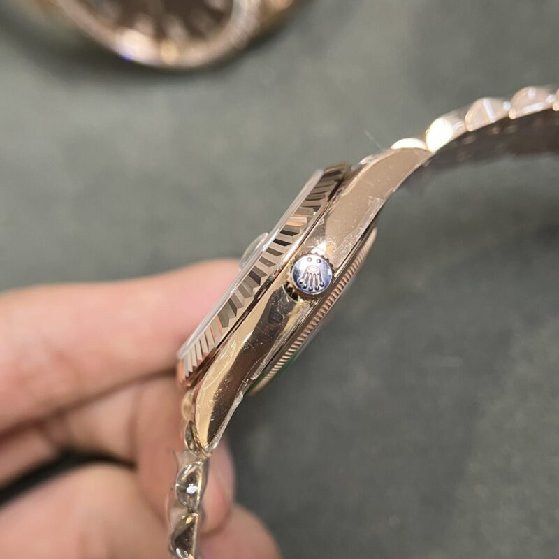 PyGlow trân trọng giới thiệu phiên bản đồng hồ Rolex Day-Date mặt số chocolate cọc số đá baguette fake cao cấp 40mm phiên bản top quality.