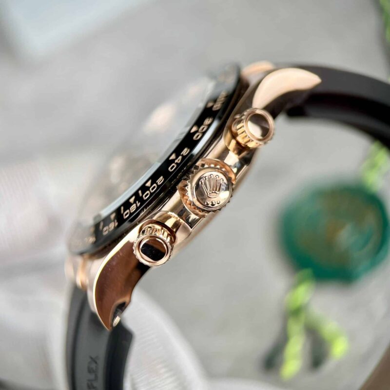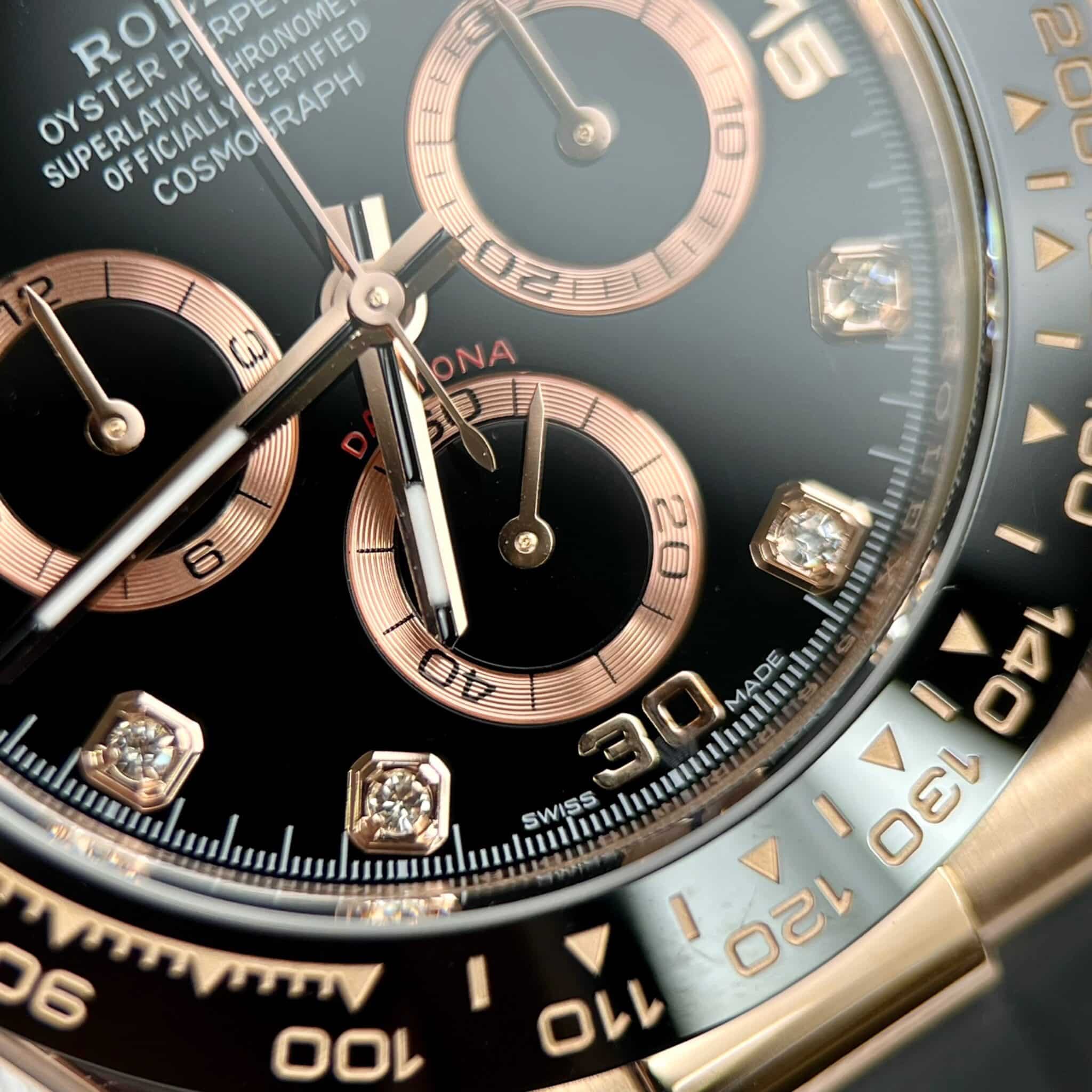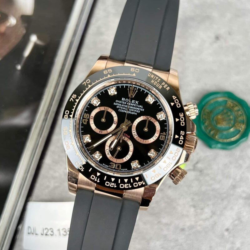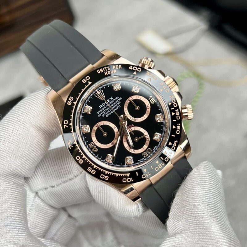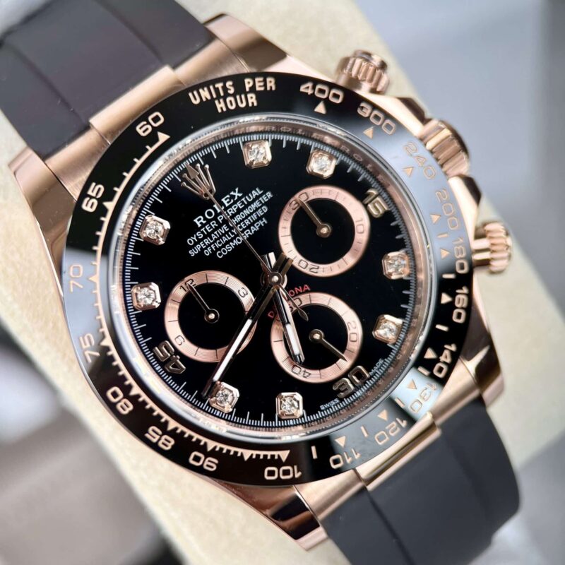 Taking its place among the Rolex watch family at Beautiful Watch World today is the Rolex Cosmograph Daytona reference number 116515LN, featuring a black and diamond-set dial with 18k rose gold wrapped and oysterflex strap best quality replica.