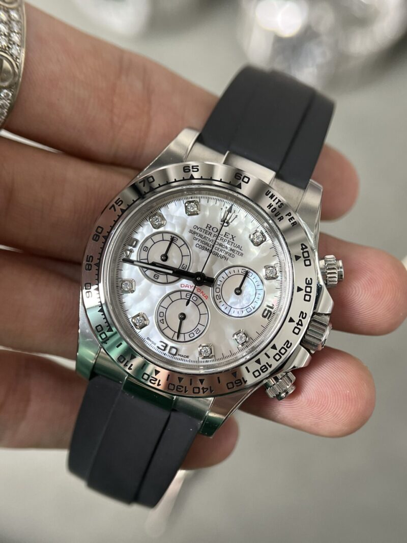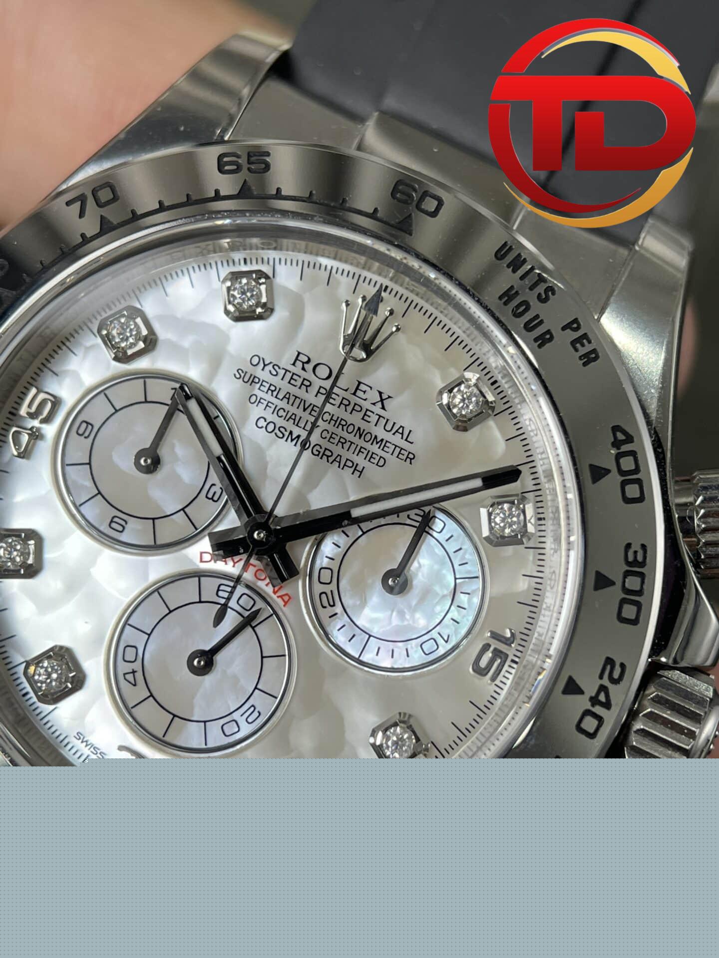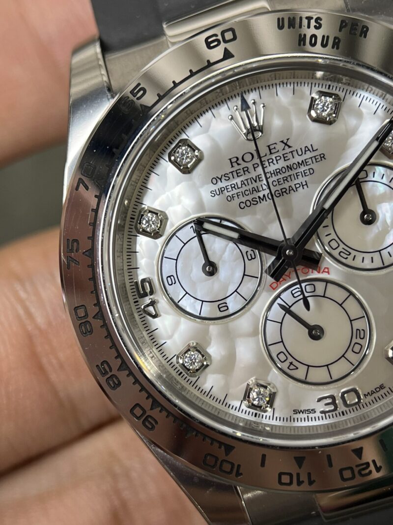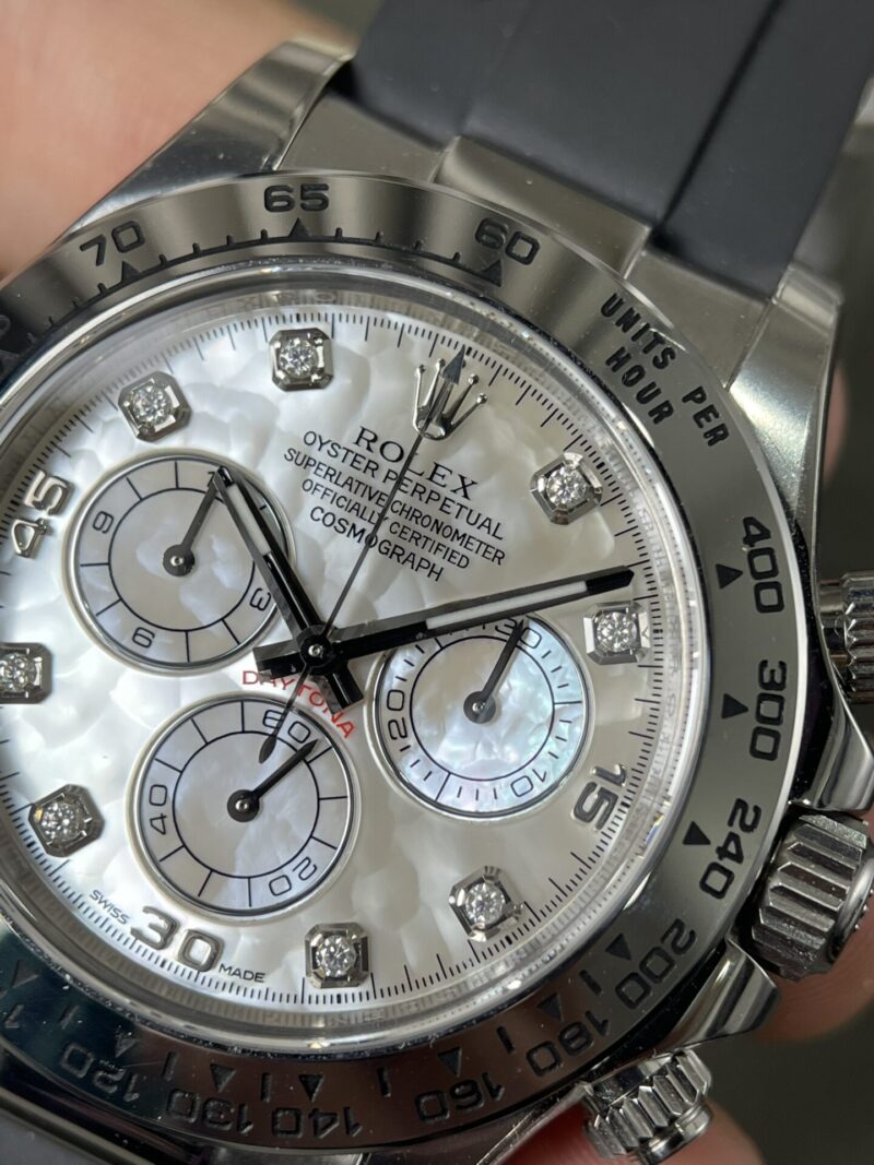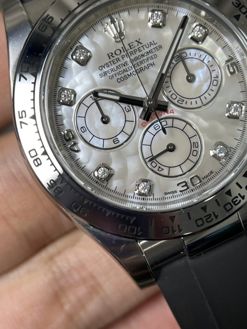 PyGlow introduces the Rolex Cosmograph Daytona replica watch with a Mother of Pearl dial and diamond moissanite hour markers from the BT Factory.