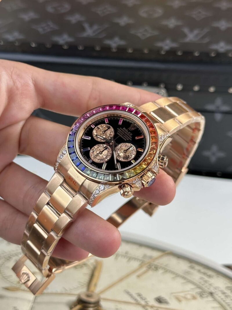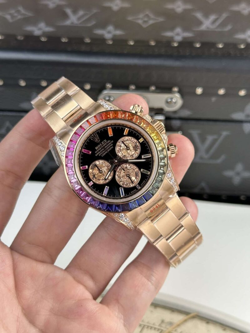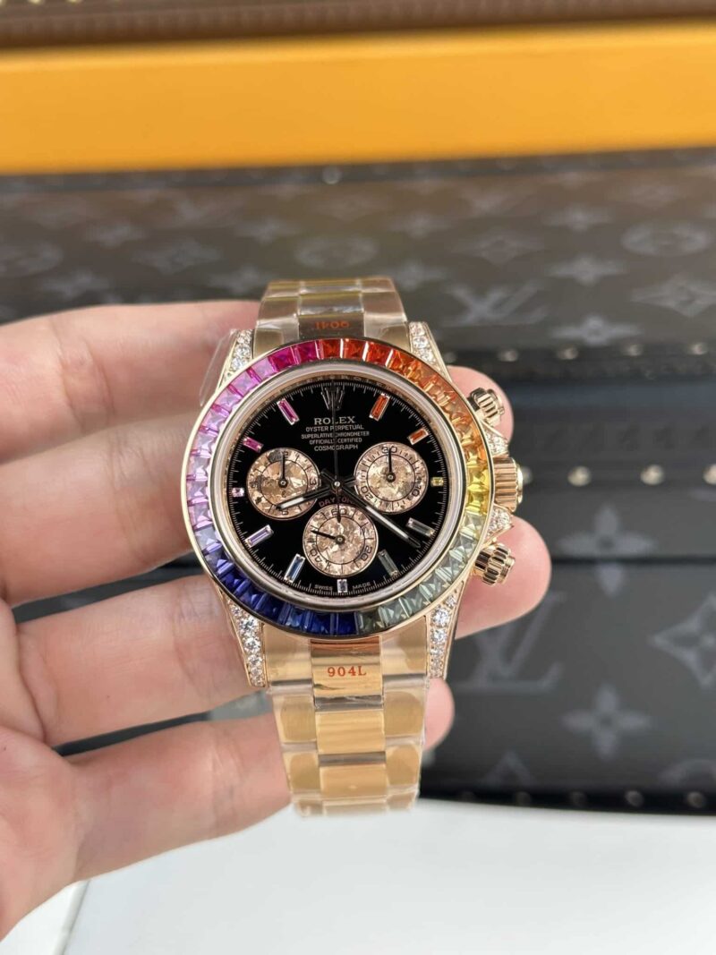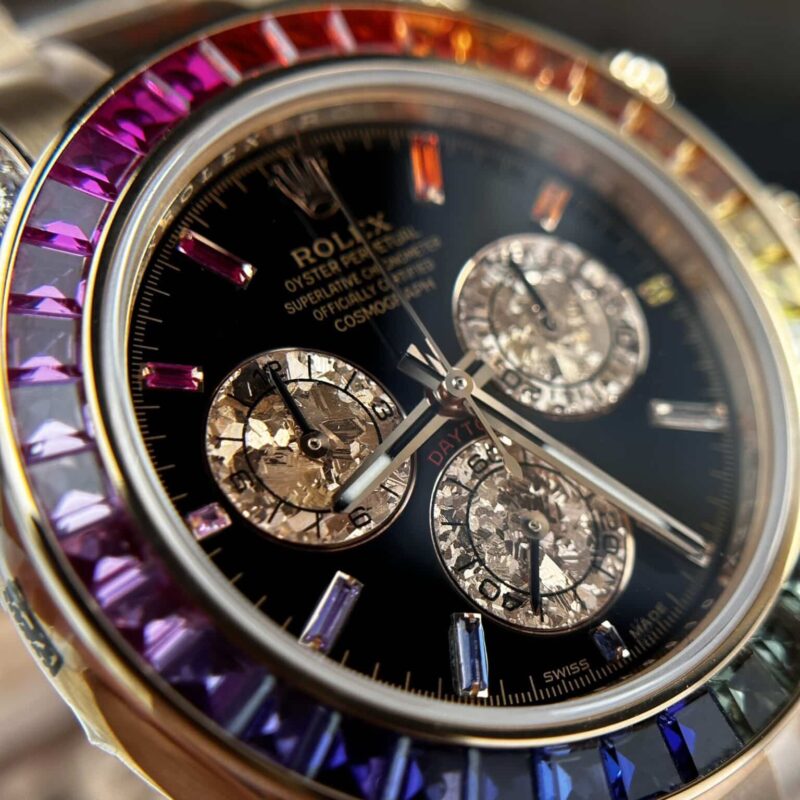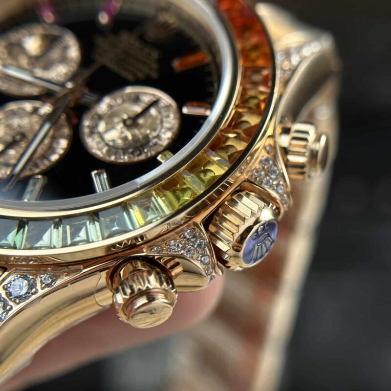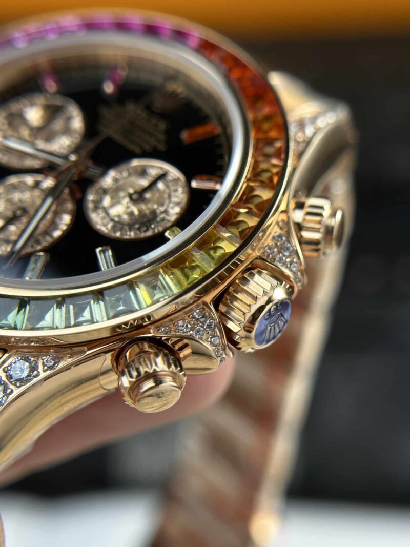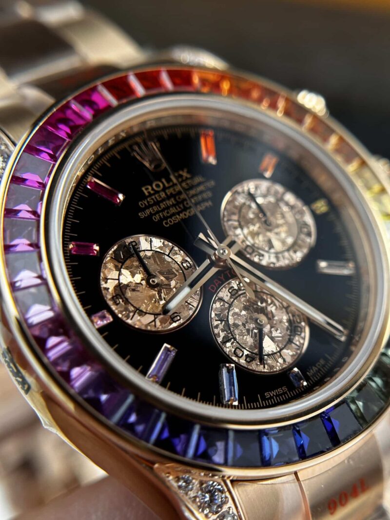 We are pleased to introduce to our valued customer the Rolex Daytona Rainbow 116595RBOW black dial with 4130 movement super clone 40mm. This is the highest quality replica Rolex Daytona rainbow available in the market.