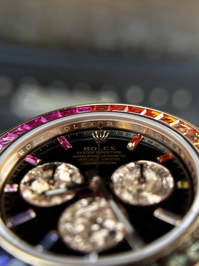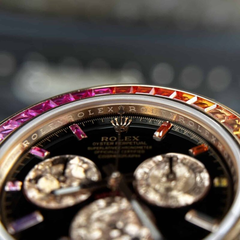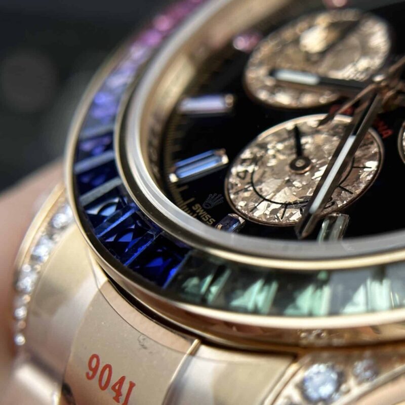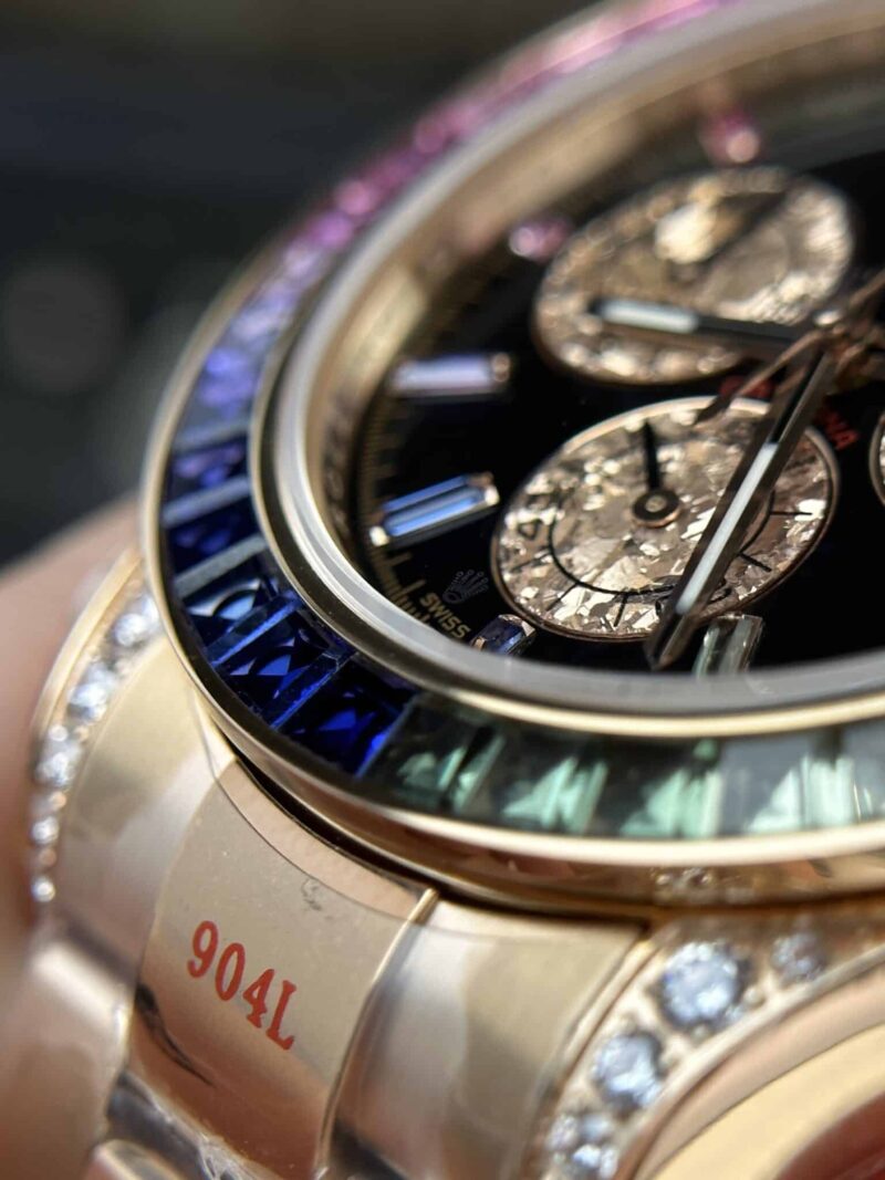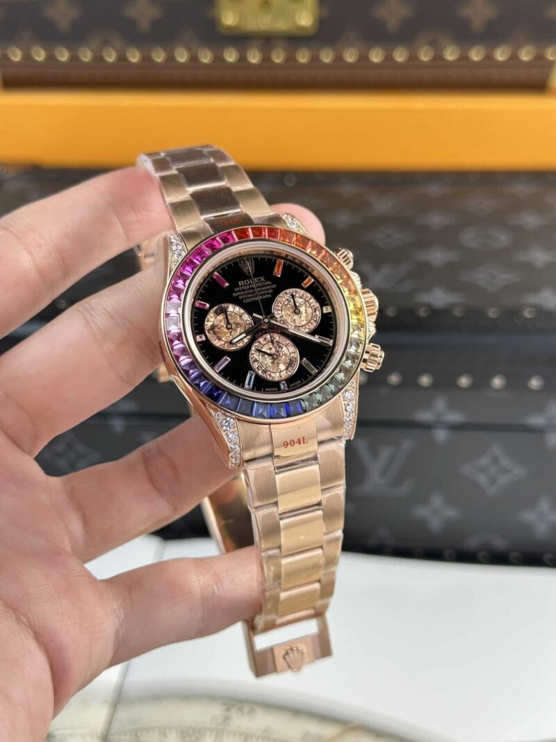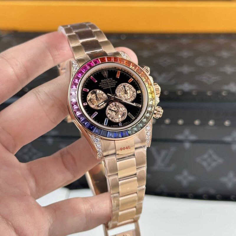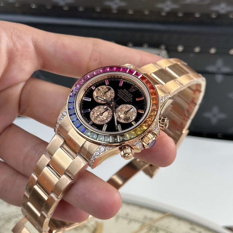 We are pleased to introduce to our valued customer the Rolex Daytona Rainbow 116595RBOW black dial with 4130 movement super clone 40mm. This is the highest quality replica Rolex Daytona rainbow available in the market.