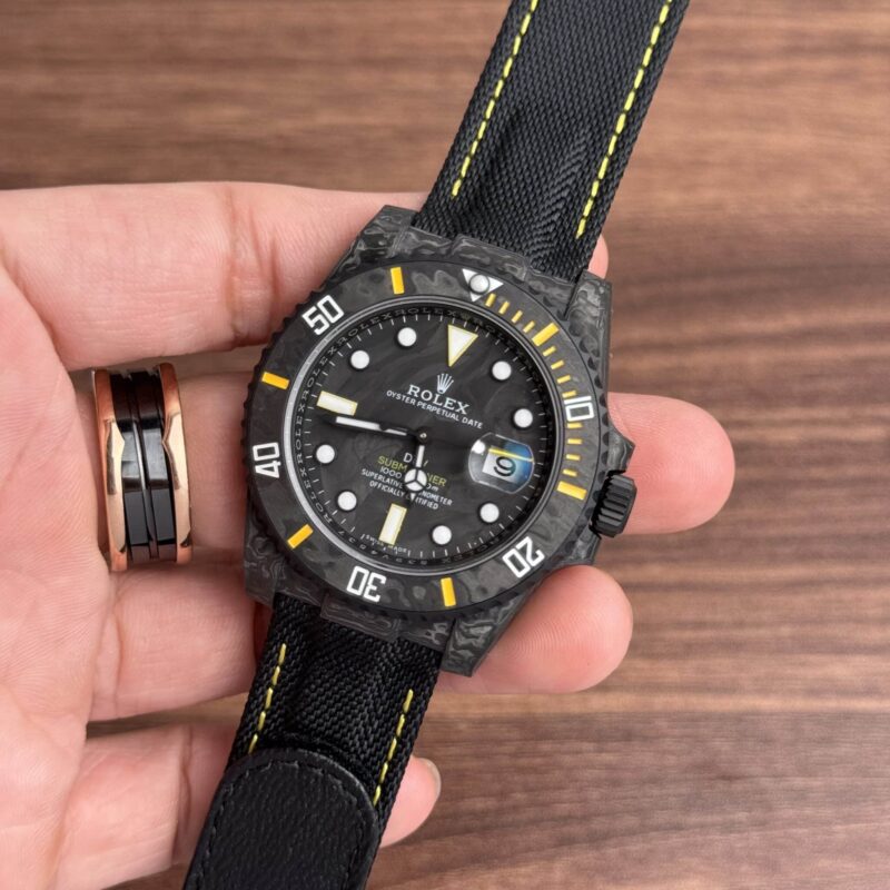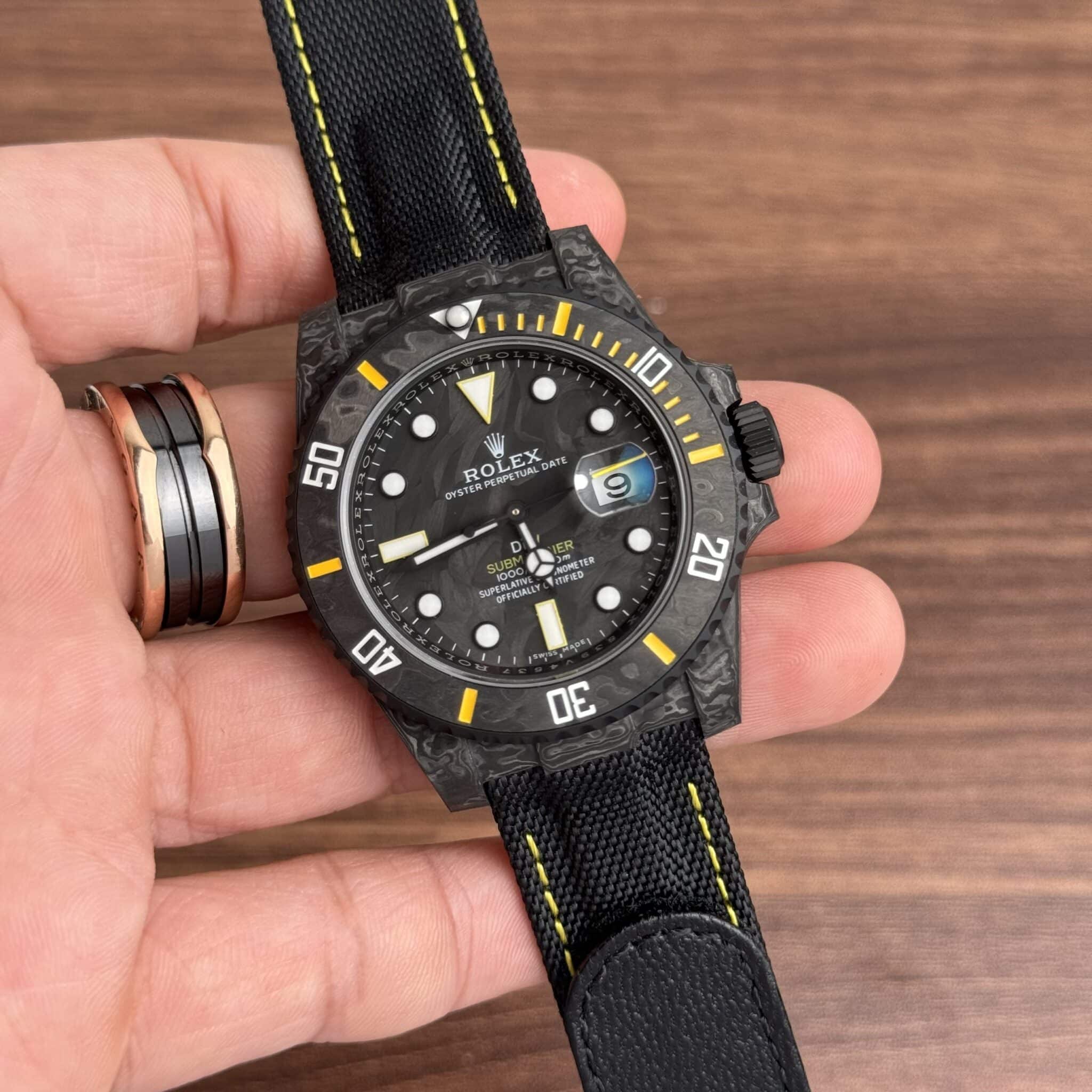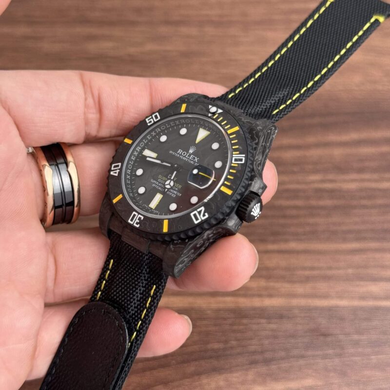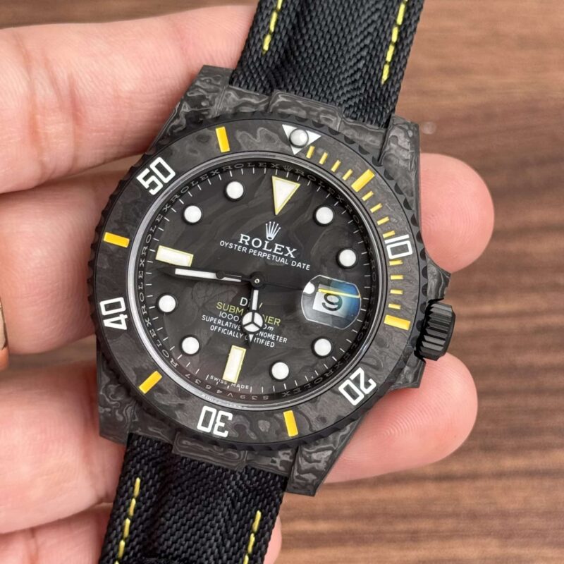 PyGlow is proud to introduce to our valued customers a special swiss replica watches – Rolex Submariner DiW carbon fiber black yellow canvas strap top quality 40mm from VS factory. This is currently the best quality replica watch version of the Rolex Submariner DiW available in the market.