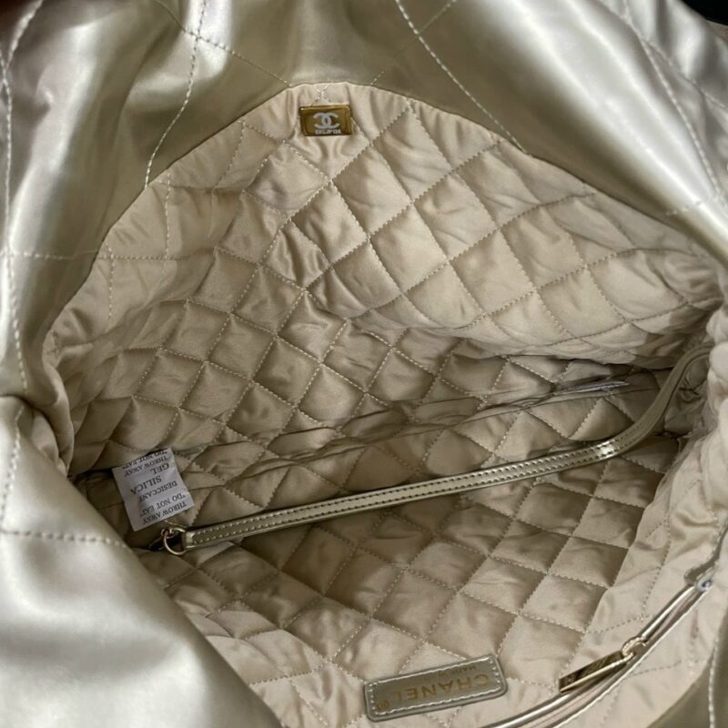 Ngăn túi rộng rãi có thể đựng được nhiều đồ dùng cần thiết mới lớp lót được may trám chắc chắn bên trong. Điểm nhắn tạp sự nổi bật và ấn tượng với tên thương hiệu Chanel bên trong và khóa vàng ở giữa mặt túi trước.