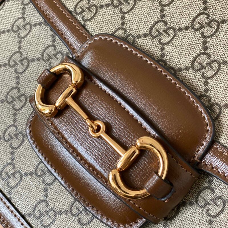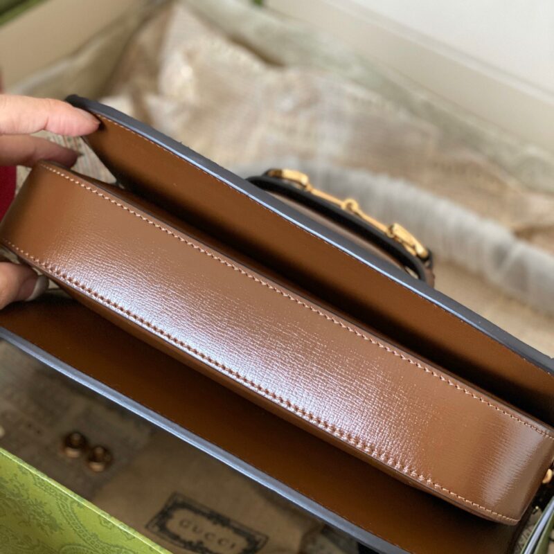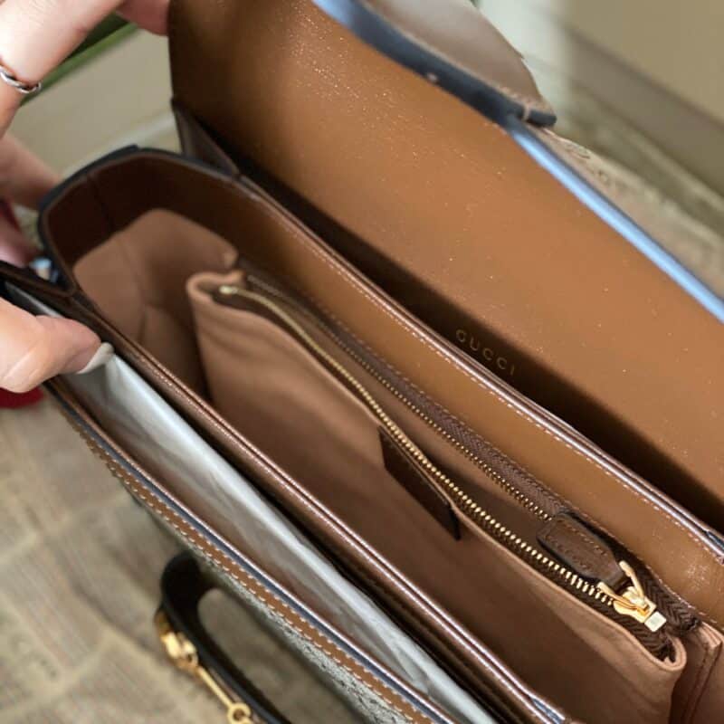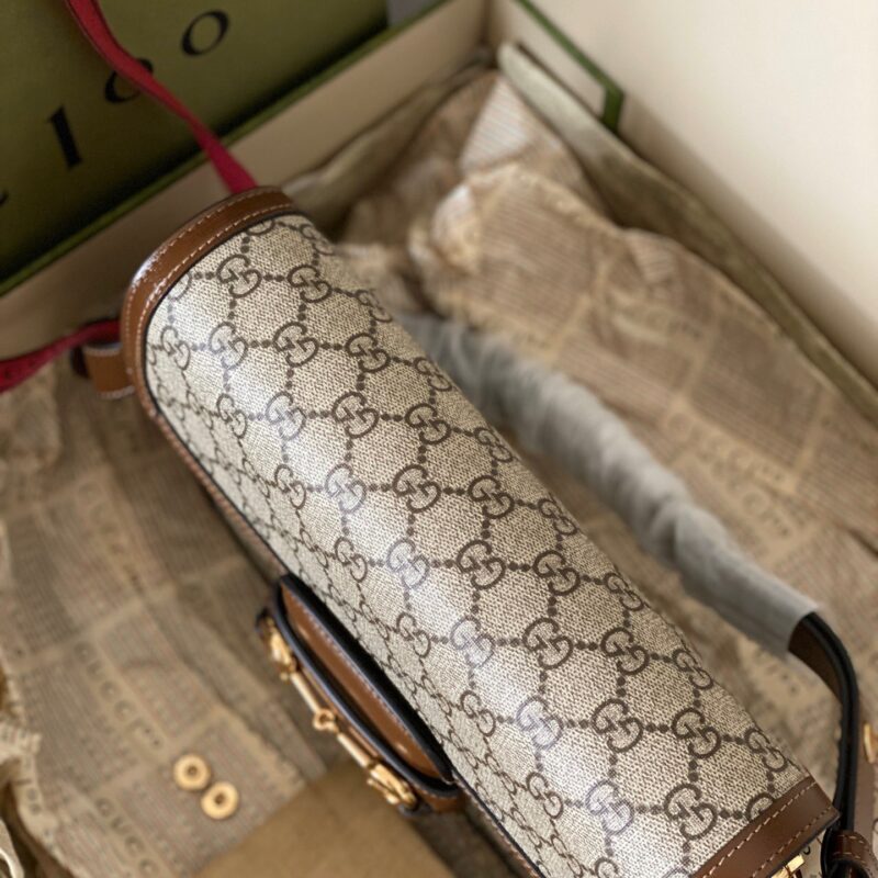 Vẫn là Gucci Horsebit 1955 nhưng phiên bản này được làm bằng vải GG canvas tinh nghịch và năng động hơn. Phom dáng vali xách tay nhỏ lạ mắt. Tay cầm và đường viền da màu nâu bao quanh viền túi tạo nên vẻ thanh lịch đậm chất Ý. Gam màu trung tính của chiếc túi này giúp bạn dễ dàng kết hợp với mọi trang phục.