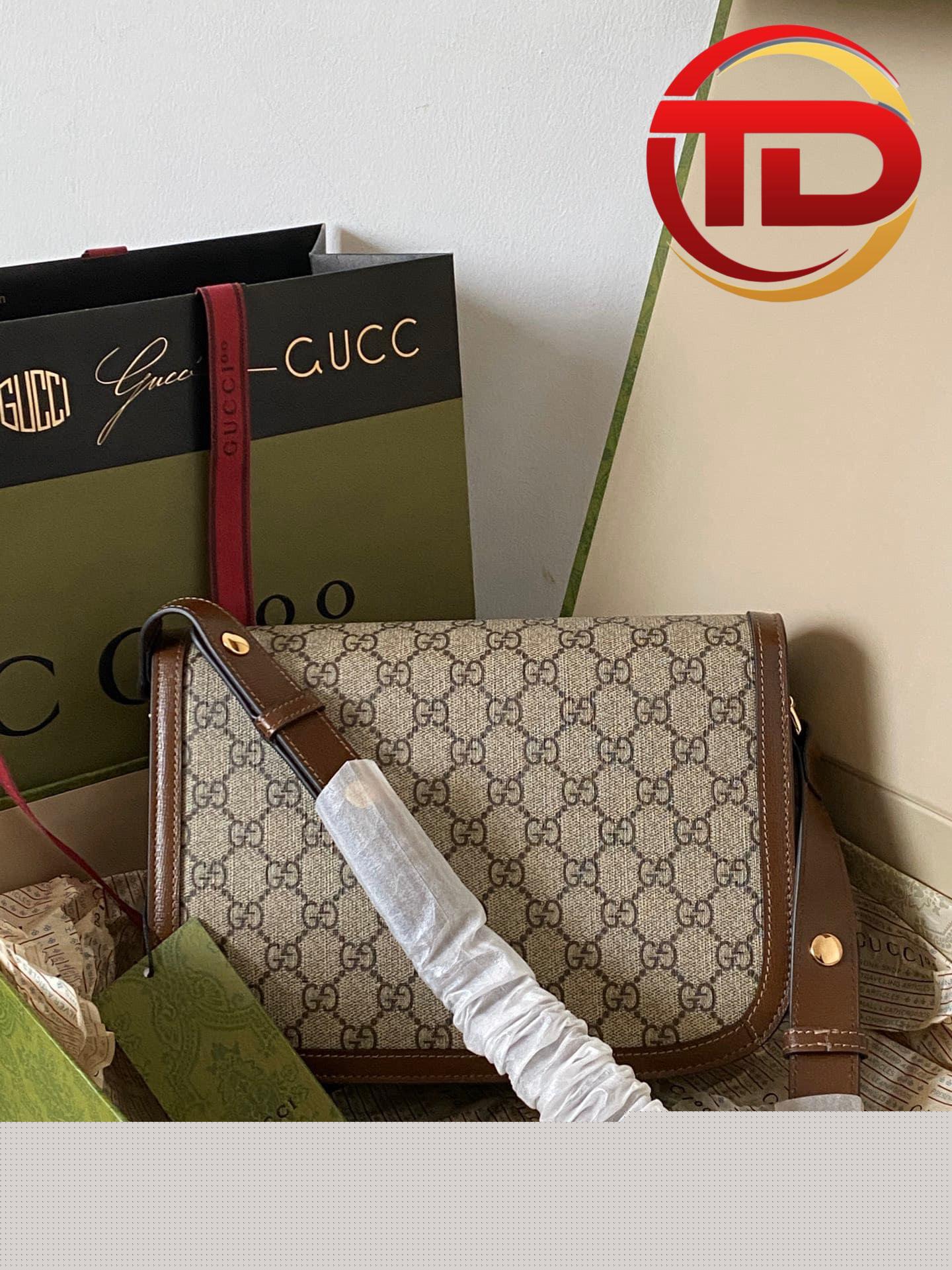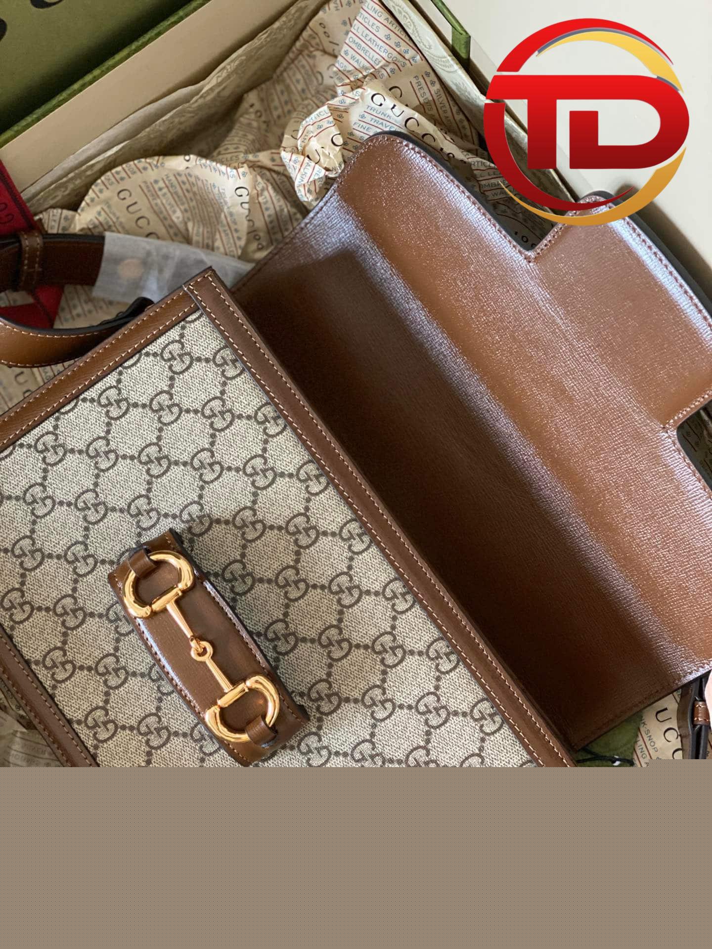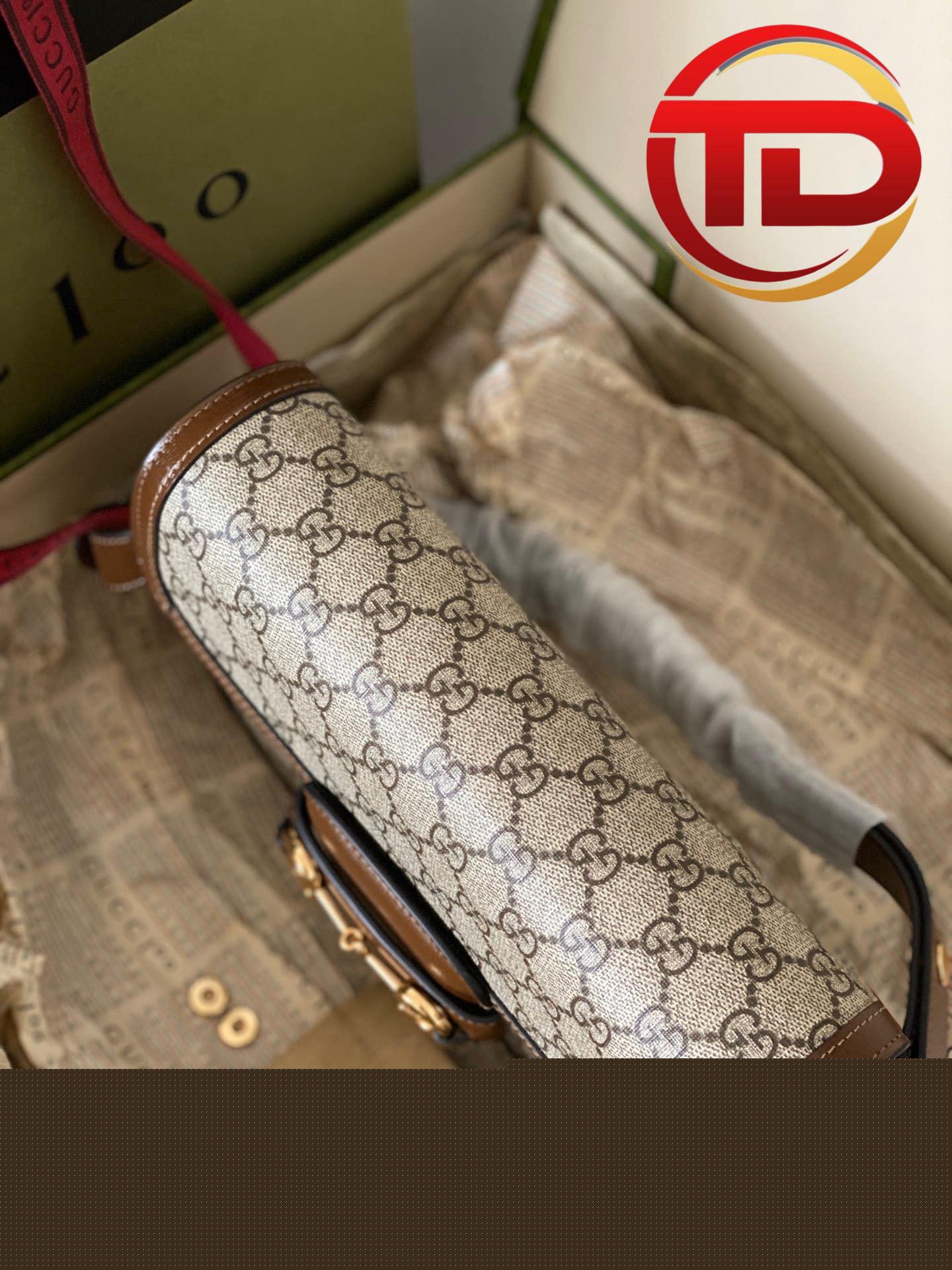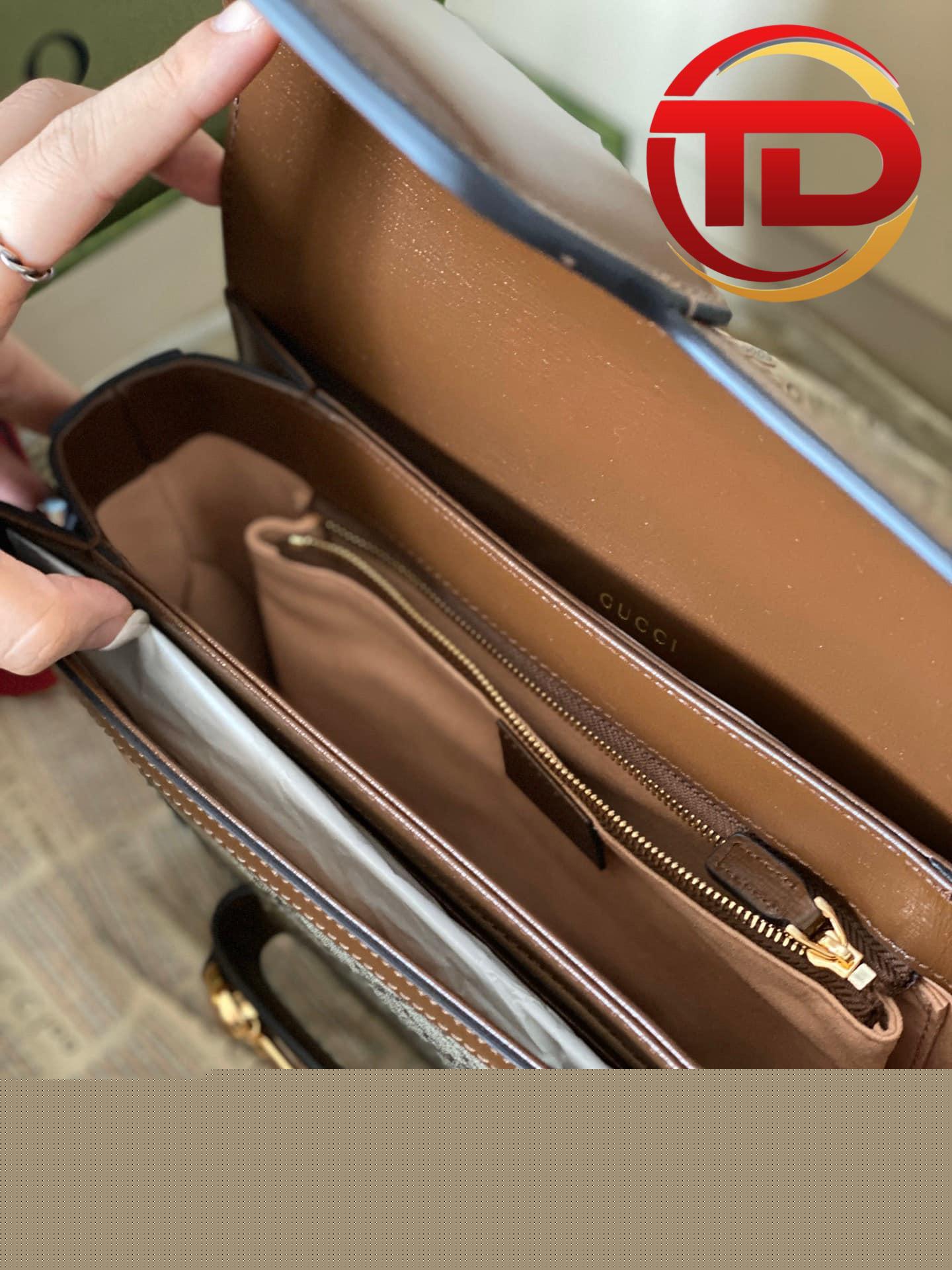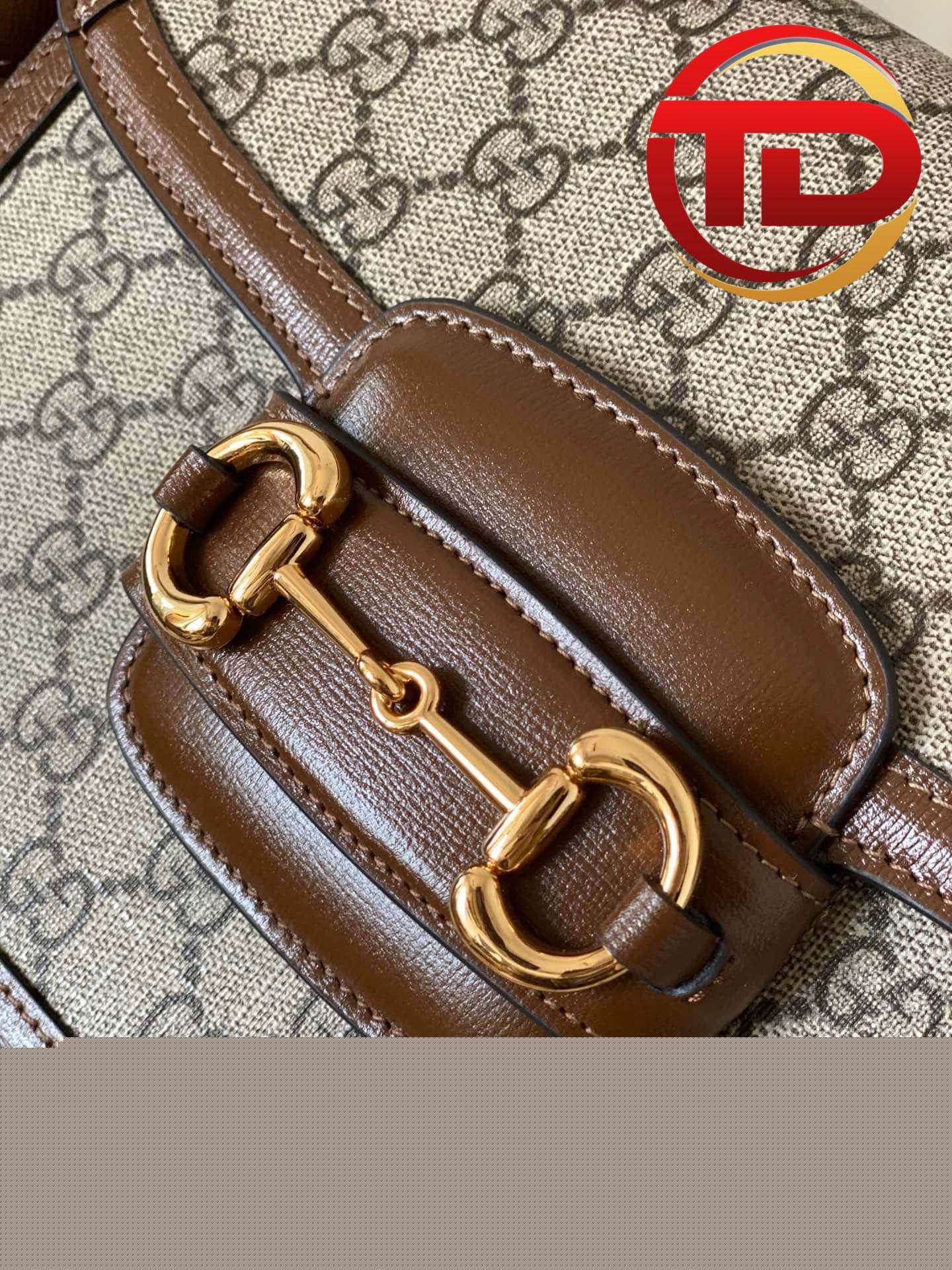 Vẫn là Gucci Horsebit 1955 nhưng phiên bản này được làm bằng vải GG canvas tinh nghịch và năng động hơn. Phom dáng vali xách tay nhỏ lạ mắt. Tay cầm và đường viền da màu nâu bao quanh viền túi tạo nên vẻ thanh lịch đậm chất Ý. Gam màu trung tính của chiếc túi này giúp bạn dễ dàng kết hợp với mọi trang phục.
