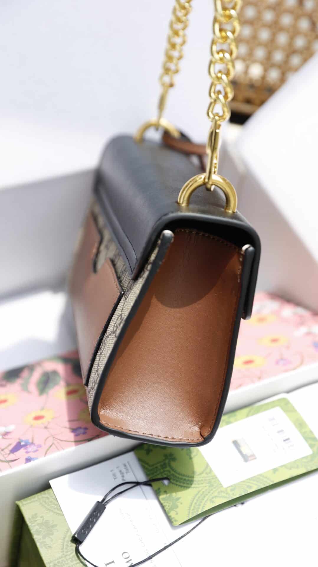 - Chất liệu da bò phối canvas monogram