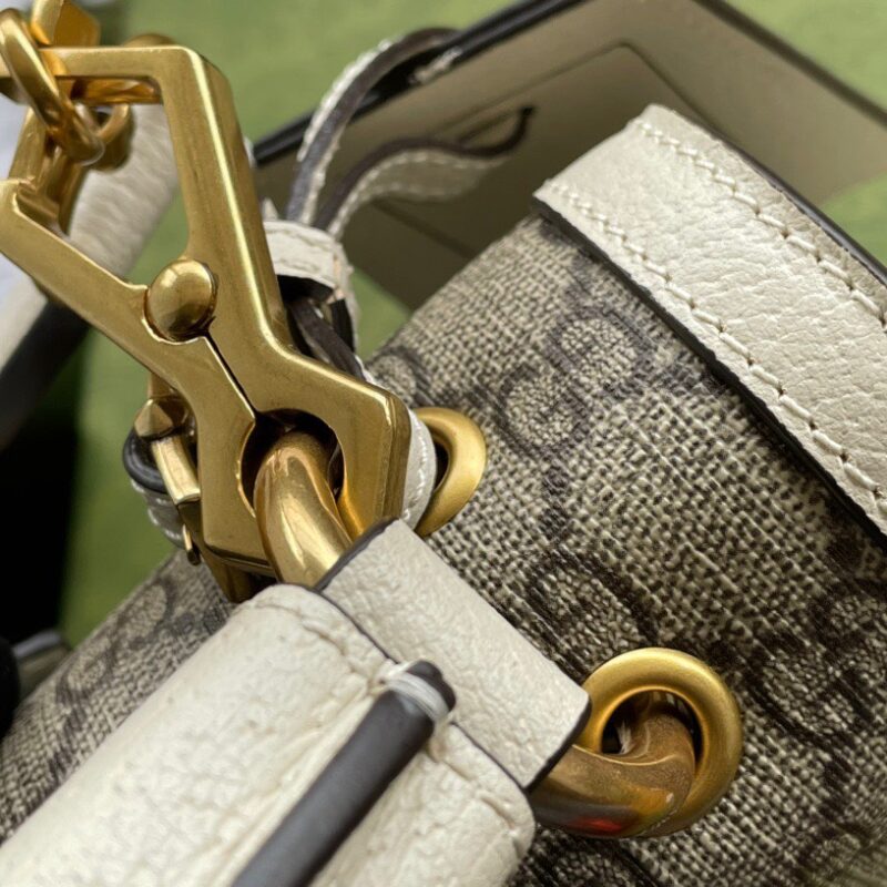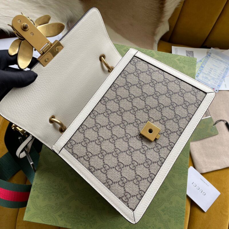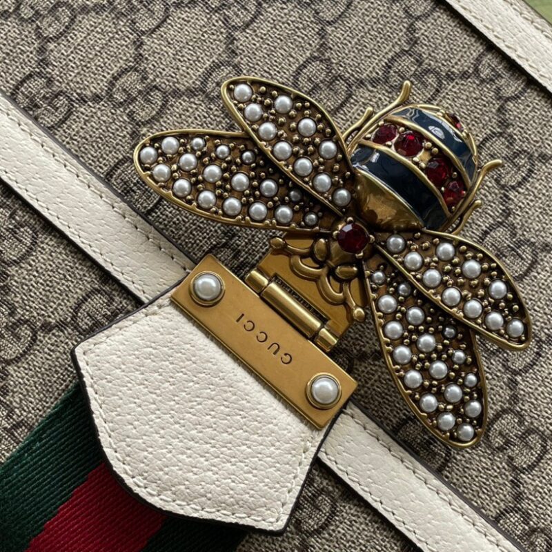 Nếu là “tín đồ” lâu năm của Gucci, bạn sẽ nhận ra ngay chất liệu canvas hoạ tiết GG được hãng khai thác từ thời Thế Chiến II. Phần khoá cài trang trí hình con ong được đính kết đá tinh xảo. Trong văn hoá châu Âu, loài ong là biểu tượng của giới quý tộc thượng lưu. Ribbon kẻ sọc xanh navy- đỏ trên quai đeo (trap) và thân túi cũng là một trong những chi tiết đặc trưng của Gucci.