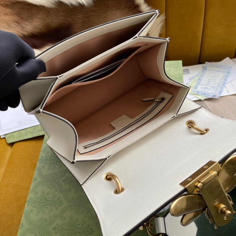 Phần quai xách (top handle) đính dập chữ ‘Blind for Love’, cùng với viền túi được làm từ da cao cấp, nhuộm đỏ vô cùng nổi bật và quyến rũ. Nội thất gồm 3 ngăn: 2 ngăn phụ, 1 ngăn chính, lót da lộn. Túi Gucci Queen Margaret có nét cổ điển, cầu kỳ và vương giả ít thấy các mẫu túi hiện đại của hãng.